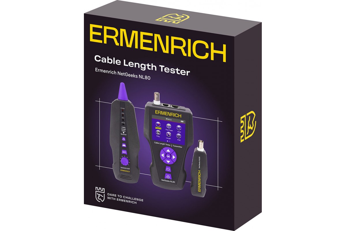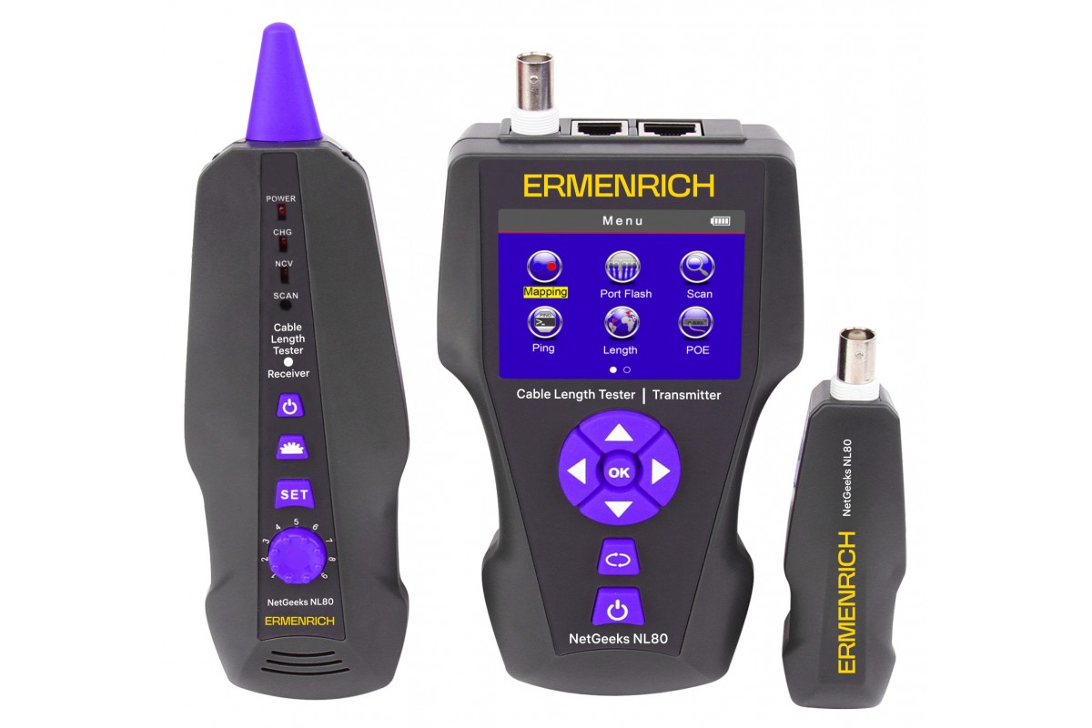 Компактный прибор для измерения длины кабелей до 1 км, а также для диагностики кабельных линий: поиска обрывов, коротких замыканий, перекрещенных, расщепленных и перевернутых пар. Позволяет не только обнаружить место обрыва или короткого замыкания, но и определить на каком расстоянии оно находится. Есть функции поиска и трассировки нужного кабеля в пучке (проблесковая индикация), определения порта, к которому подключен кабель, а также тестирования соединения Ethernet (тест PoE) и скорости передачи данных (PING-тест). Полученные данные отображаются на цветном LCD-дисплее с разрешением 320x240 пикс.