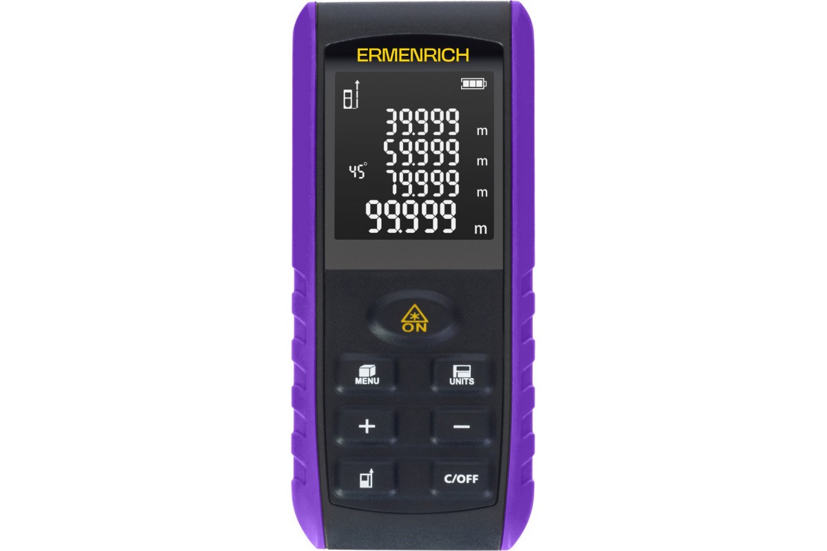 Лазерная рулетка Ermenrich Reel PRO GE100 позволяет не только измерять расстояние в пределах 100 метров, но также точно определять объем, площадь, измерять углы. Эргономичный корпус и удобное кнопочное управление в сочетании с функциональностью делают рулетку хорошим вариантом для инженеров, строителей и специалистов других профессий.