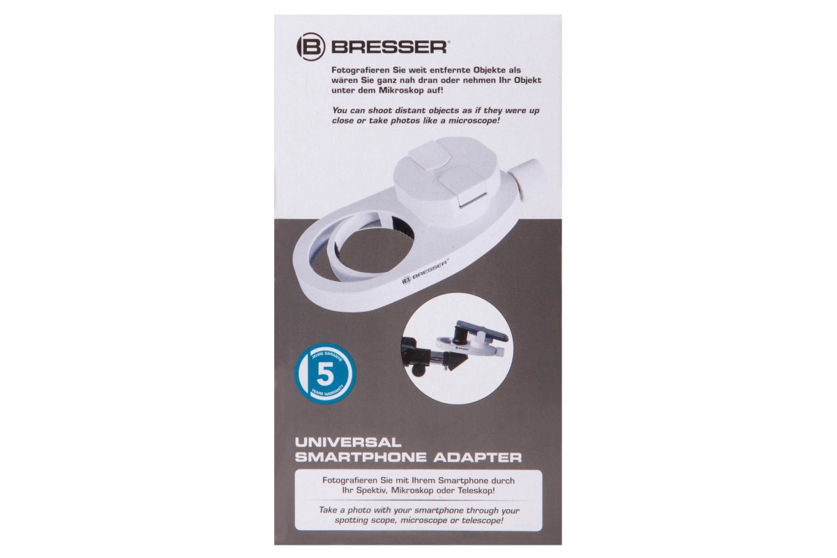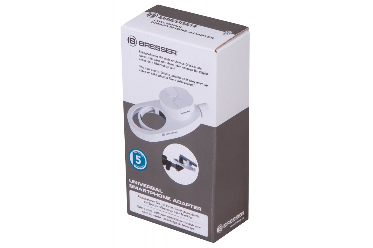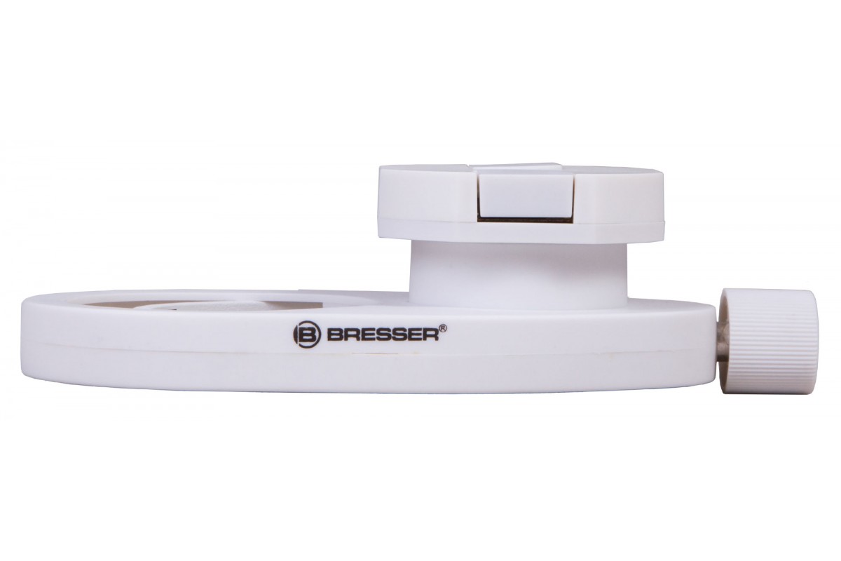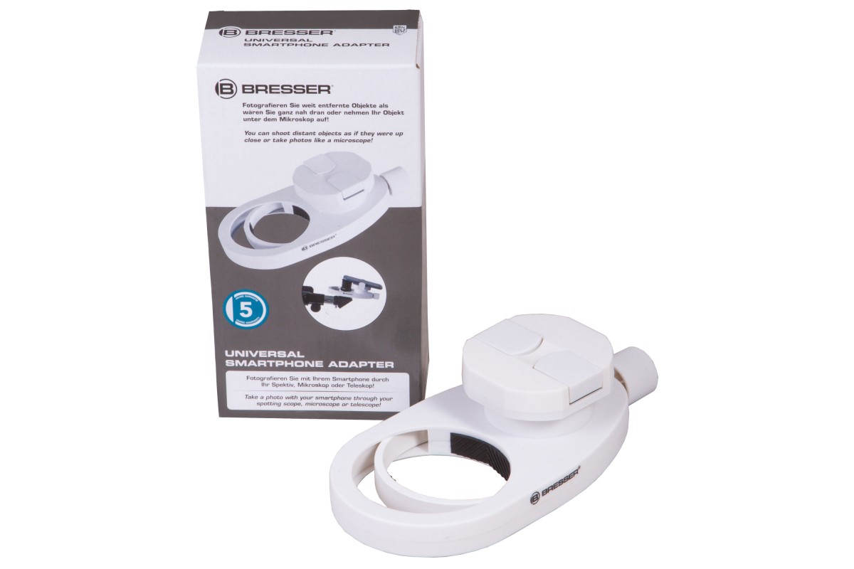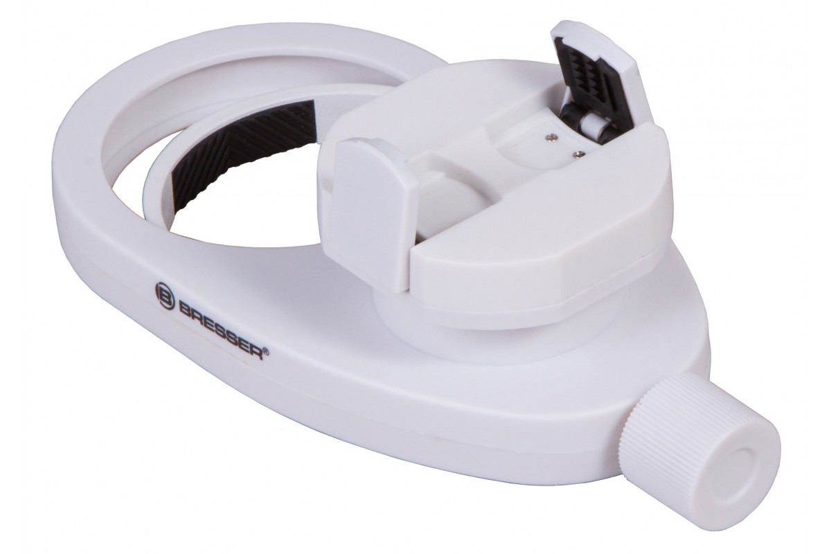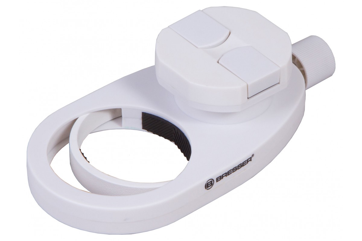Этот адаптер Bresser разработан специально для крепления смартфона на разной оптической технике – зрительных трубах, микроскопах и телескопах. Он фиксируется на держателе окуляра и дает возможность расположить камеру мобильного устройства точно над окуляром. Использование адаптера позволяет заниматься фото- и видеосъемкой микромира, космоса и окружающего мира без приобретения дорогостоящей цифровой камеры.