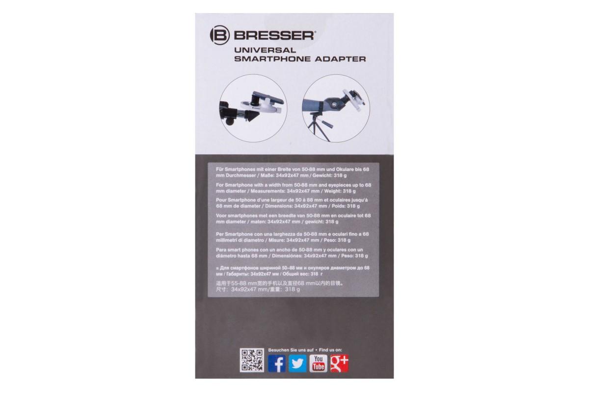 Адаптер для смартфона Bresser можно использовать с оптической техникой и смартфонами любых брендов. Есть лишь ограничения по размерам: диаметр окуляра не должен превышать 68 мм, ширина смартфона – 88 мм.