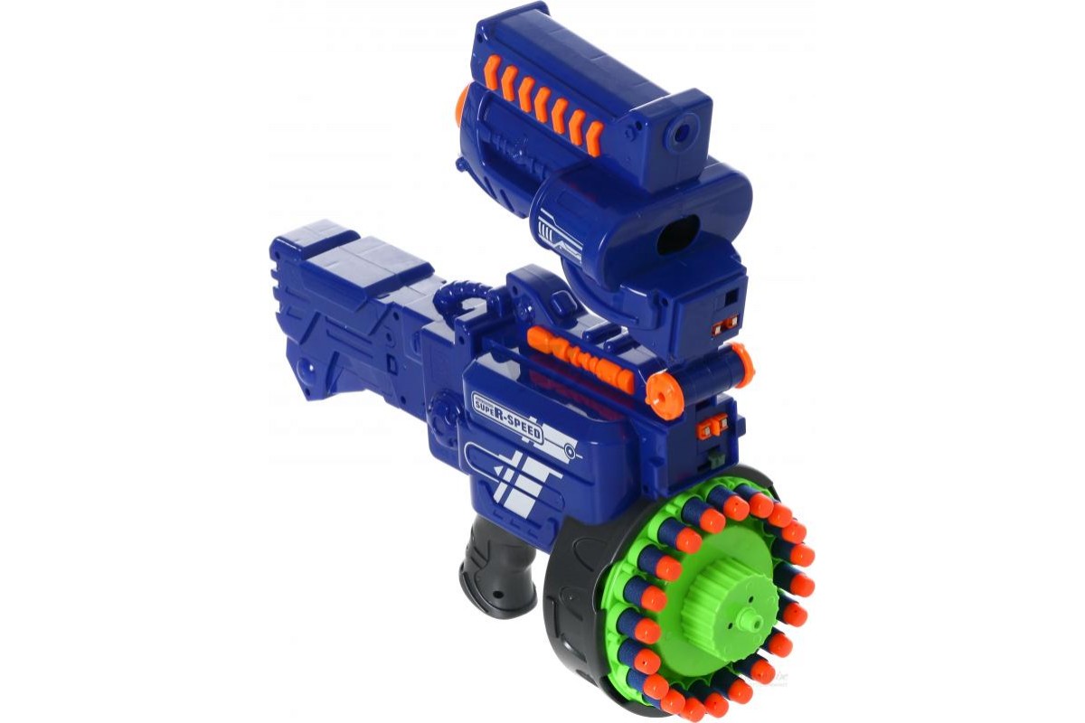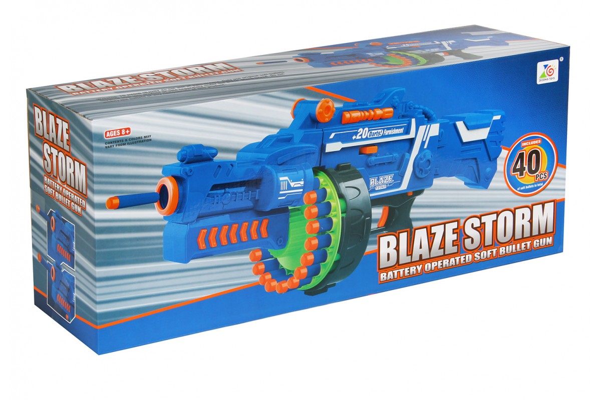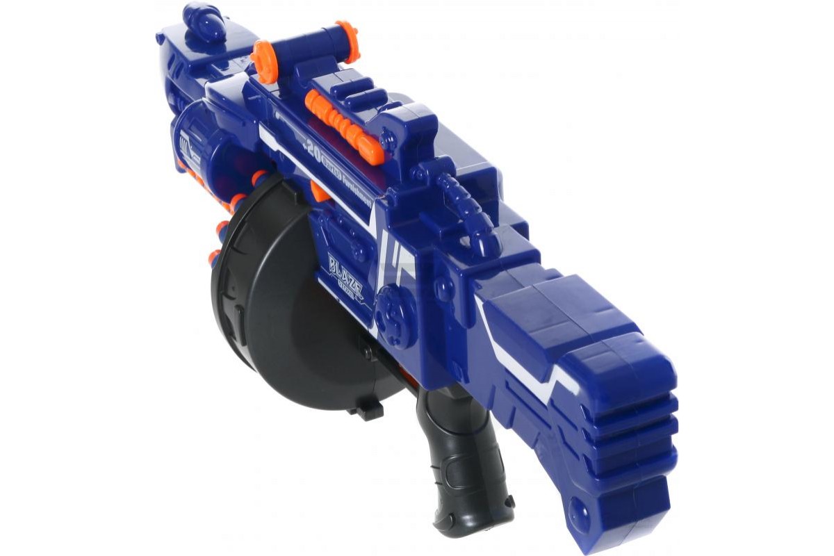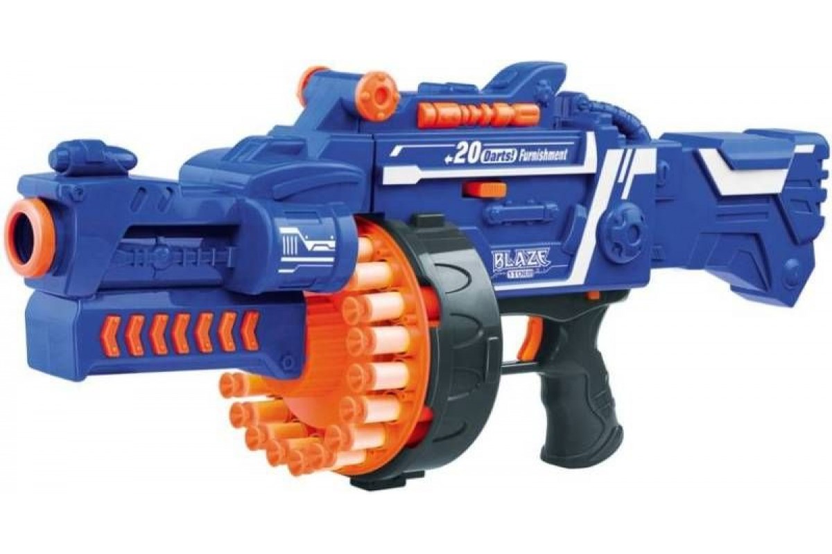 Игрушечный бластер пулемет Blaze Storm 7050 представляется собой мощное оружие, вращается револьверный магазин которого вмещает в себя целых 20 патронов. Боекомплект включает в себя двадцать снарядов из вспененного полимера и двадцать - с присосками. При нажатии на спусковой крючок происходит выстрел, а затем барабан бластера автоматически делает поворот, перемещая следующий патрон для выстрела и так 20 раз. Работает детское оружие от 5 батареек типа АА которые не входят в комплект.