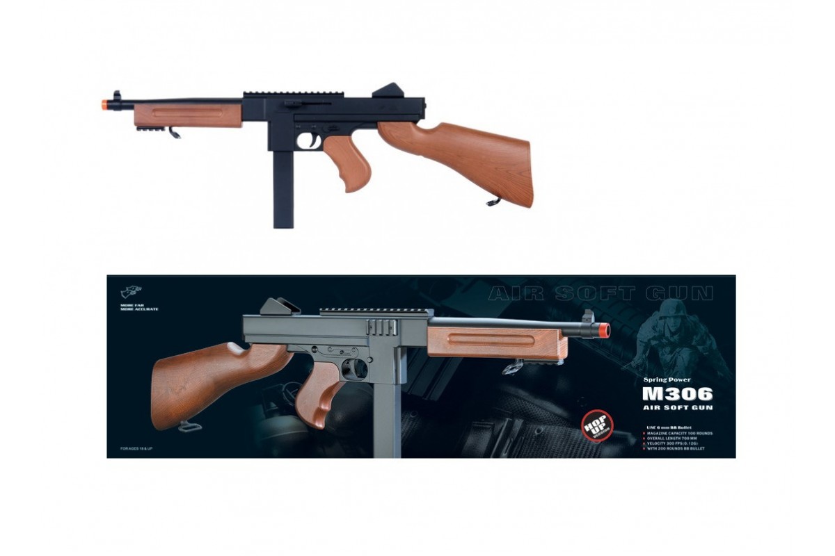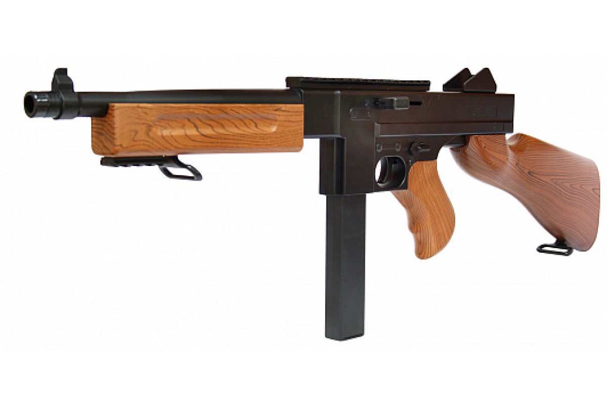 Автомат-пулемет Томпсона с пружинным механизмом (70 см, пневматика) - M306F - это копия знаменитого американского автомата (пистолет-пулемет) Томпсона разработанный в 1920 году и активно применявшийся во время Второй мировой войны. Приклад, цевье и рукоятка у автомата - пластиковые с имитацией дерева. На корпусе имеется множество планок Пикатинни которые можно по желанию снять. Магазин в автомате бункерного типа в который помещается 100 шариков. В комплекте так же Вы найдете шомпол и ремень для переноски.