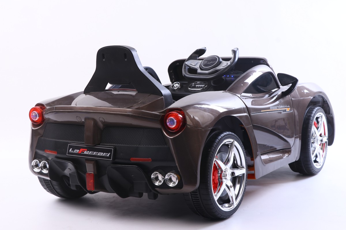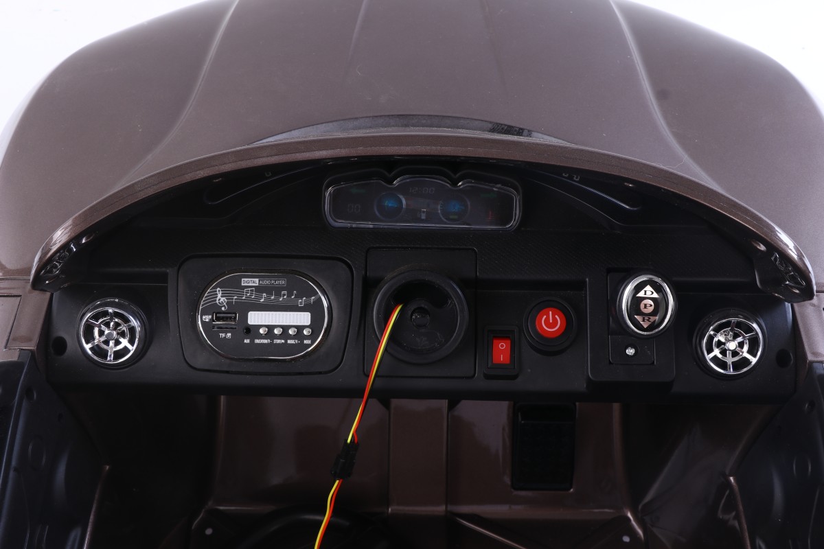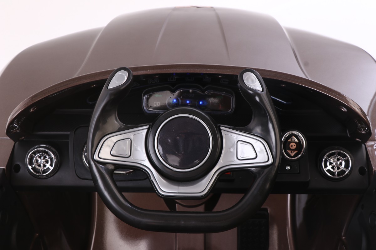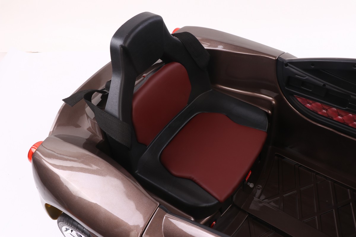 >для детей от 3 лет, одноместная - аккумулятор: 12V/7Ah - моторы 2 х 20W - макс нагрузка: 30 кг - задние амортизаторы - режим качалки - резиновые колеса EVA - макс скорость: 6 км/ч - одна скорость вперёд, одна скорость движения назад - педаль газа - заводится с кнопки - индикатор заряда батареи - кожаное сиденье с ремнём безопасности (5-ти точечный) - удобный руль (клаксон, музыкальные эффекты) - музыкальные эффекты на приборной панели - разъем для подключения USB, AUX, Bluetooth - светодиодные огни передних и задних фонарей - перемещение по принципу чемодан - в комплекте: аккумулятор, зарядное устройство, пульт дистанционного управления (работает по Bluetooth, радиус действия до 30 метров) гарантия: 6 месяцев
