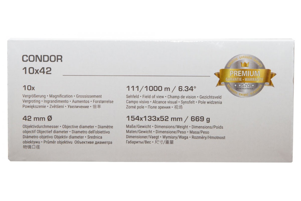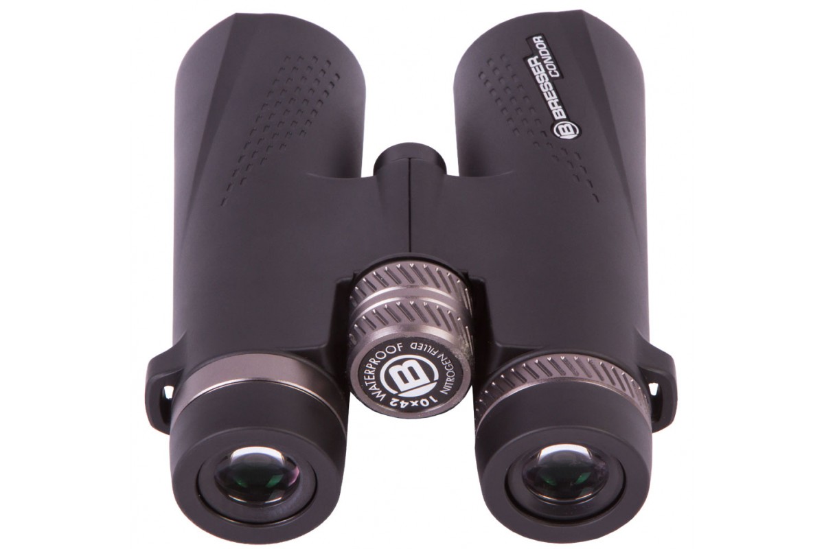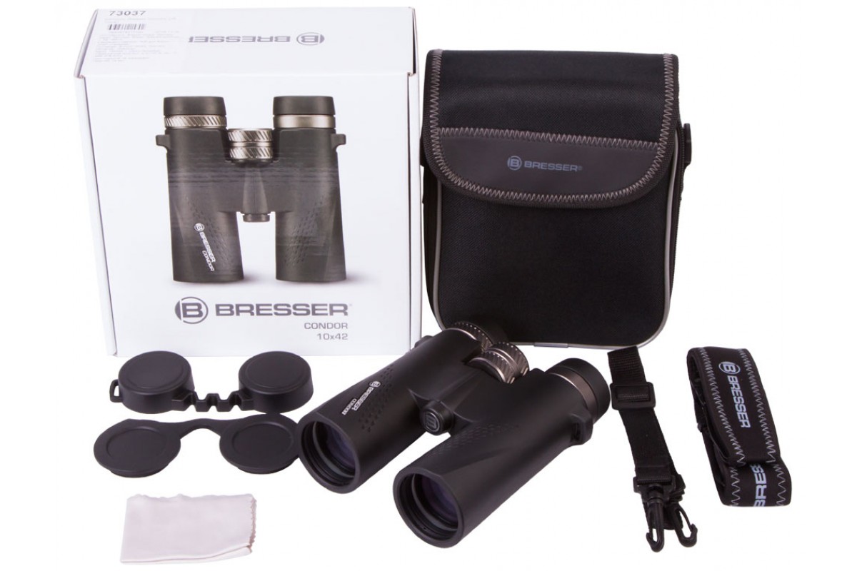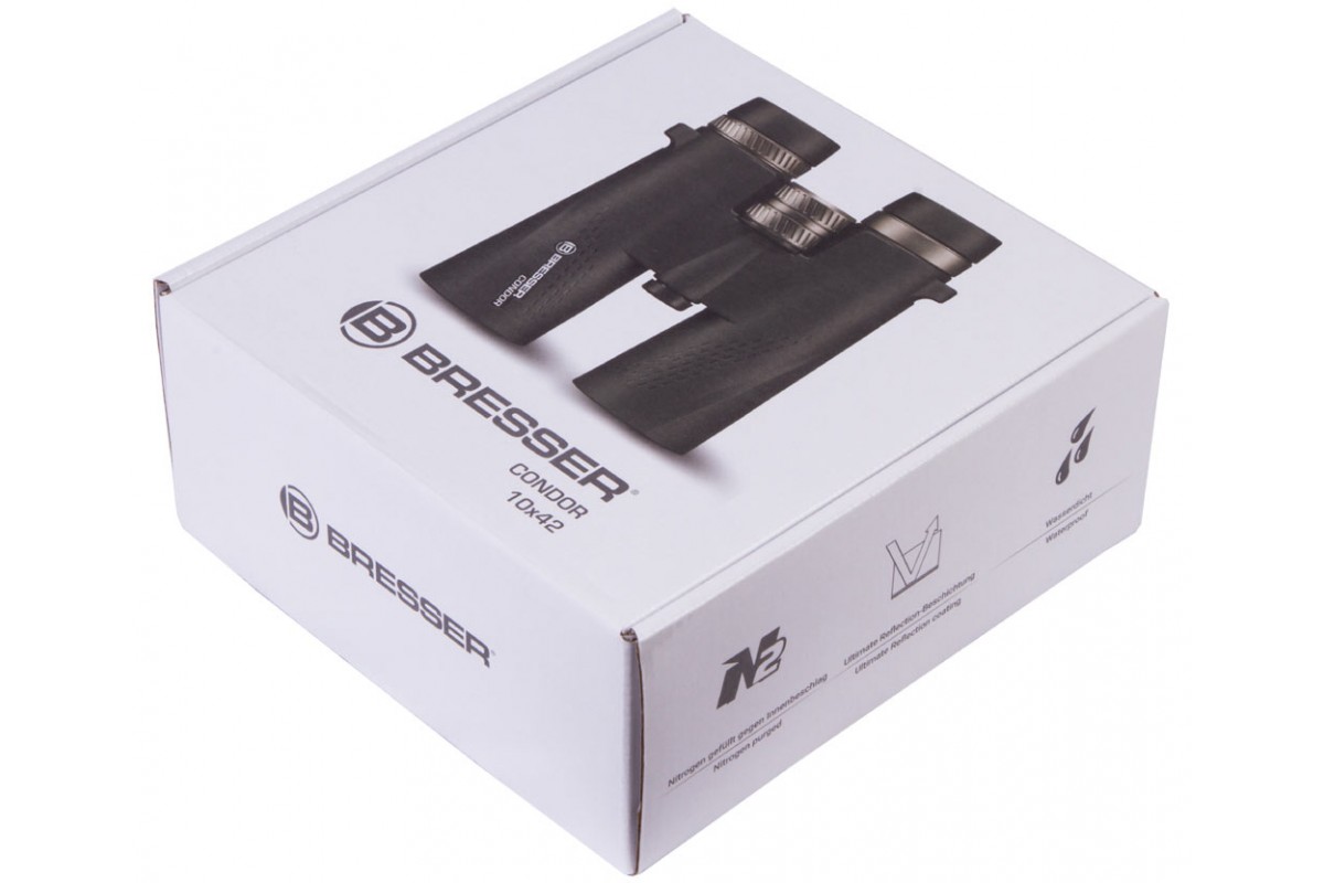 Оптические элементы помещены в ударопрочный корпус, покрытый нескользящей резиной. Корпус не пропускает воду, частицы пыли и грязи. Внутреннее пространство бинокля полностью заполнено инертным газом, который защищает линзы от выпадения конденсата и запотевания. Bresser Condor UR 10x42 способен выдержать любые испытания!