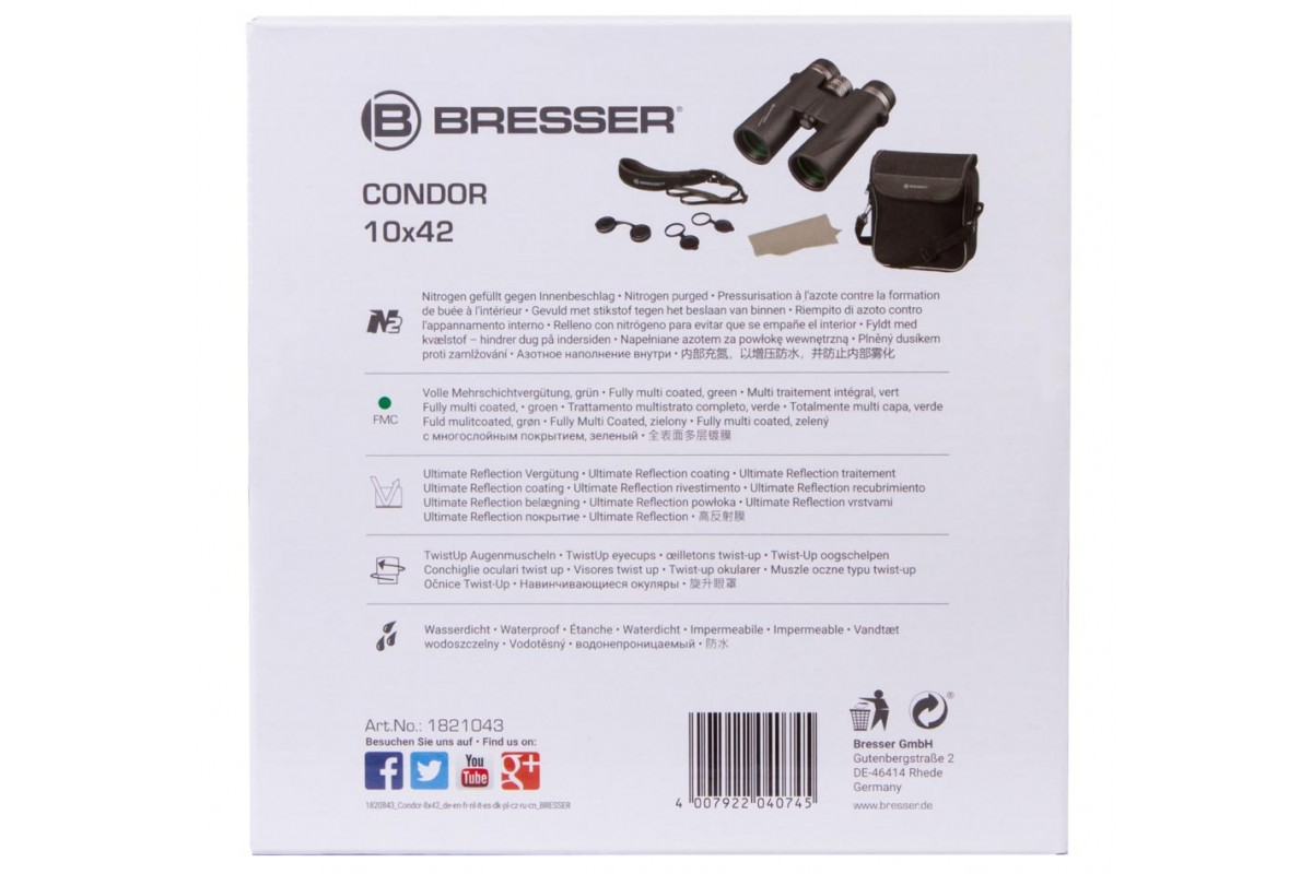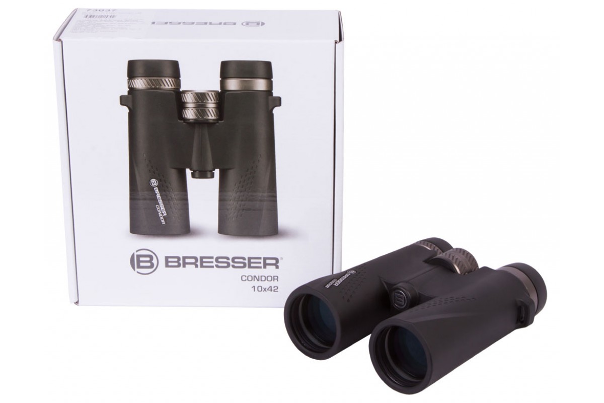 Bresser Condor UR 10x42 – полевой бинокль, который можно использовать при любой погоде. Он защищен от проникновения воды, и его линзы не запотевают при резком изменении температуры. Бинокль передает картинку высокого качества, хорошо собирает свет и позволяет вести наблюдения даже при слабой освещенности. Bresser Condor UR 10x42 – отличный выбор для охотника, рыбака, любителя походов.