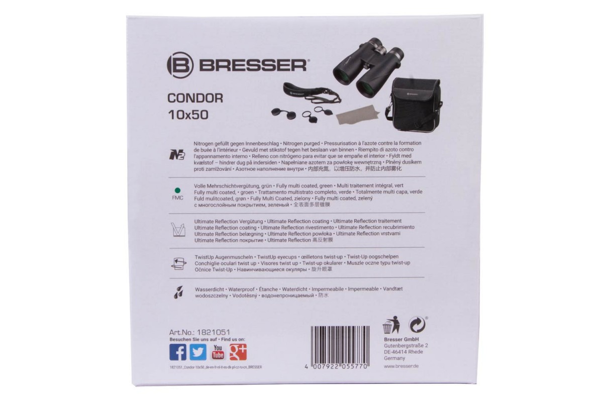 Bresser Condor UR 10x50 – полевой бинокль, которому не страшны ни дождь, ни снег, ни мороз. Он станет настоящей находкой для охотника, рыбака, натуралиста, любителя походов и активного отдыха на природе. Бинокль гармонично сочетает в себе прекрасные оптические возможности, неприхотливую конструкцию и надежную механику.