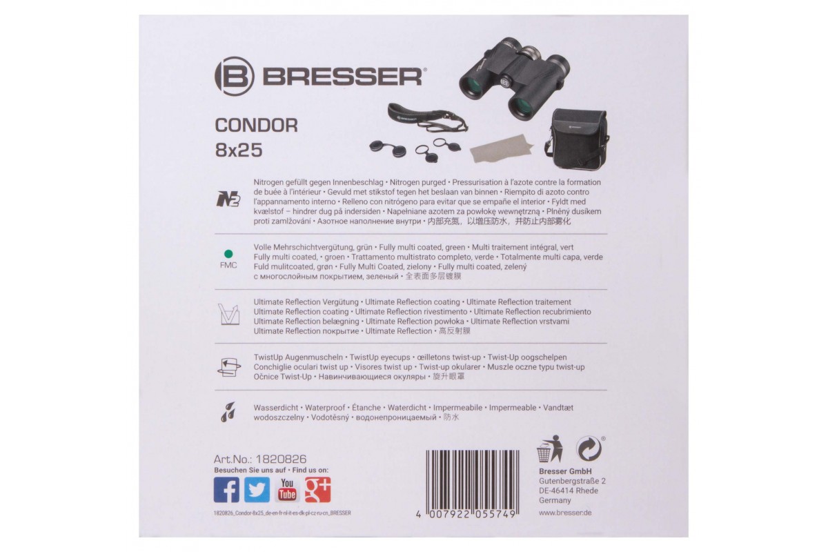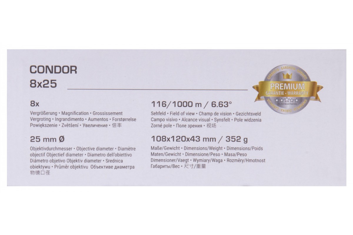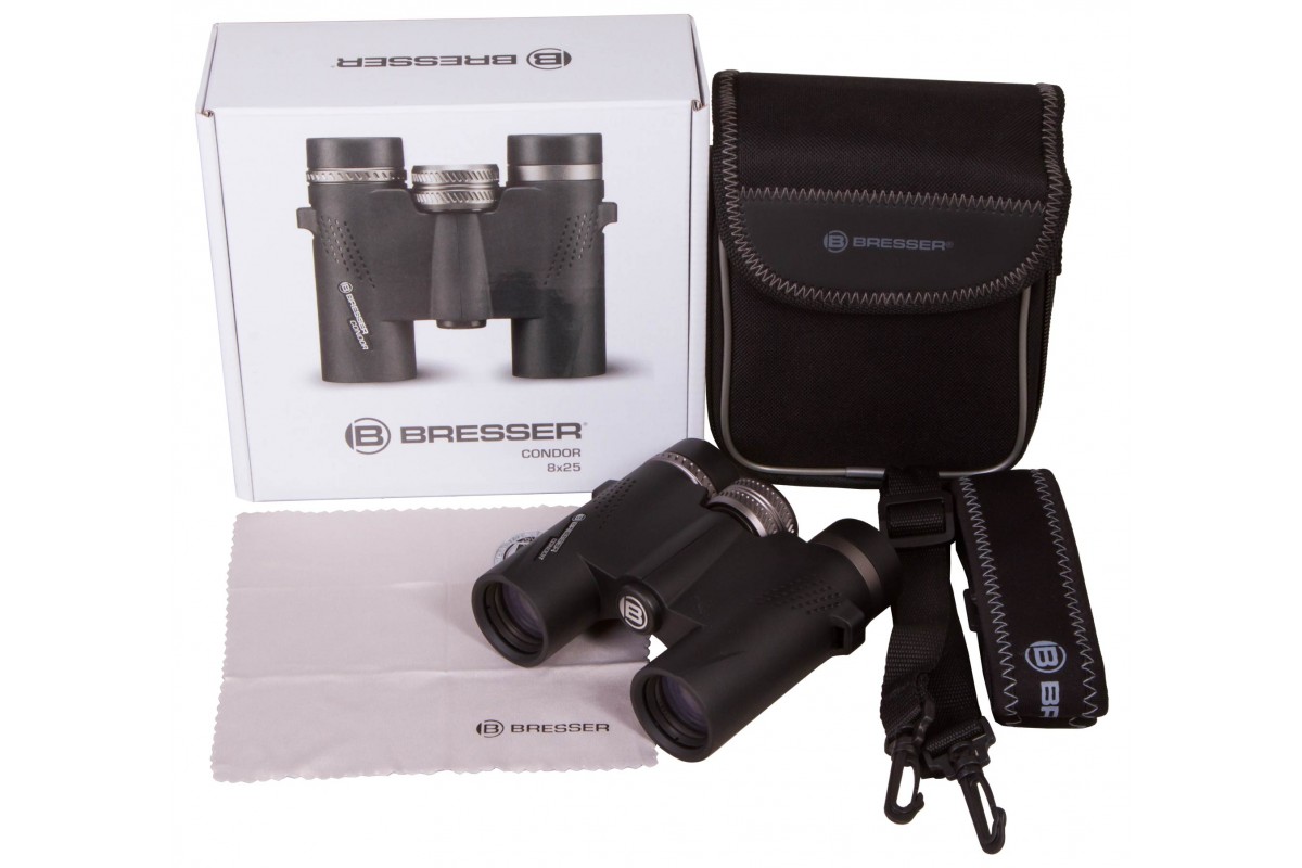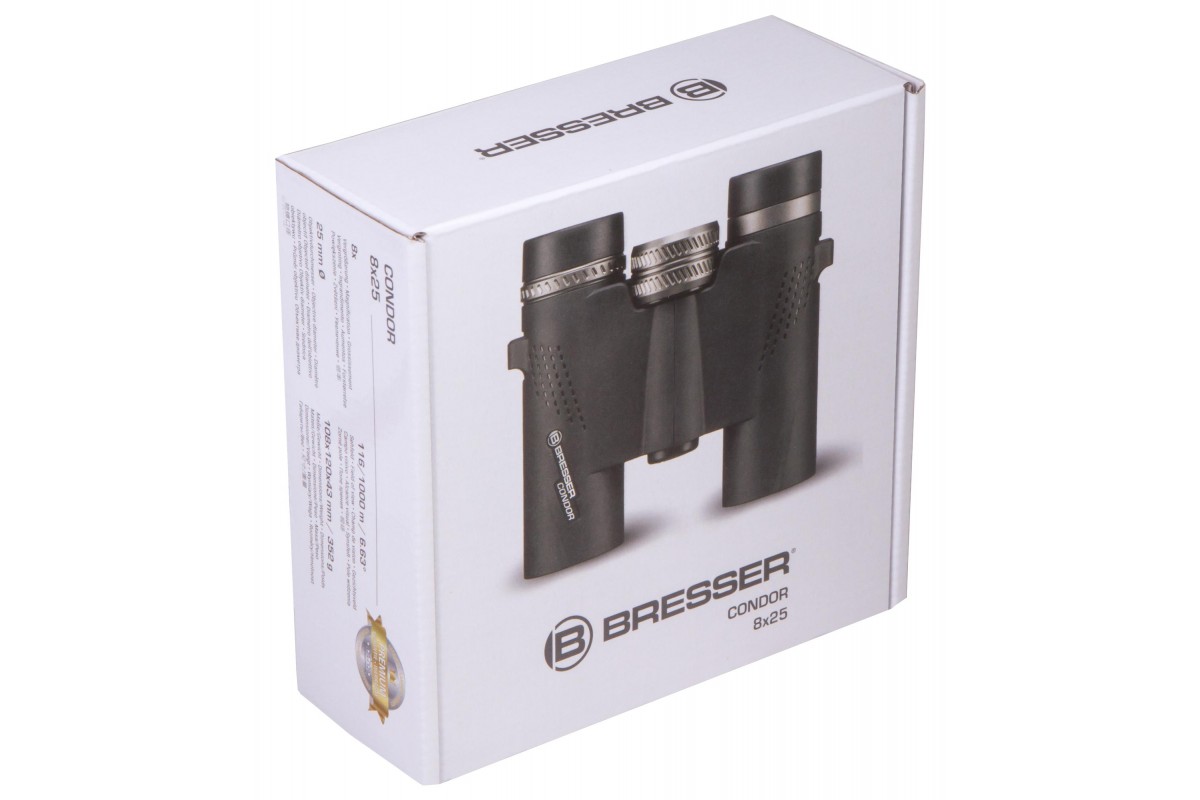 В бинокле используются roof-призмы и оптика из стеклянных элементов. Передаваемая картинка радует четкостью деталей и естественными цветами. На 8-кратном увеличении можно различать множество нюансов на удаленных объектах. Оптика защищена водонепроницаемым корпусом, заполненным инертным газом. Бинокль Bresser Condor UR 8x25 не пропускает воду, частицы пыли и грязи, а его линзы не запотевают при резком изменении температуры.