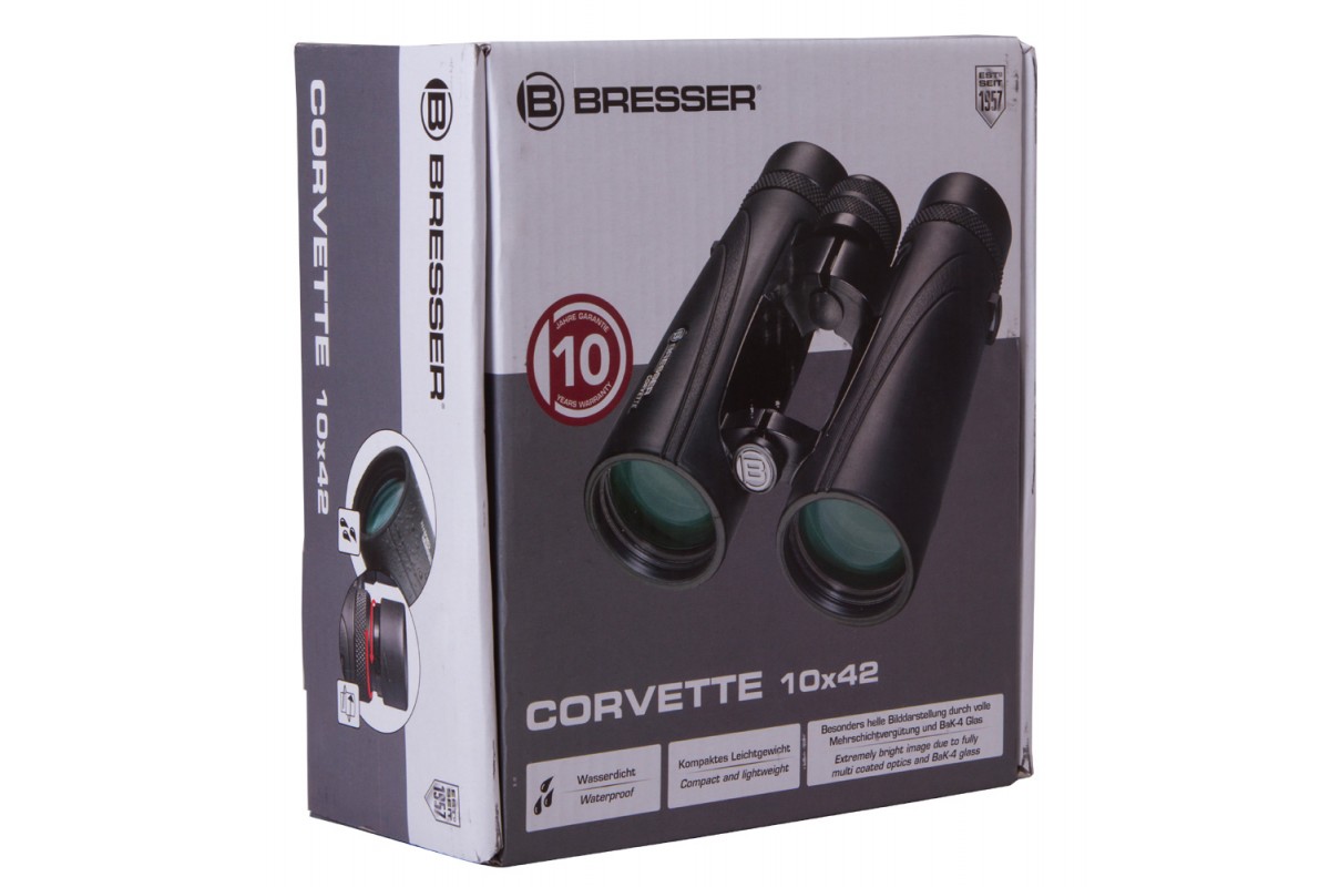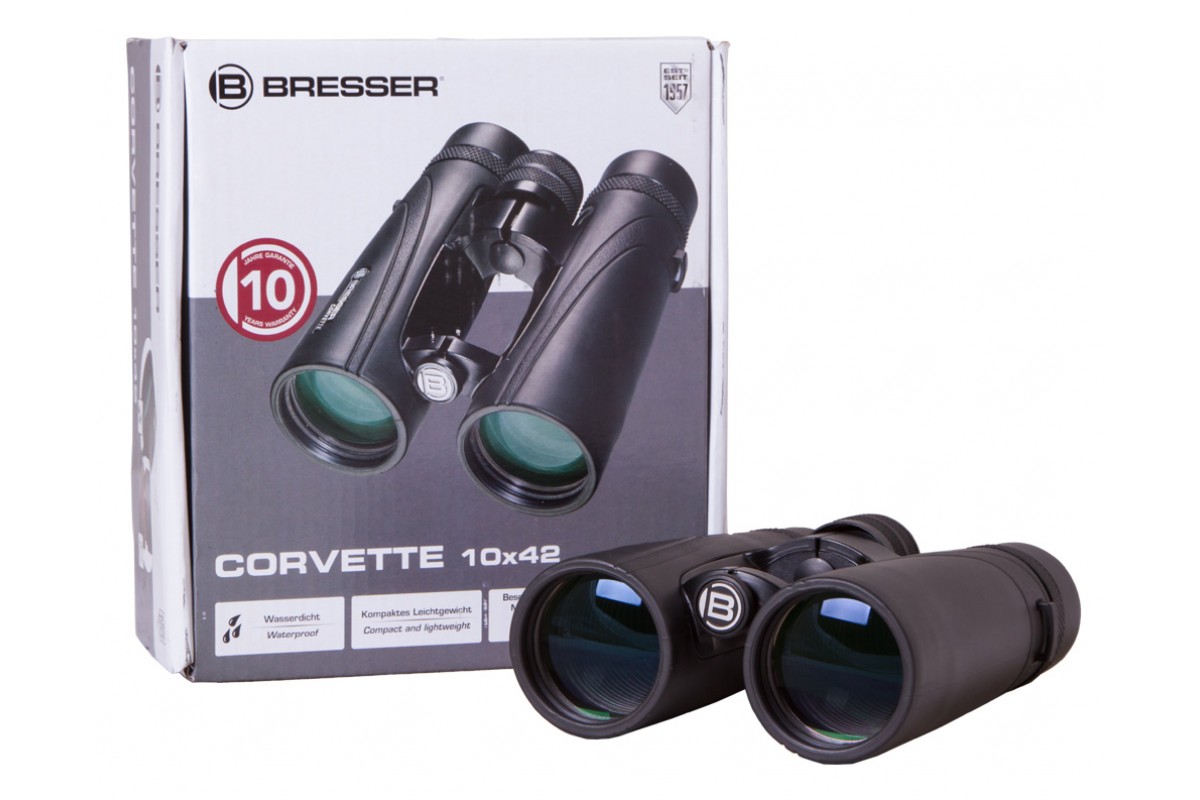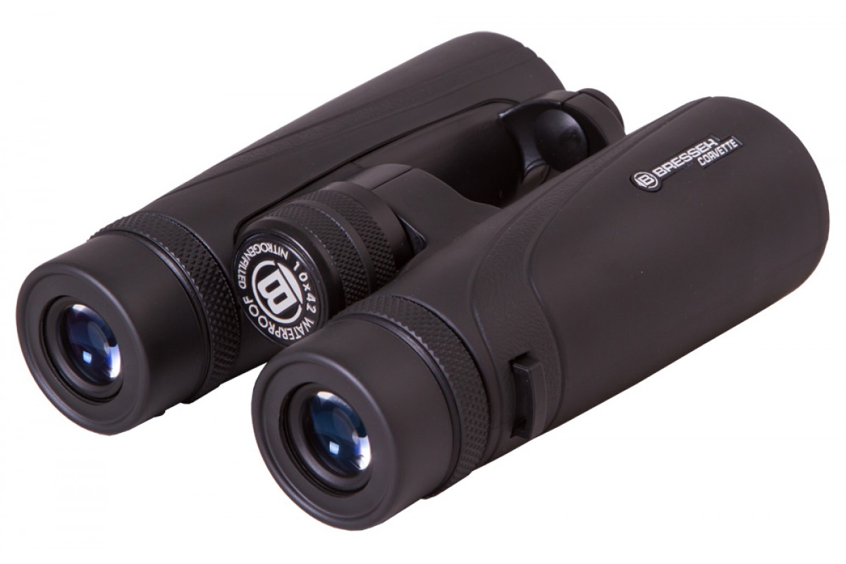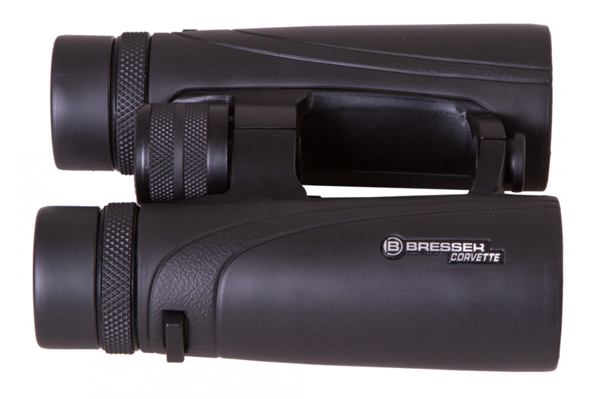 Корпус бинокля сделан из металла и защищает оптику от случайных повреждений. Снаружи корпус покрыт нескользящей резиной, которая улучшает захват. Полости бинокля внутри заполнены азотом, который не дает оптике запотевать при перепадах температуры. Bresser Corvette X 10x42 подходит для наблюдений в дождливую и морозную погоду.