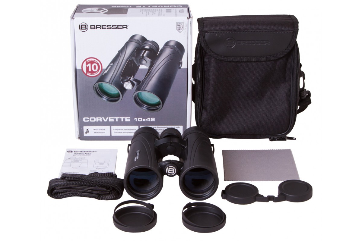 В Bresser Corvette X 10x42 есть все необходимое для индивидуальной настройки под пользователя: регулировка расстояния между зрачками, коррекция диоптрий на окулярах, поворотно-выдвижные наглазники для наблюдений в очках. Бинокль комплектуется защитными крышками для окуляров и объективов.