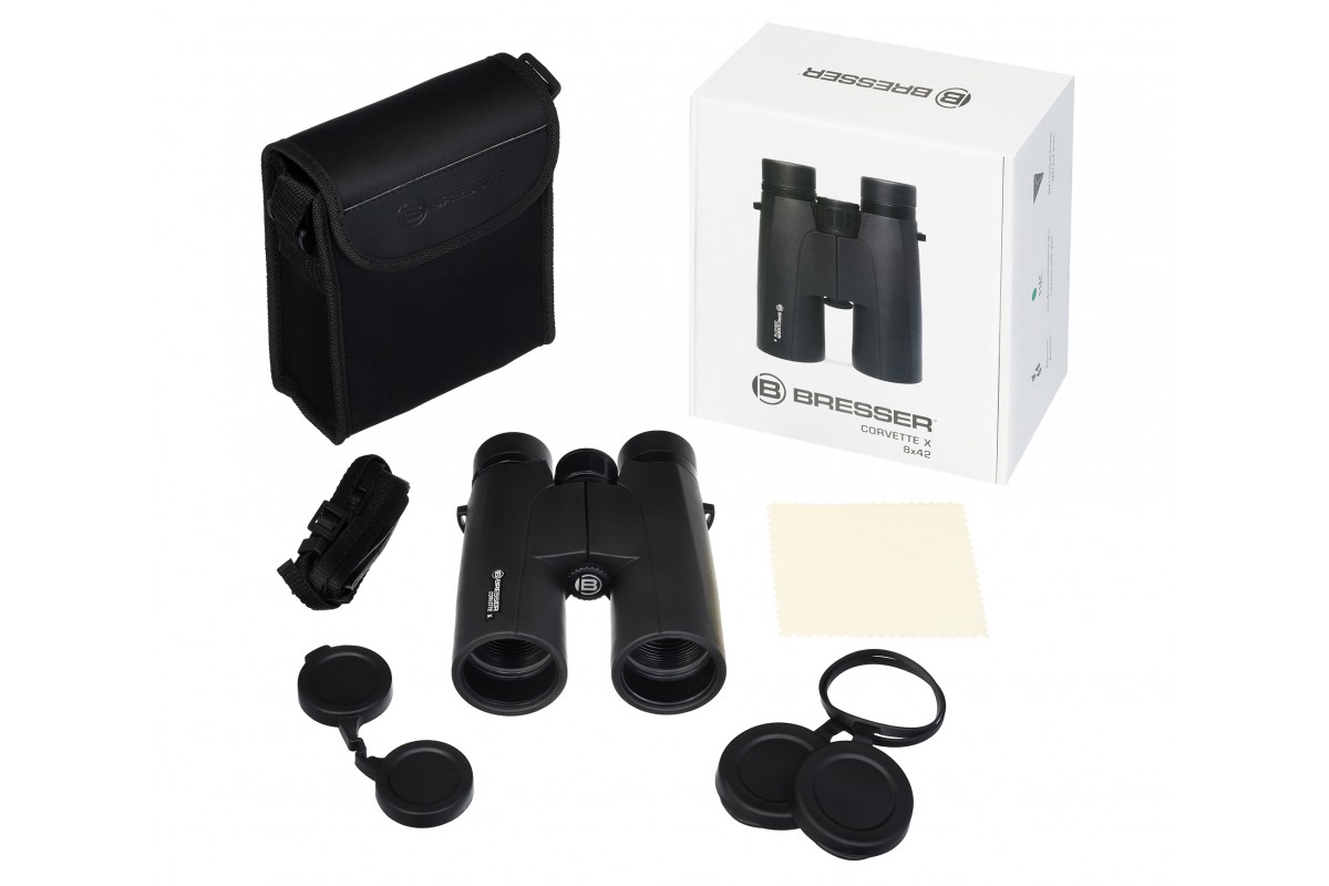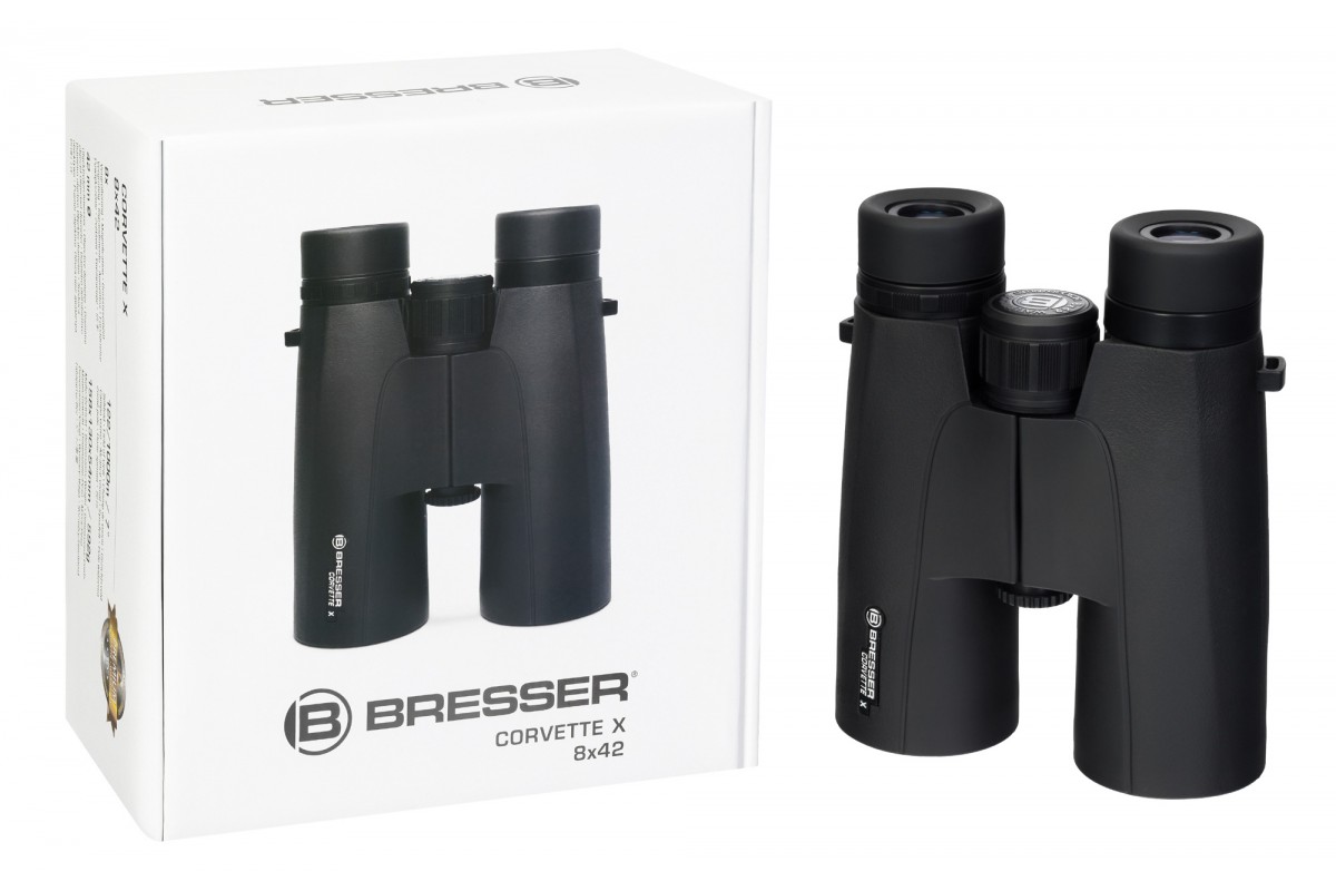 С биноклем Bresser Corvette X 8x42 WP удобно вести как прицельные, так и обзорные наблюдения, так как он обладает очень сбалансированной по возможностям оптикой: увеличение составляет 8 крат, а ширина обзора достигает 122 метров на удалении 1000 метров. Прибор водозащищен, может быть установлен на штатив, имеет все необходимые настройки для адаптации под любого пользователя, в том числе тех, кто носит очки. Возможности бинокля идеально подойдут для охотников, походников, натуралистов и рыбаков.