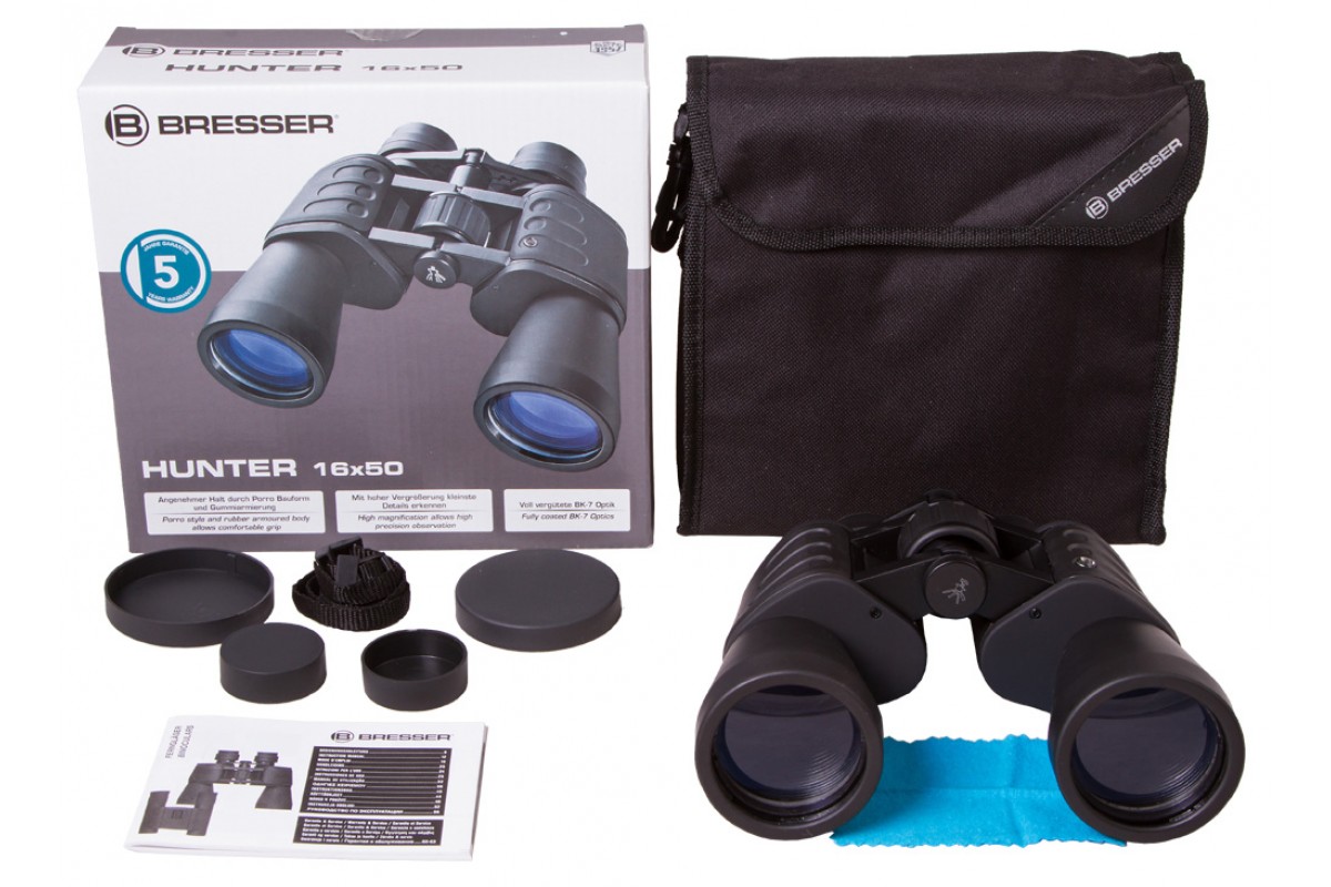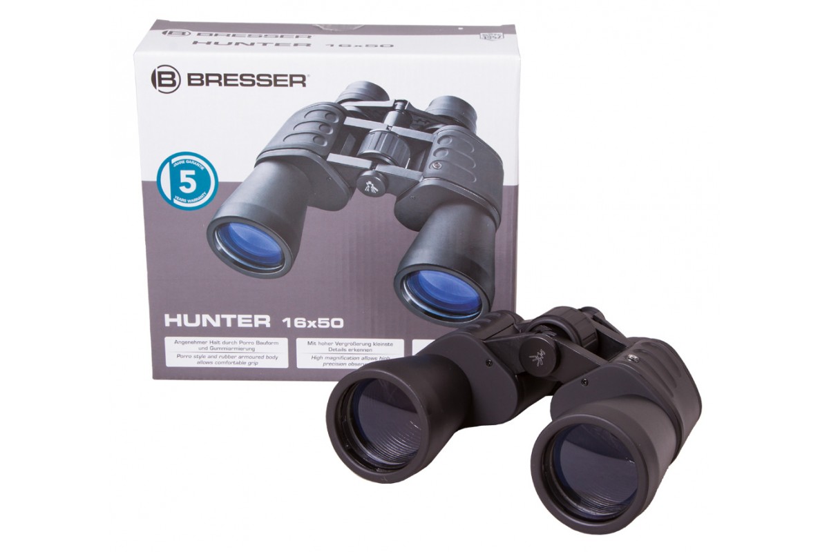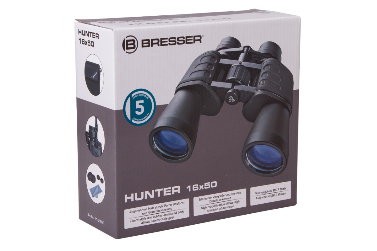 Бинокль Bresser Hunter 16x50 с большим увеличением и значительной светосилой отлично подходит для наблюдений удаленных объектов в условиях плохой освещенности. Хороший выбор для охотников и активных туристов. Бинокль основан на оптической системе призм Porro, его линзы изготовлены из оптического стекла BK-7 с многослойным просветляющим покрытием. Увеличение 16 крат и диаметр объективов 50 мм позволяют применять бинокль даже для наблюдения Луны. Минимальное фокусное расстояние составляет 7 м. Прибор позволяет изменять межзрачковое расстояние, корректировать диоптрийную настройку окуляров. Имеется система центральной фокусировки. В комплект входят адаптер для штатива и чехол для хранения и переноски бинокля.
