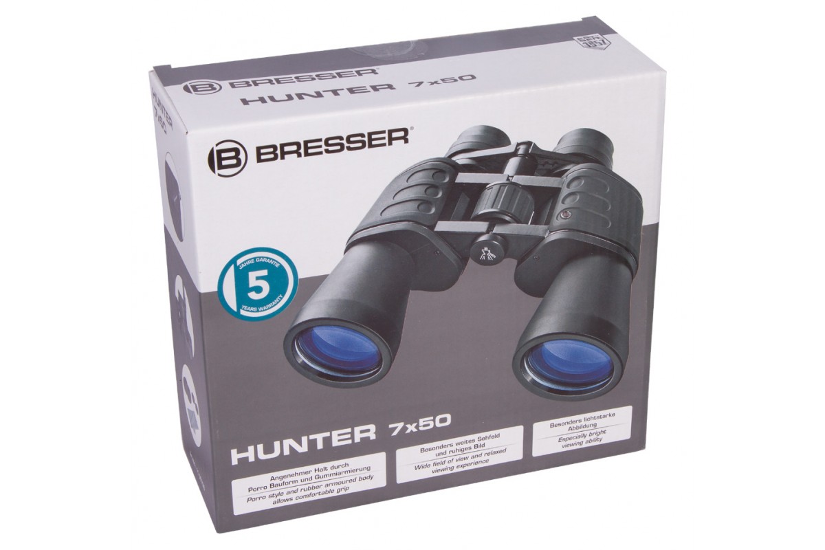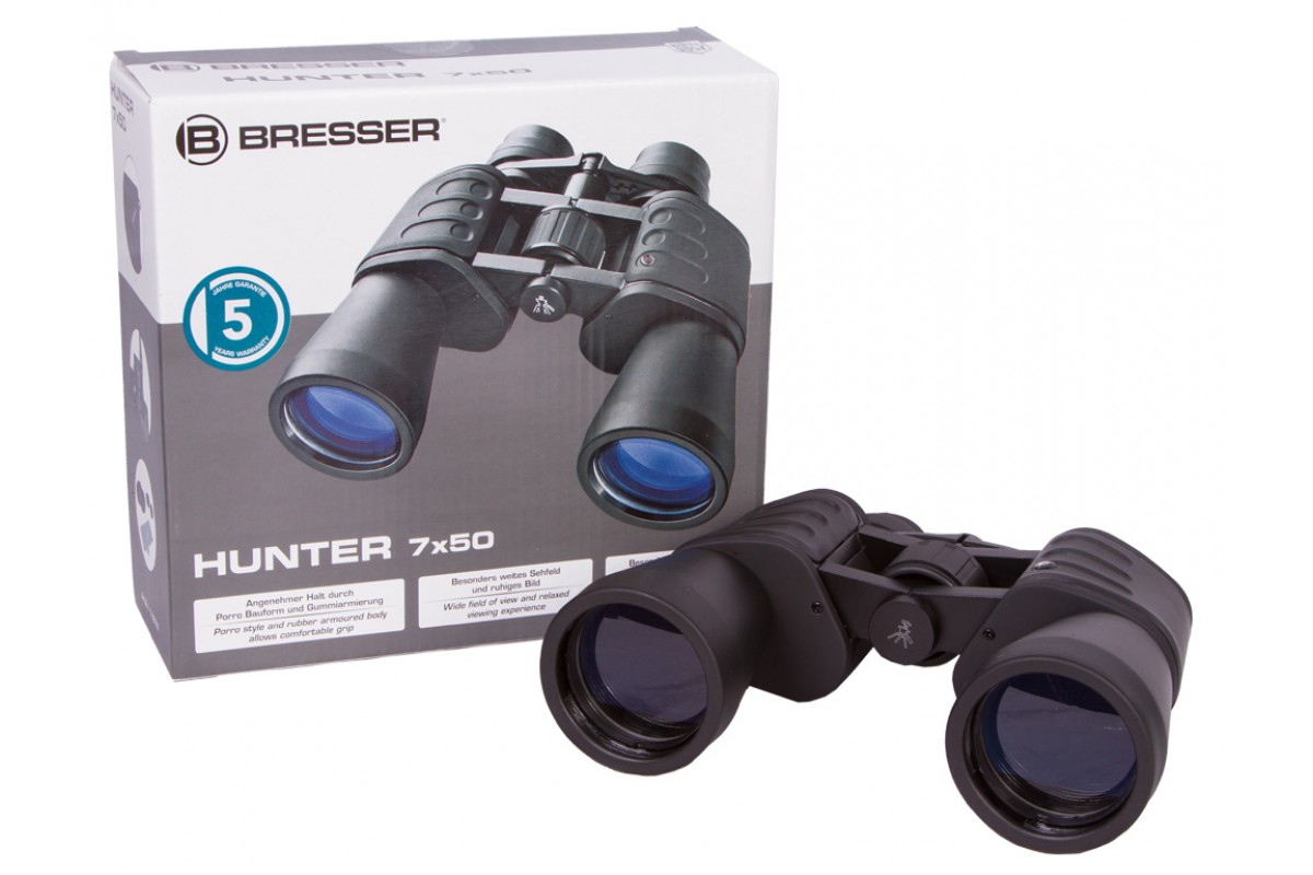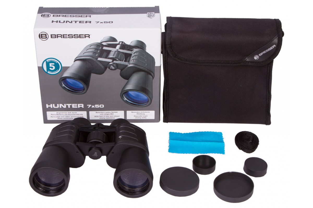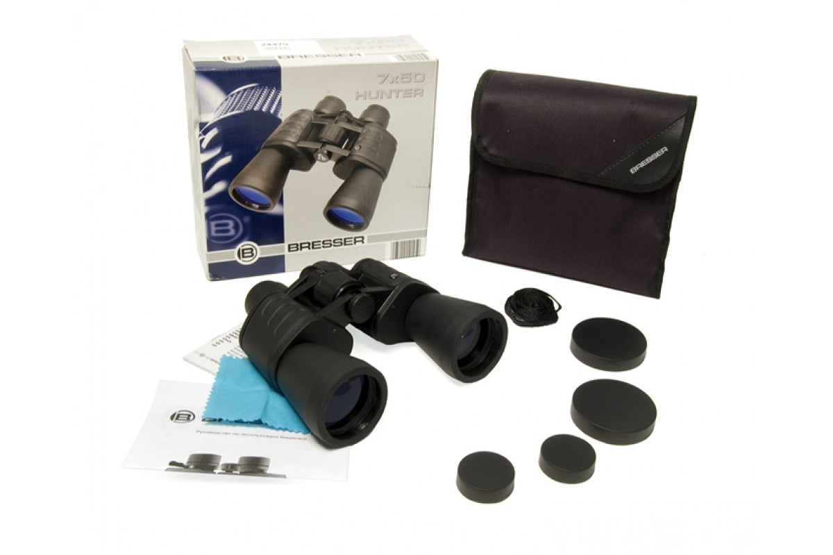 Светосильный бинокль Bresser Hunter 7x50 позволяет вести наблюдения в условиях слабой освещенности или плохой видимости (например, в тумане). Увеличение прибора – 7 крат, диаметр объективов – 50 мм. Минимальное фокусное расстояние – 5 м. Подойдет туристам, охотникам, рыболовам и всем любителям активного отдыха на природе. В бинокле использована оптическая система призм Porro; линзы изготовлены из оптического стекла BK-7 с многослойным просветлением. В бинокль заложена возможность коррекции межокулярного расстояния и диоптрий. Прибор оснащен системой центральной фокусировки. В комплект входят адаптер для штатива, защитный футляр, крышки окуляров (2 шт. ) и объективов (2 шт. ), салфетка для ухода за оптикой.