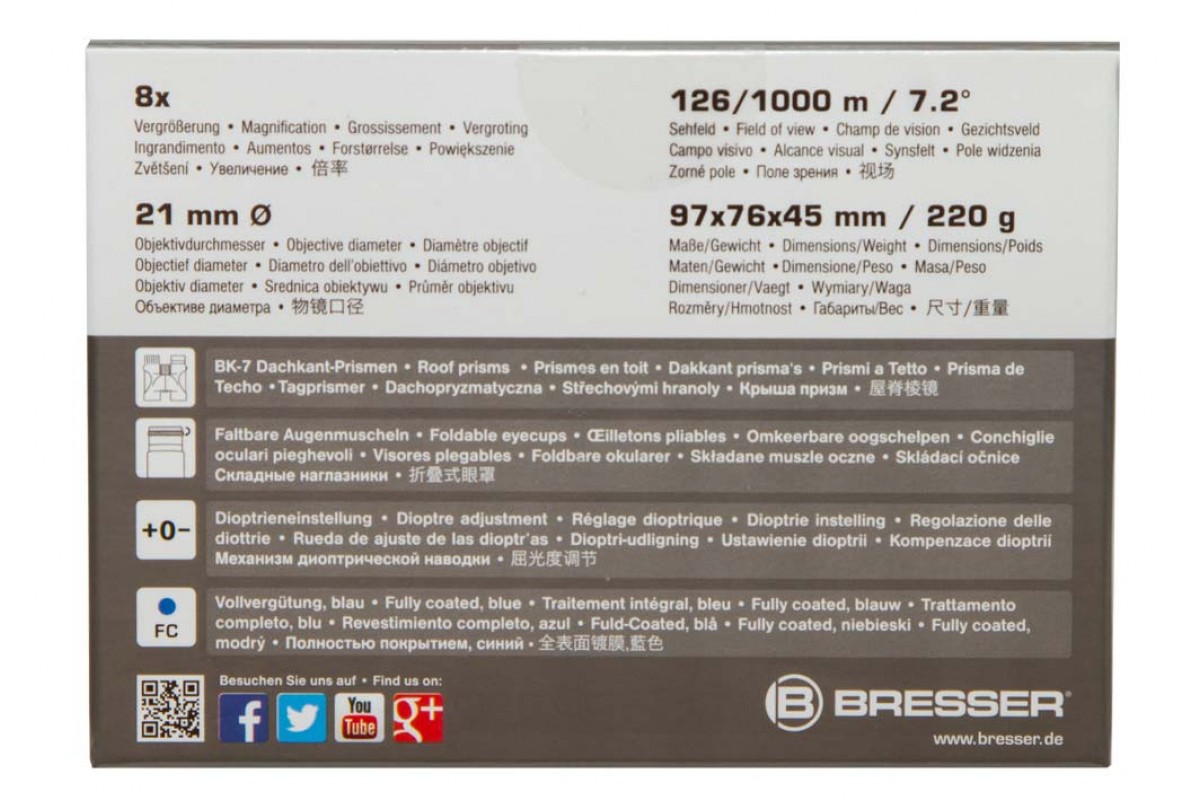 В Bresser Travel 8x21 установлены современные roof-призмы и линзы с полным просветлением. Оптика не искажает геометрию предметов и радует яркой и контрастной картинкой. Все детали удаленных объектов видны четко и подробно. Корпус бинокля покрыт резиной и отталкивает пыль и грязь. Благодаря ему оптика надежно защищена от случайных ударов.