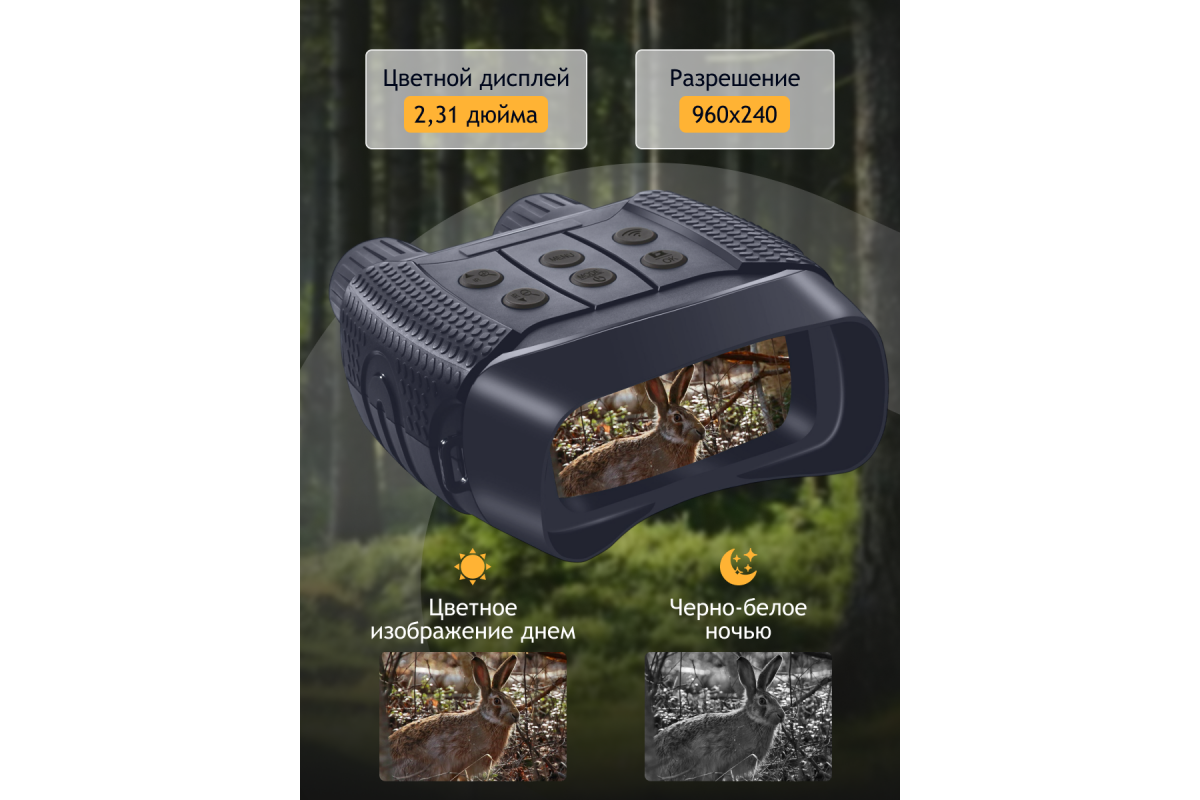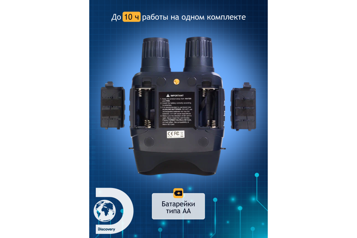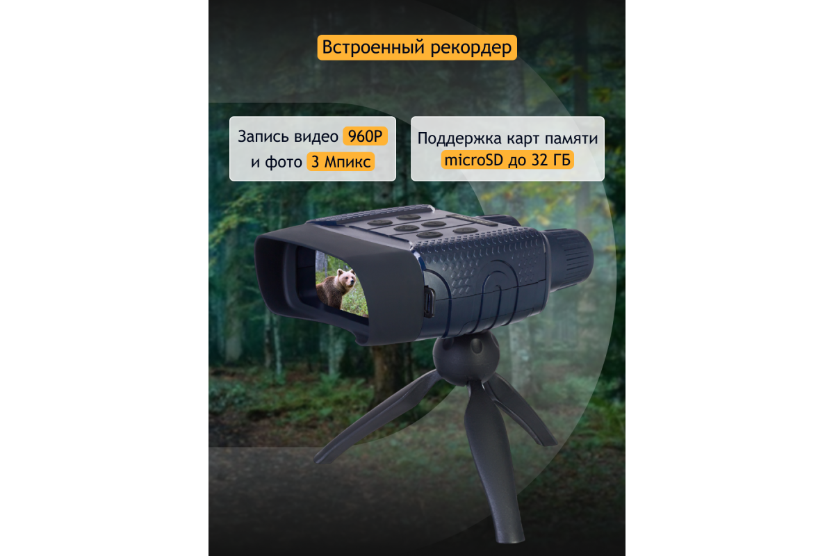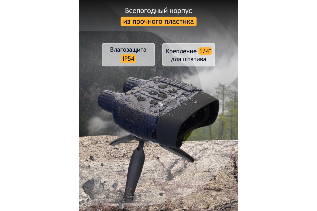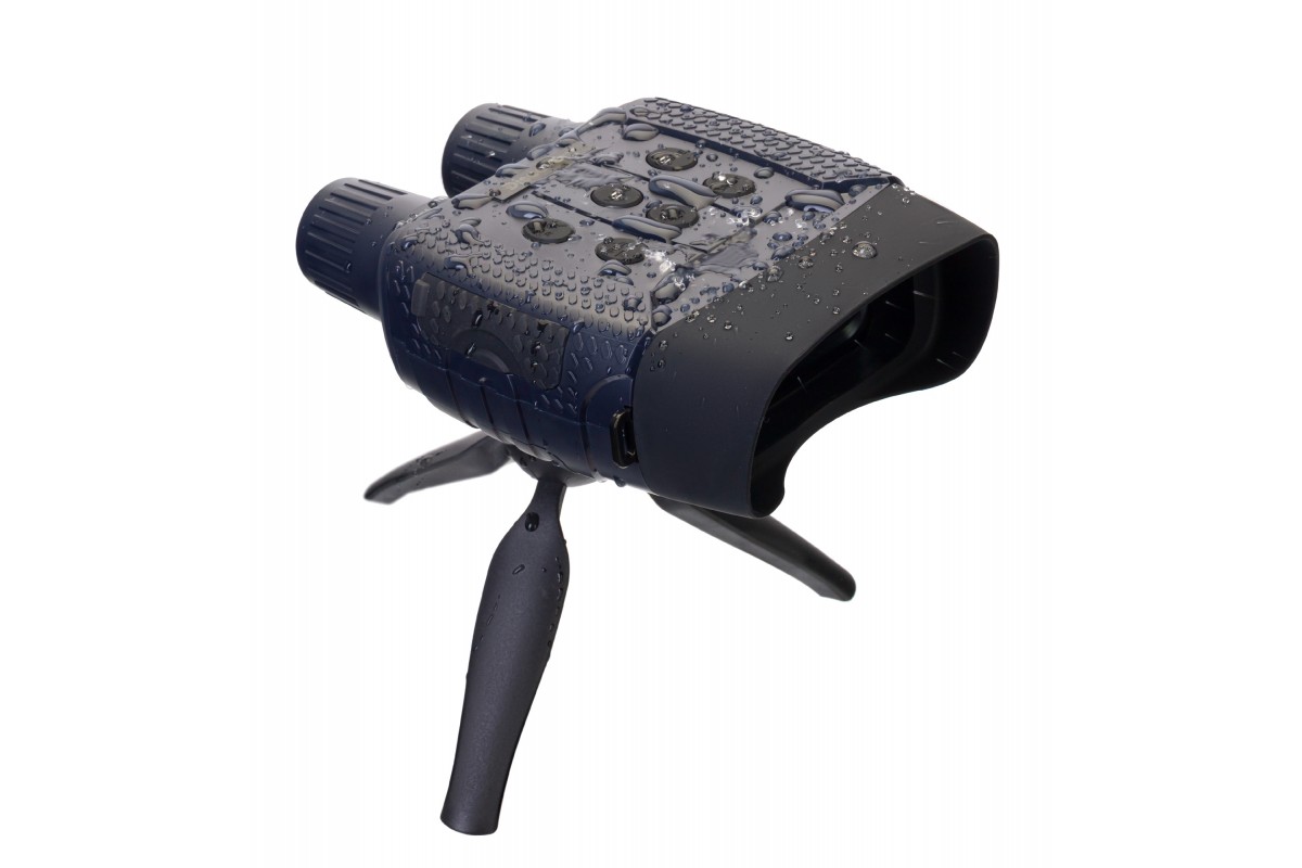 В приборе все организовано максимально удобно для ведения полевых наблюдений. Корпус эргономичный и имеет защиту от влаги, кнопки расположены таким образом, что сразу же «ложатся» под пальцы – даже в темноте не происходит ошибочных нажатий. Для питания используются стандартные батарейки – в длительном походе или на охоте гораздо проще заменить набор батареек, чем искать розетку для подзарядки аккумулятора. На одном заряде ПНВ работает от 4 до 10 часов (время зависит от интенсивности использования подсветки). Также в комплект включен небольшой штатив – с его помощью бинокль можно поставить на землю или ствол упавшего дерева и добиться максимально стабильной картинки.