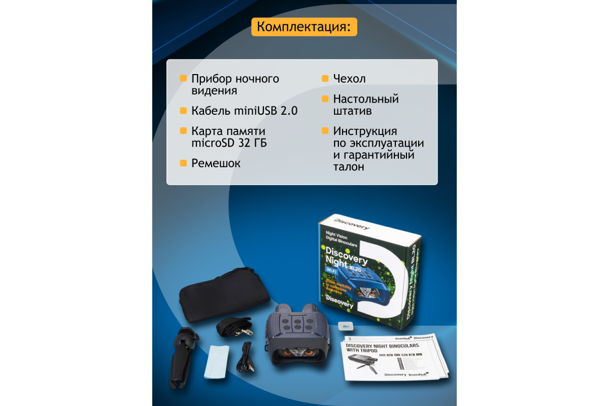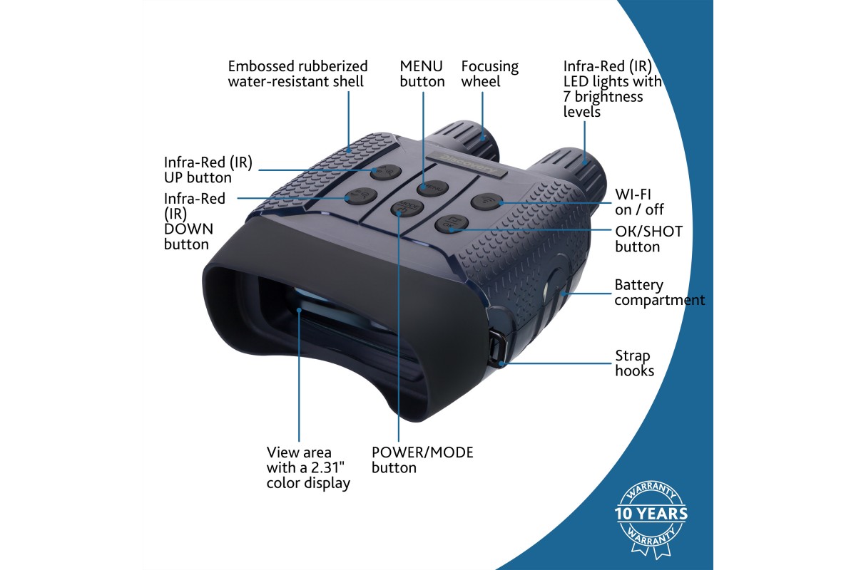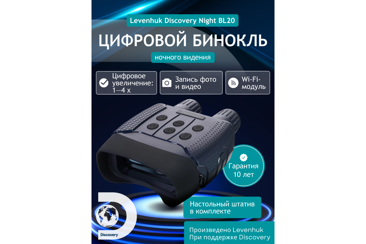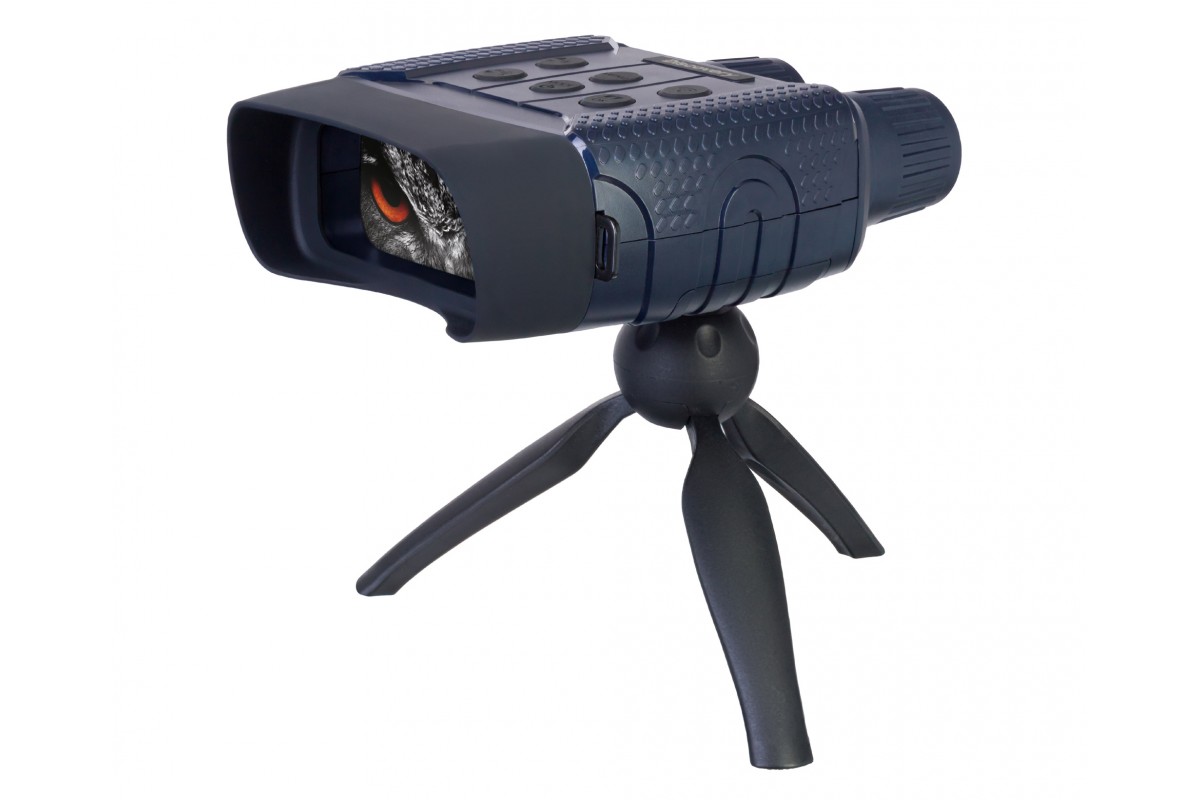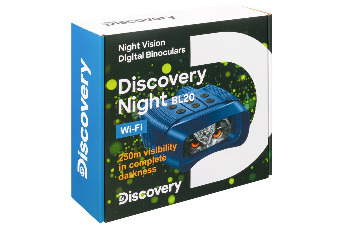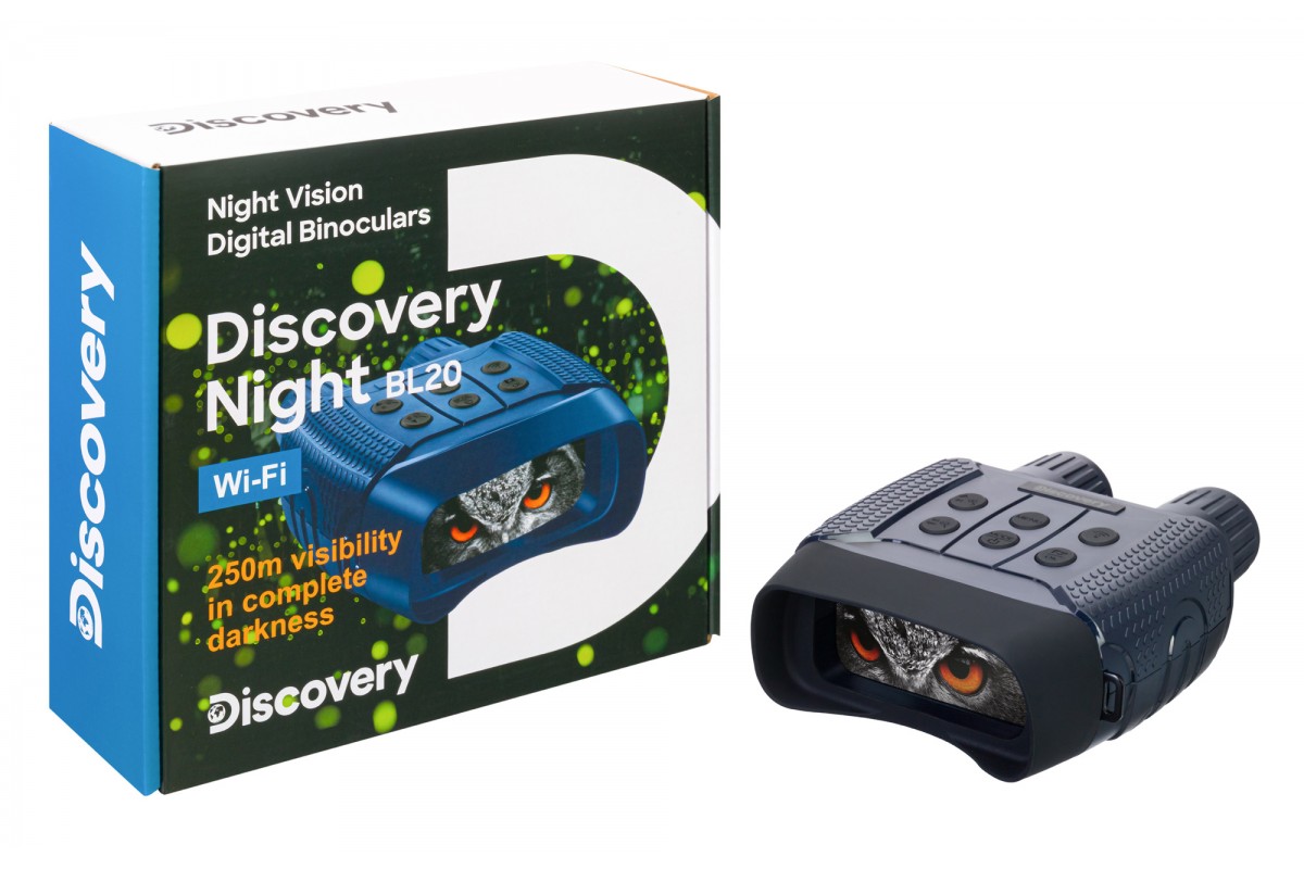 Levenhuk Discovery Night BL20 – бинокль ночного видения с цифровым преобразователем, т. е. его можно использовать не только для ночных, но и для дневных наблюдений. Прибор не боится засветки, эффективно работает при любой освещенности. Днем изображение будет полностью цветным, ночью – черно-белым. Также здесь есть рекордер для записи фото и видео и встроенный модуль Wi-Fi для управления прибором при помощи смартфона или планшета. Этот ПНВ отлично подходит для ночной охоты, разведывания и охраны территорий, спортивного ориентирования на местности.