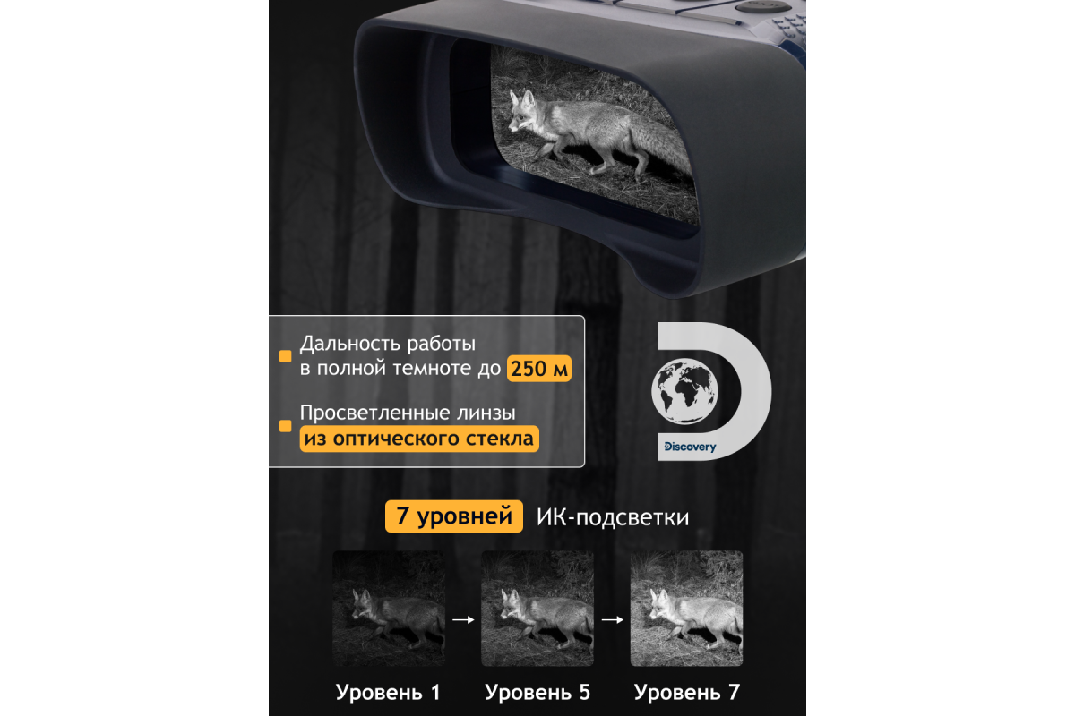 В приборе установлена стеклянная оптика, которая дополнена покрытием на основе диоксида кремния. Это позволяет получать с его помощью четкие и детализированные изображения без паразитных искажений. Доступно цифровое увеличение. В полной темноте прибор позволяет видеть на расстоянии в 250 метров, при дневном освещении – фокусироваться на объектах, расположенных на удалении в 3 метра и более. Чтобы в ночное время лучше различать мелкие детали, можно использовать встроенную ИК-подсветку. Благодаря 7 уровням яркости ее легко настроить таким образом, чтобы получать лучшее по качеству изображение и при этом не расходовать заряд батареек слишком сильно.