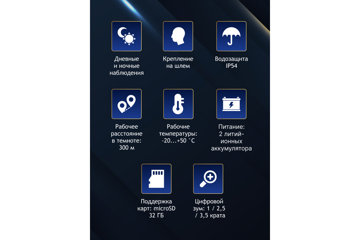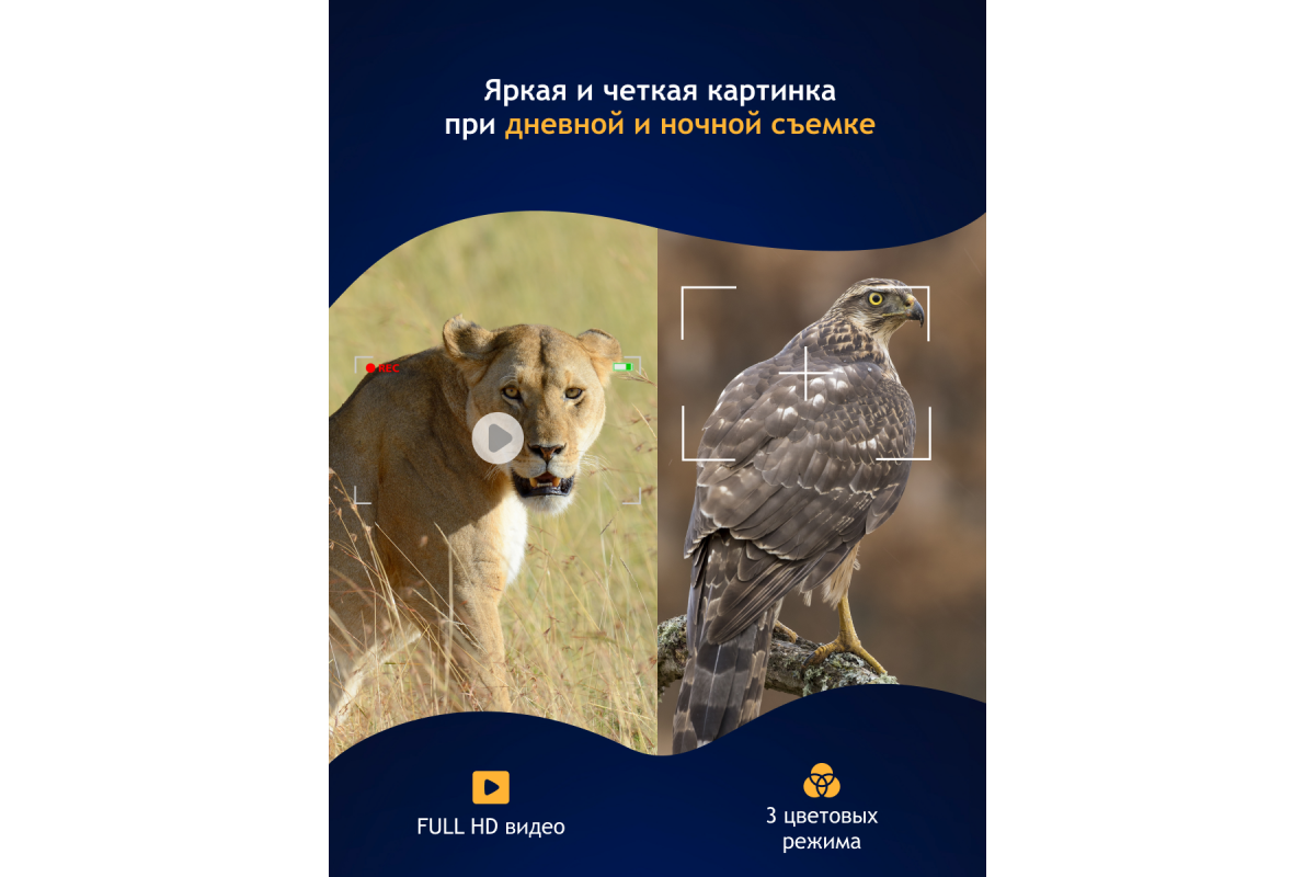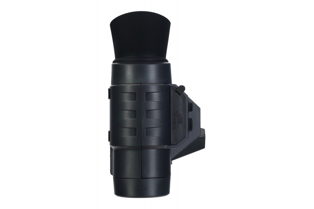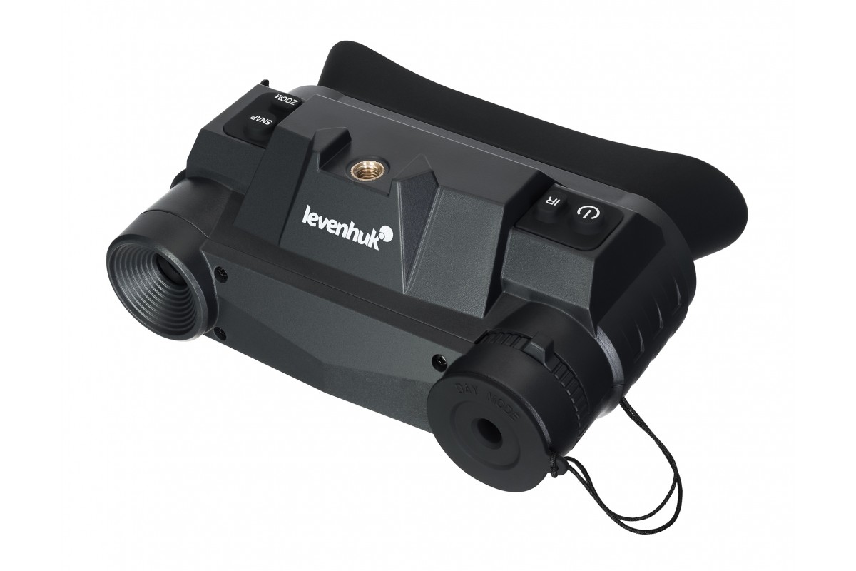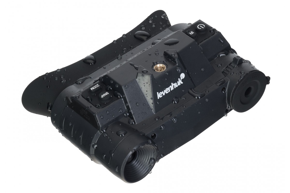 Оптика бинокля с полным многослойным просветляющим покрытием выполнена из оптического стекла и минимизирует искажения. Сенсор CMOS 2,7" 2 Мпикс и инфракрасная подсветка обеспечивают дальность обнаружения до 200 метров в полной темноте и сумерках. При дневном свете видимость прибора не ограничена. Оптическое увеличение бинокуляра составляет 1 крат, цифровое – 1, 2,5 и 3,5 крата.