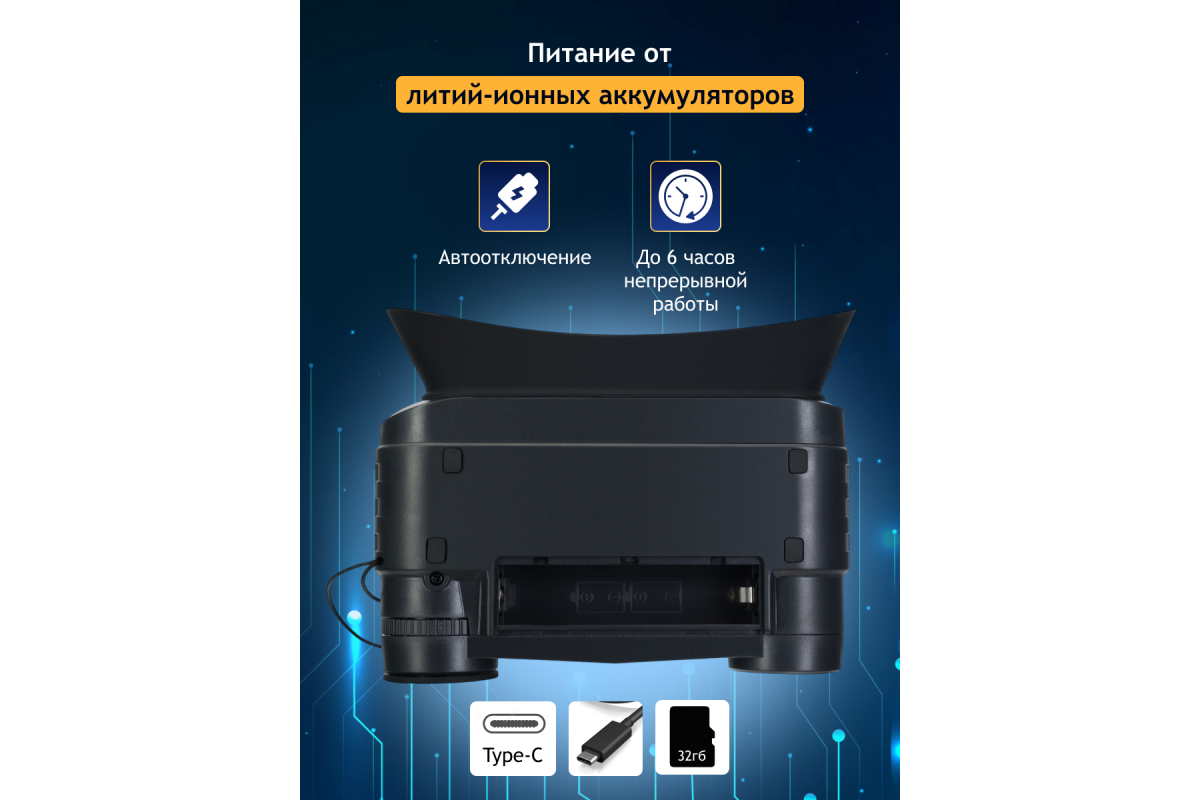 • Время непрерывной работы – 2 часа с включенной ИК-подсветкой, 6 часов без подсветки