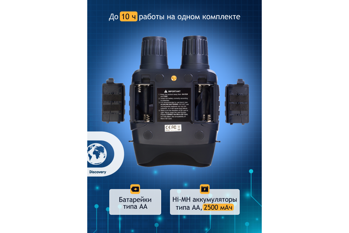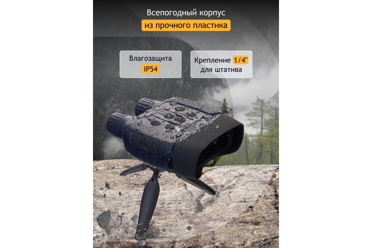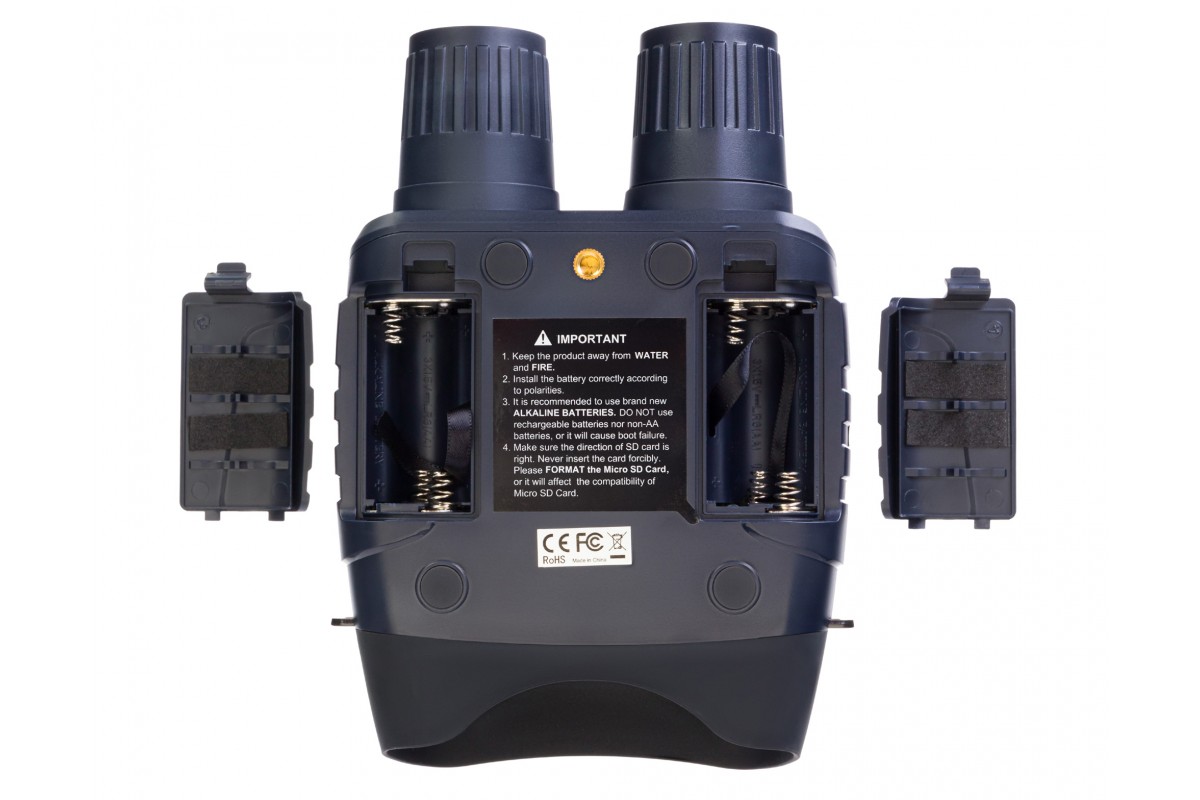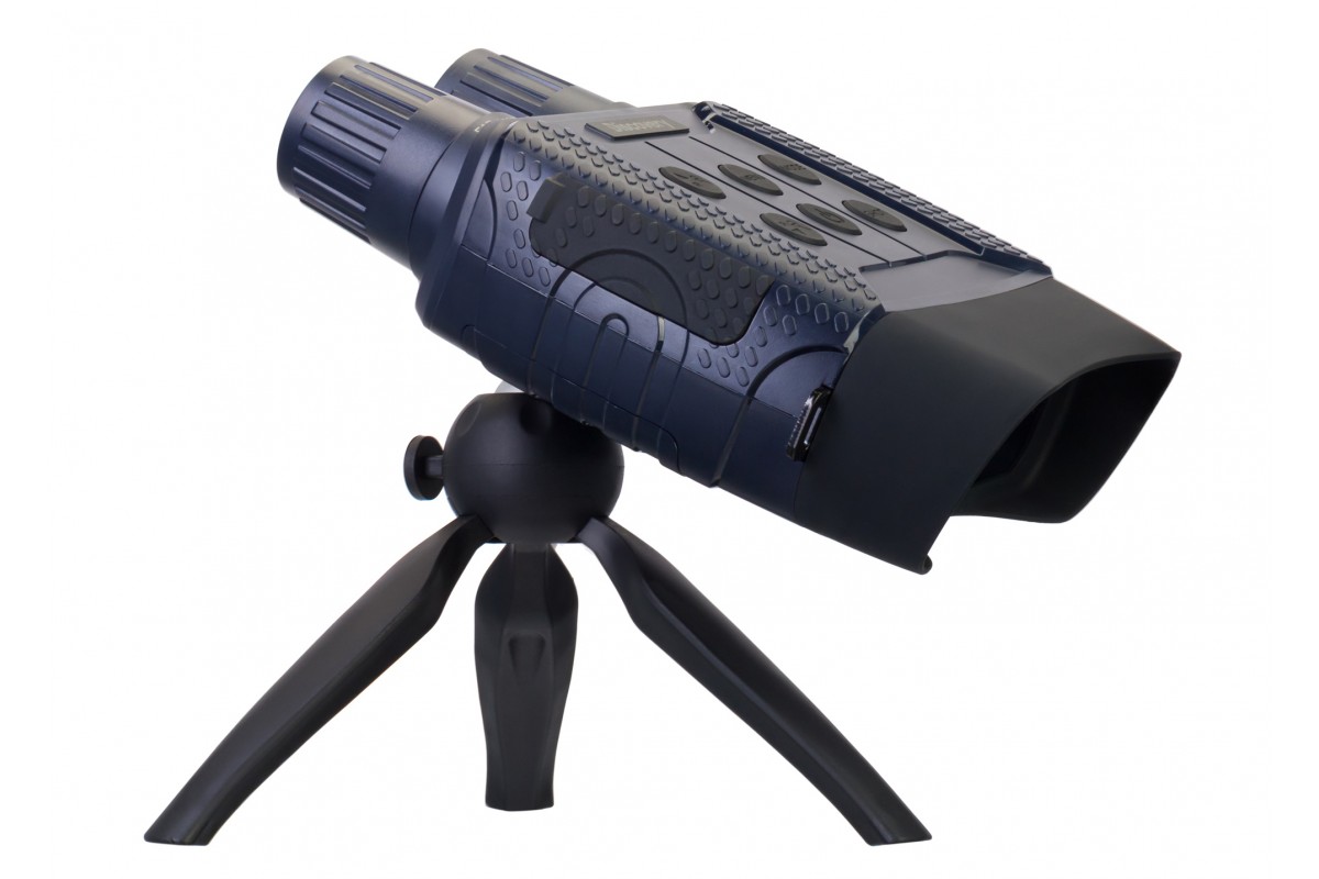 Бинокль удобно лежит в руках, все кнопки управления сразу оказываются под пальцами. Благодаря влагозащите он способен стойко переносить многие полевые испытания. Питание обеспечивается стандартными батарейками или никель-металлогидридными аккумуляторами. На одном заряде ПНВ способен работать от 4 до 10 часов (реальная длительность работы зависит от интенсивности использования ИК-подсветки). Также прибор дополнен небольшим штативом складной конструкции. С его помощью бинокль можно устойчиво разместить где угодно и тем самым повысить стабильность изображения. Это особенно полезно при длительных наблюдениях и видеозаписи.