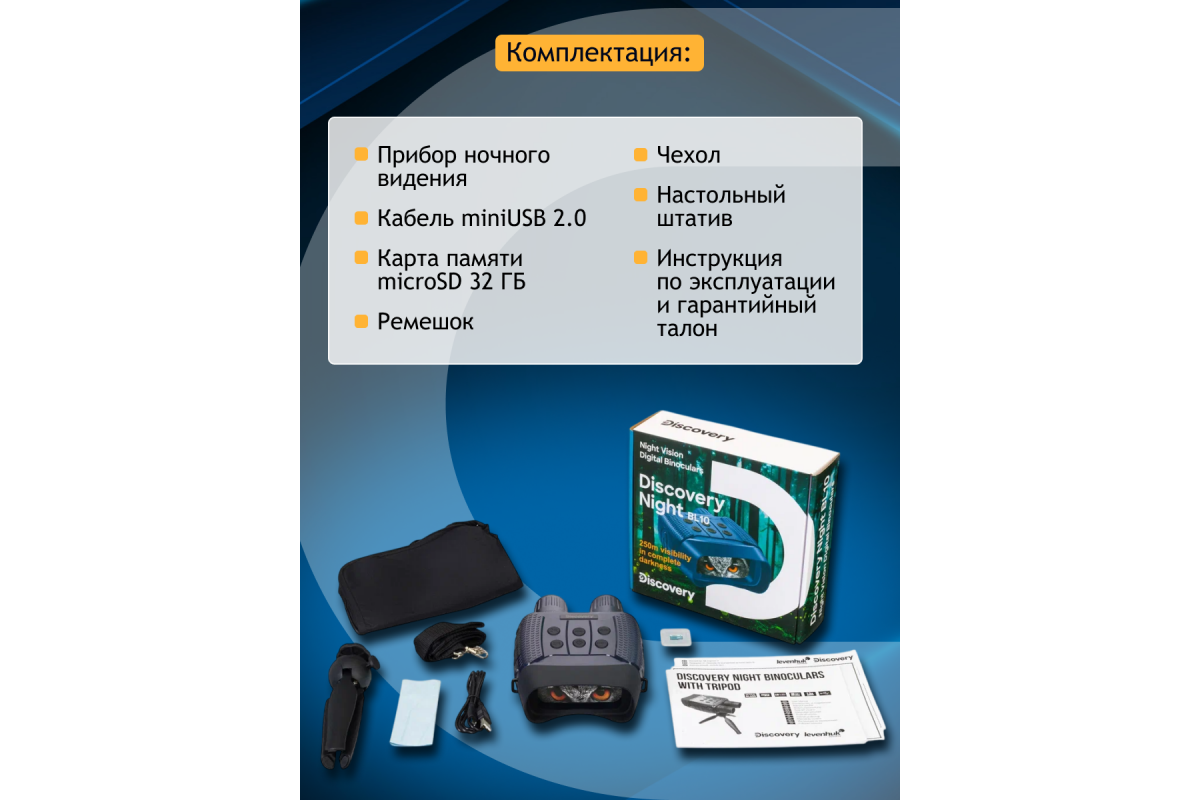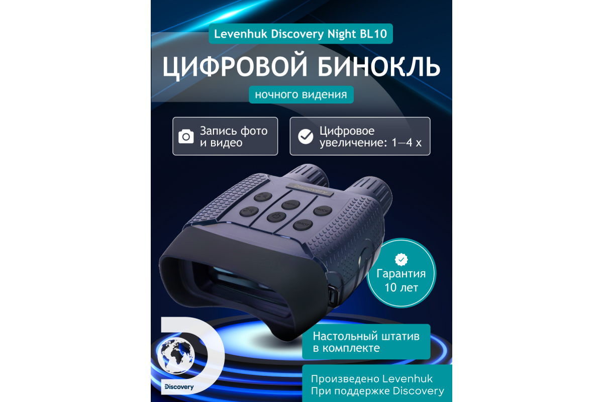 Цифровой бинокль ночного видения Levenhuk Discovery Night BL10 – это два прибора в одном. Так как внутри установлен не боящийся засветки цифровой преобразователь, этот ПНВ можно использовать и ночью, и днем. Таким образом, он при необходимости спокойно заменит собой классический полевой бинокль. Также в приборе установлен рекордер, позволяющий записывать фото и видео. Сферы использования Levenhuk Discovery Night BL10: охота, охрана территорий, спортивное ориентирование, разведывание местности и многое другое.