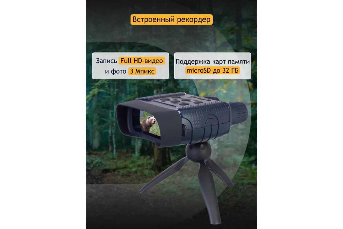 Этот прибор ночного видения также может записывать фото и видео при помощи встроенного рекордера. Доступен выбор разрешения кадра, запись ведется на карту памяти. При необходимости перенести отснятый материал на внешний диск бинокль следует подключить к компьютеру через кабель miniUSB. Максимальное разрешение фотоснимков составляет 2048x1536 пикс. Кадровая частота видео – 30 кадров в секунду, достаточная для получения плавных роликов. Удобно, что кадры можно отсмотреть прямо на экране прибора – это помогает эффективнее использовать место на карте памяти, удаляя неудачные снимки.
