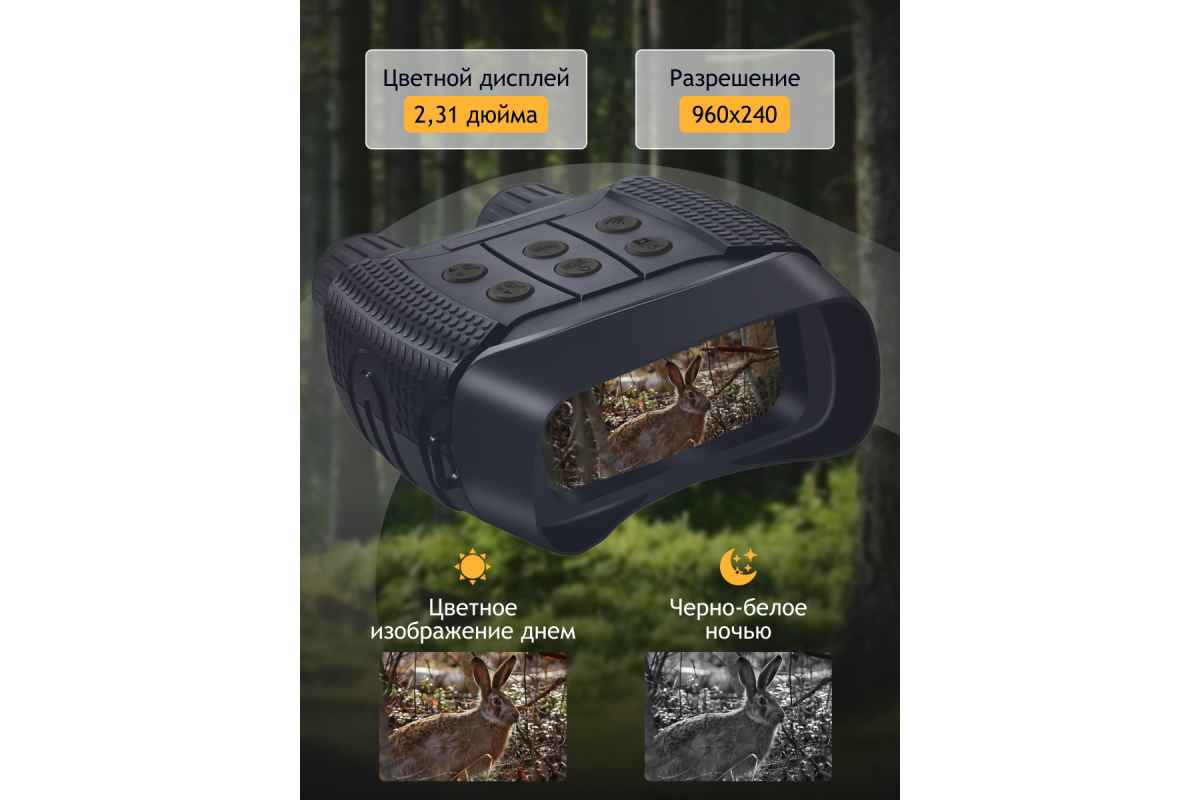 Все оптические элементы сделаны из стекла с нанесением просветления на основе диоксида кремния. Благодаря этому бинокль эффективно пропускает свет, что позволяет ему в любых условиях демонстрировать четкую и контрастную картинку. В дневное время хорошо различимыми во всех деталях будут объекты на удалении от 3 метров и более. Ночью обзор будет в пределах 250 метров. Отдельно рекомендуем использовать в полной темноте встроенную ИК-подсветку. Она улучшит видимость и будет незаметной для окружающих. Так как у подсветки есть 7 уровней яркости, ее легко адаптировать под любую наблюдательную задачу. Прибор может создавать цветное, черно-белое, ярко-зеленое изображение или изображение с эффектом цветной пленки. В ночном режиме цветное изображение недоступно.