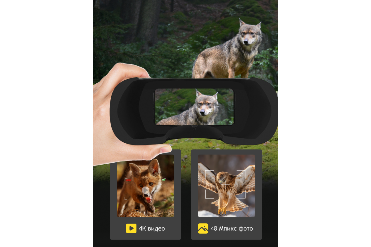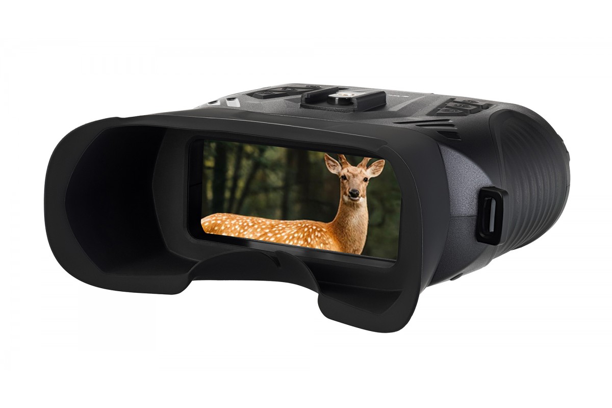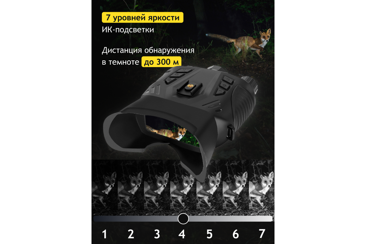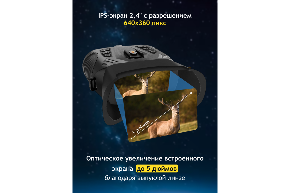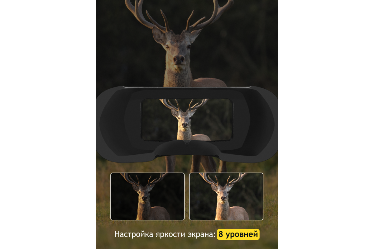 Для формирования изображения окружающего мира прибор использует современный CMOS-сенсор. Далее картинка выводится на жидкокристаллический IPS-экран с разрешением 640х360 пикс, где дополнительно увеличивается при помощи выпуклой линзы – это позволяет визуально воспринимать изображение как на 5-дюймовом дисплее, хотя реальная диагональ равна 2,4 дюймам, а также улучшает качество и детализацию картинки. Работа с биноклем в ночное время осуществляется за счет встроенной ИК-подсветки с длиной волны 850 нм и мощностью 3 Вт – этого достаточно для обнаружения объектов в полной темноте на расстоянии 250–300 метров. Точку, создаваемую осветителем с длиной волны 850 нм могут заметить дикие животные или сторонние ПНВ, – учитывайте это, если вам важно сохранить свое положение на местности в тайне. Пользователю доступна настройка яркости ИК-подсветки – можно выбрать один из 7 уровней. Также можно настроить яркость самого экрана – для него предусмотрено 8 уровней интенсивности.