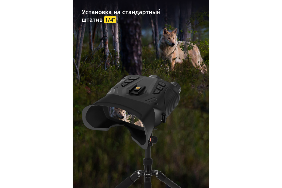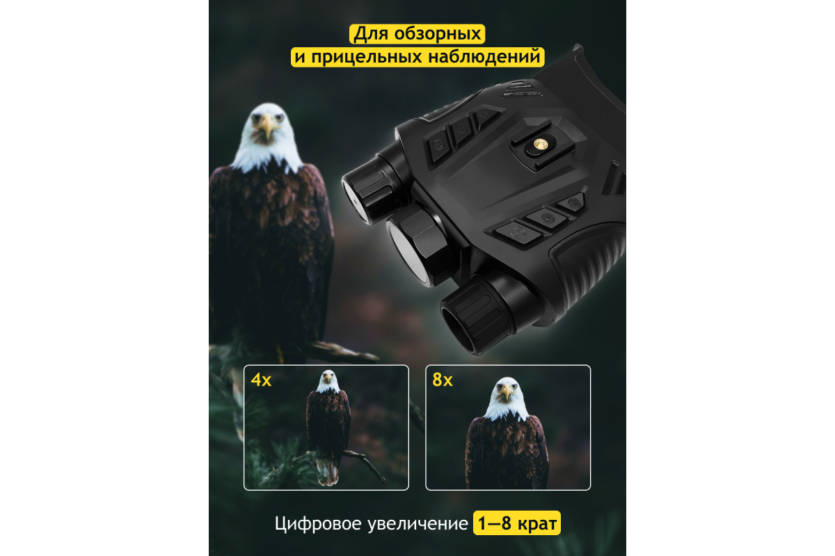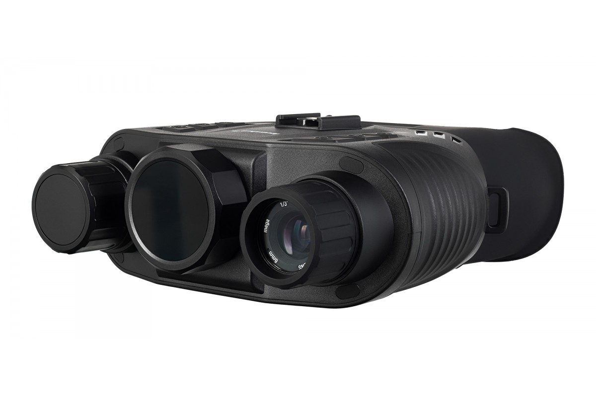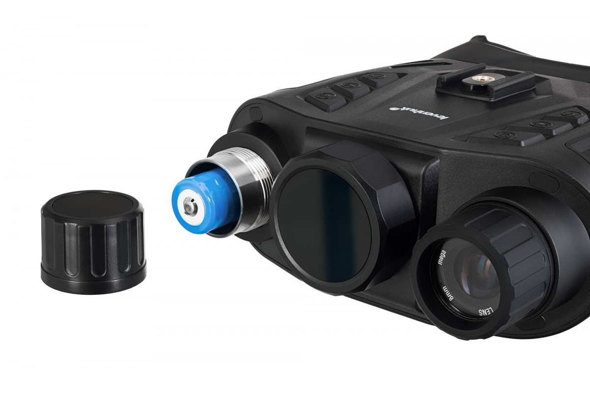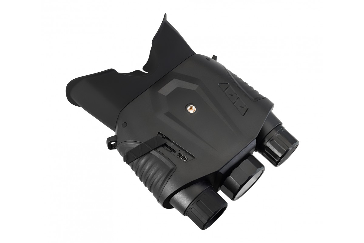 Для формирования изображения окружающего мира прибор использует современный CMOS-сенсор. Далее картинка выводится на жидкокристаллический IPS-экран с разрешением 640х360 пикс, где дополнительно увеличивается при помощи выпуклой линзы – это позволяет визуально воспринимать изображение как на 5-дюймовом дисплее, хотя реальная диагональ равна 2,4 дюймам, а также улучшает качество и детализацию картинки. Работа с биноклем в ночное время осуществляется за счет встроенной ИК-подсветки с длиной волны 850 нм и мощностью 3 Вт – этого достаточно для обнаружения объектов в полной темноте на расстоянии 250–300 метров. Точку, создаваемую осветителем с длиной волны 850 нм могут заметить дикие животные или сторонние ПНВ, – учитывайте это, если вам важно сохранить свое положение на местности в тайне. Пользователю доступна настройка яркости ИК-подсветки – можно выбрать один из 7 уровней. Также можно настроить яркость самого экрана – для него предусмотрено 8 уровней интенсивности.