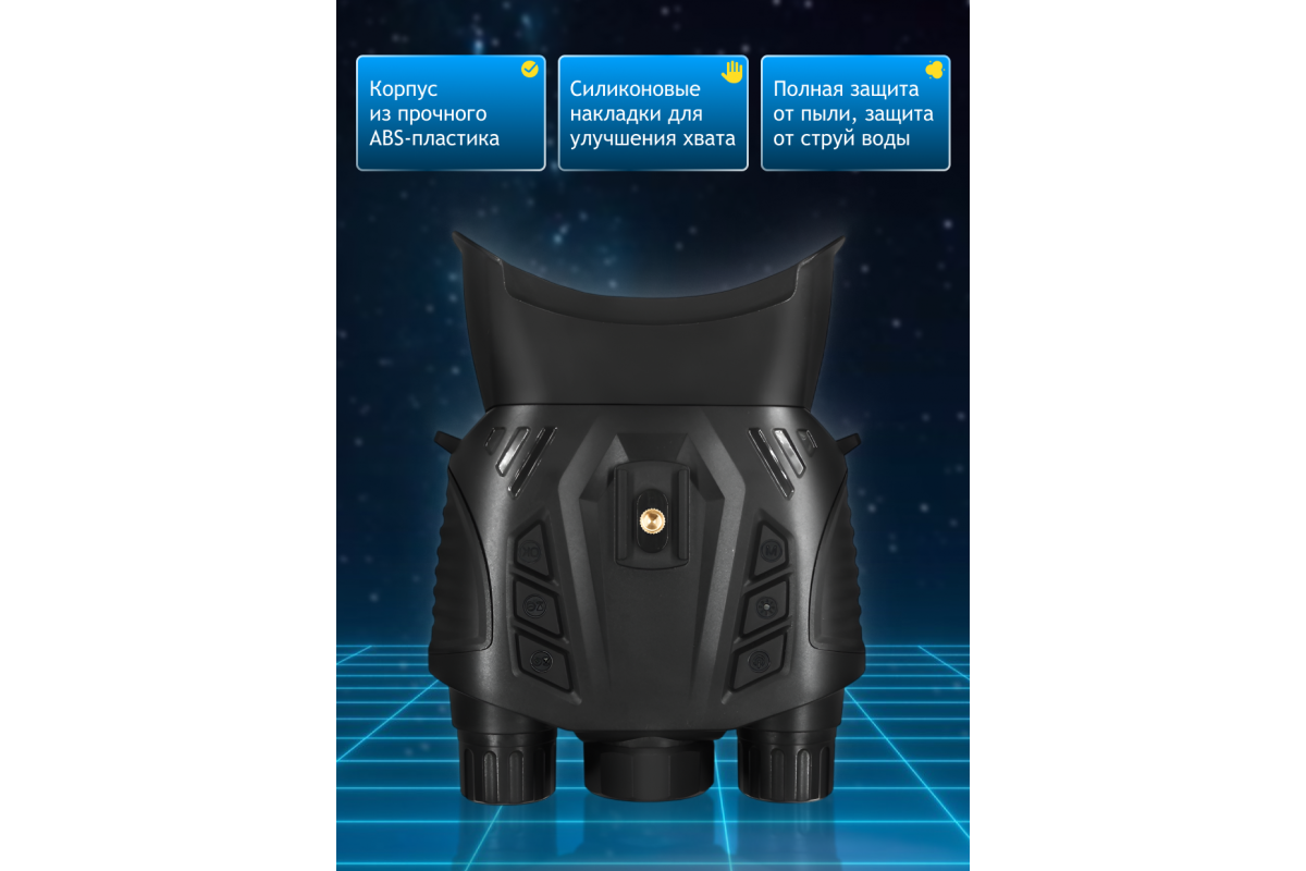 - Дополнительнофункция автоотключения, крепление на голову, Wi-Fi, GPS, настройка яркости экрана и ИК-подсветки