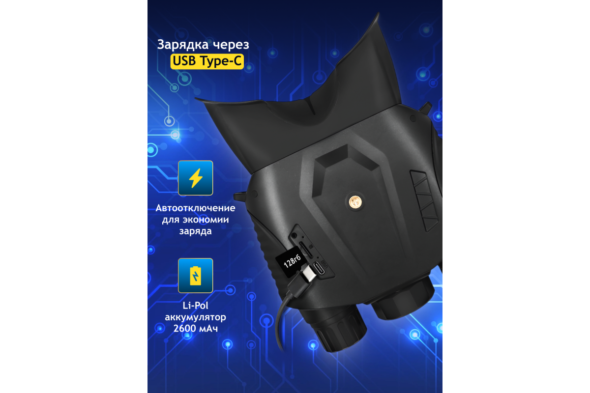 Цифровой бинокль Levenhuk Halo 50XN GPS имеет встроенный рекордер, позволяющий снимать фото и видео с охоты, не отвлекаясь от работы. Пользователь может выбрать разрешение записываемых медиаматериалов: 2,5K UHD/1080р FHD/720р для видео и 15/12/10/8/5/3 Мпикс для фото. Отснятые материалы сохраняются на карту памяти microSD объемом до 128 ГБ (в комплект поставки не входит). Бинокль питается от аккумулятора типа 18650 3,7 В 2600 мАч, для его полной зарядки потребуется всего 2 часа. Кабель зарядки подключается через порт Type-C.