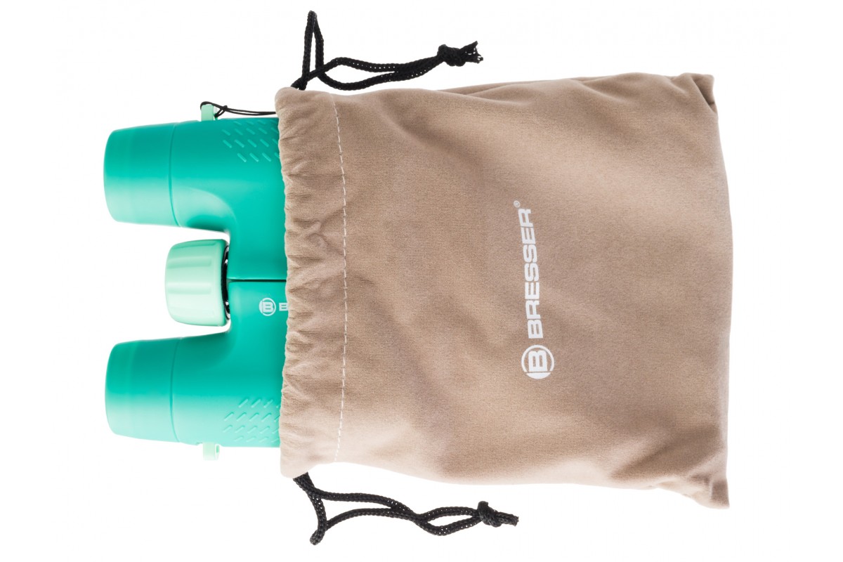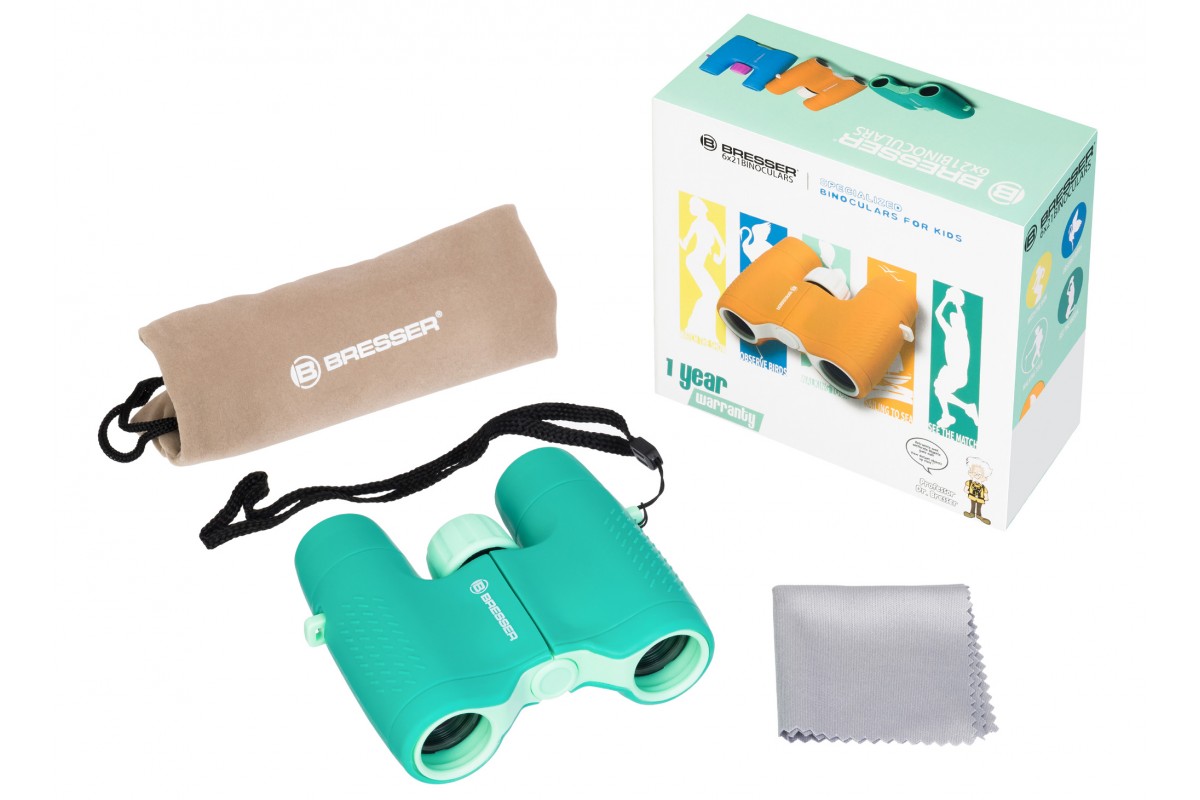Бинокль ориентирован на пользователей в возрасте от 6 лет. В комплекте есть салфетка для ухода за линзами объективов и окуляров, небольшой ремешок на руку и чехол с застежкой-липучкой, который можно закрепить на ремне.