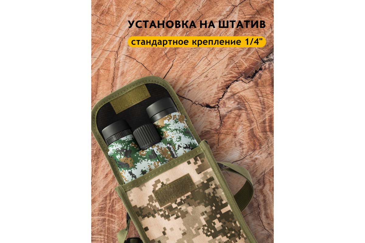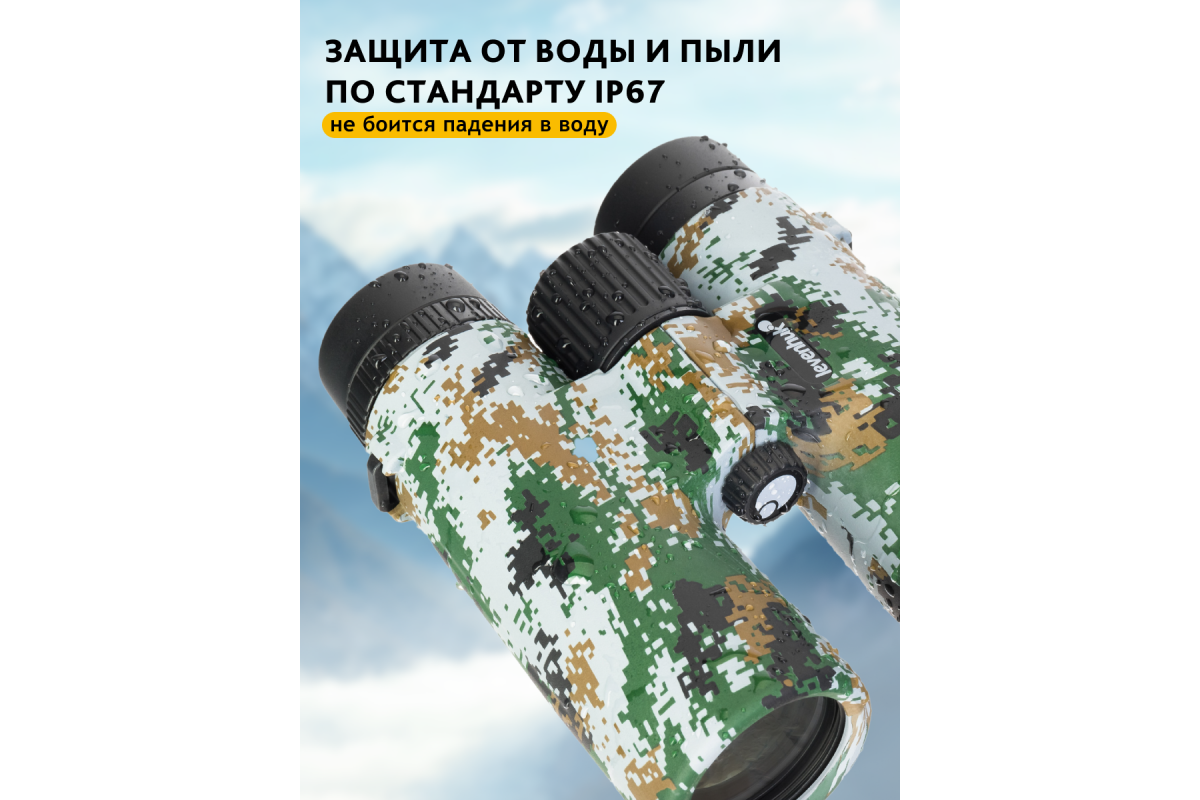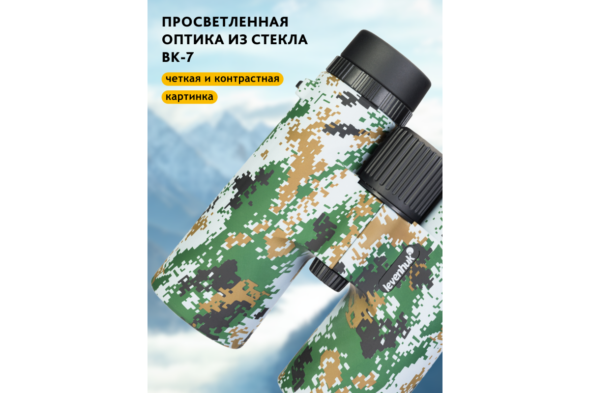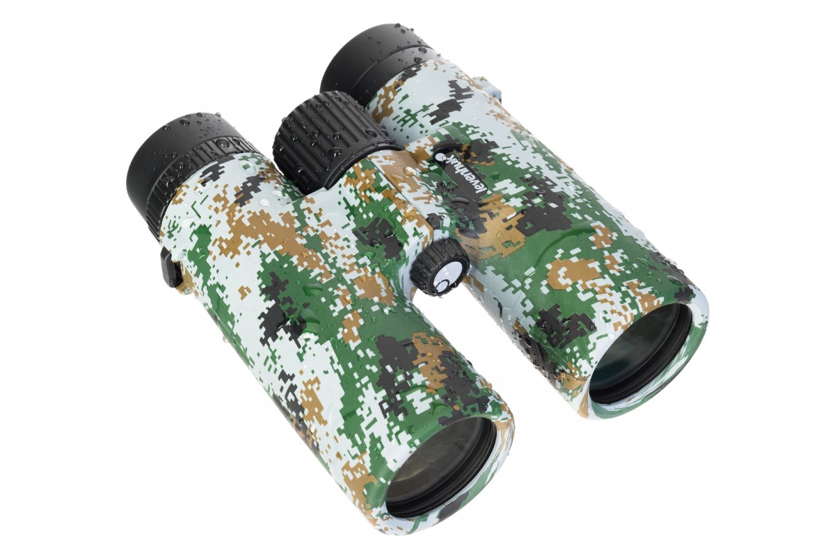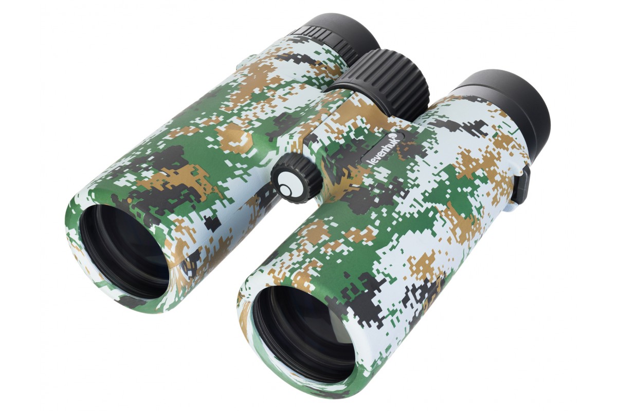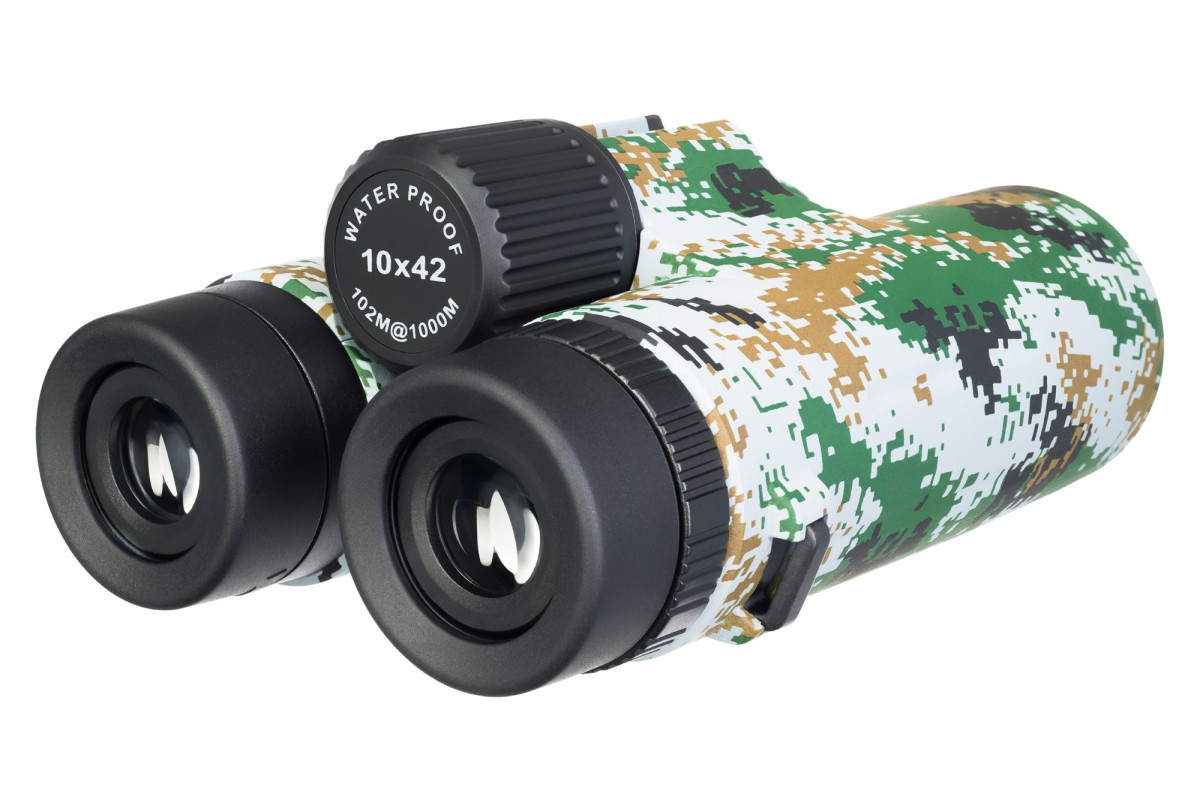 Корпус бинокля, полностью защищенный от попадания пыли и воды, имеет камуфляжную окраску, которая предотвращает демаскировку. За настройку резкости отвечает удобный рельефный барабан центральной фокусировки, минимальная дистанция для фокуса составляет 3 метра. Для длительных наблюдений Levenhuk Camo Dots 10x42 можно установить на стандартный штатив − для этого потребуется адаптер, который приобретается отдельно.