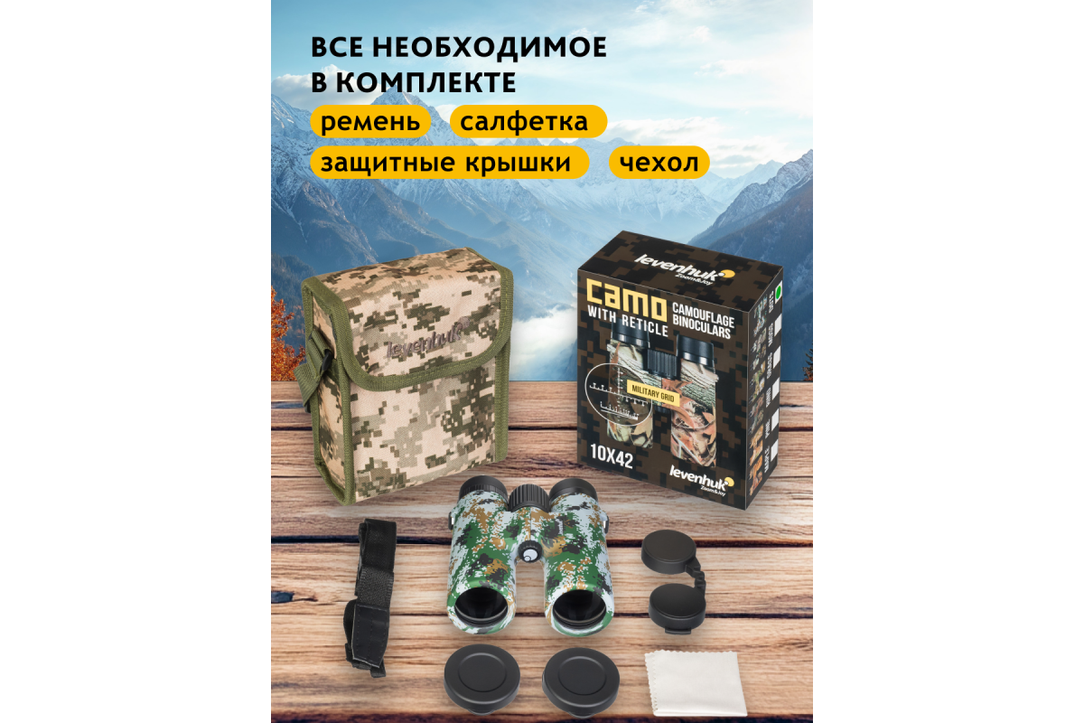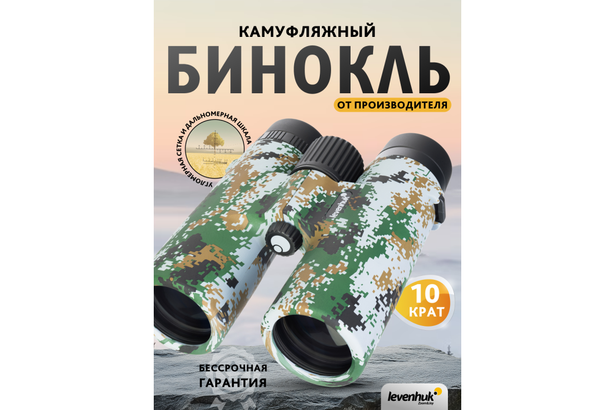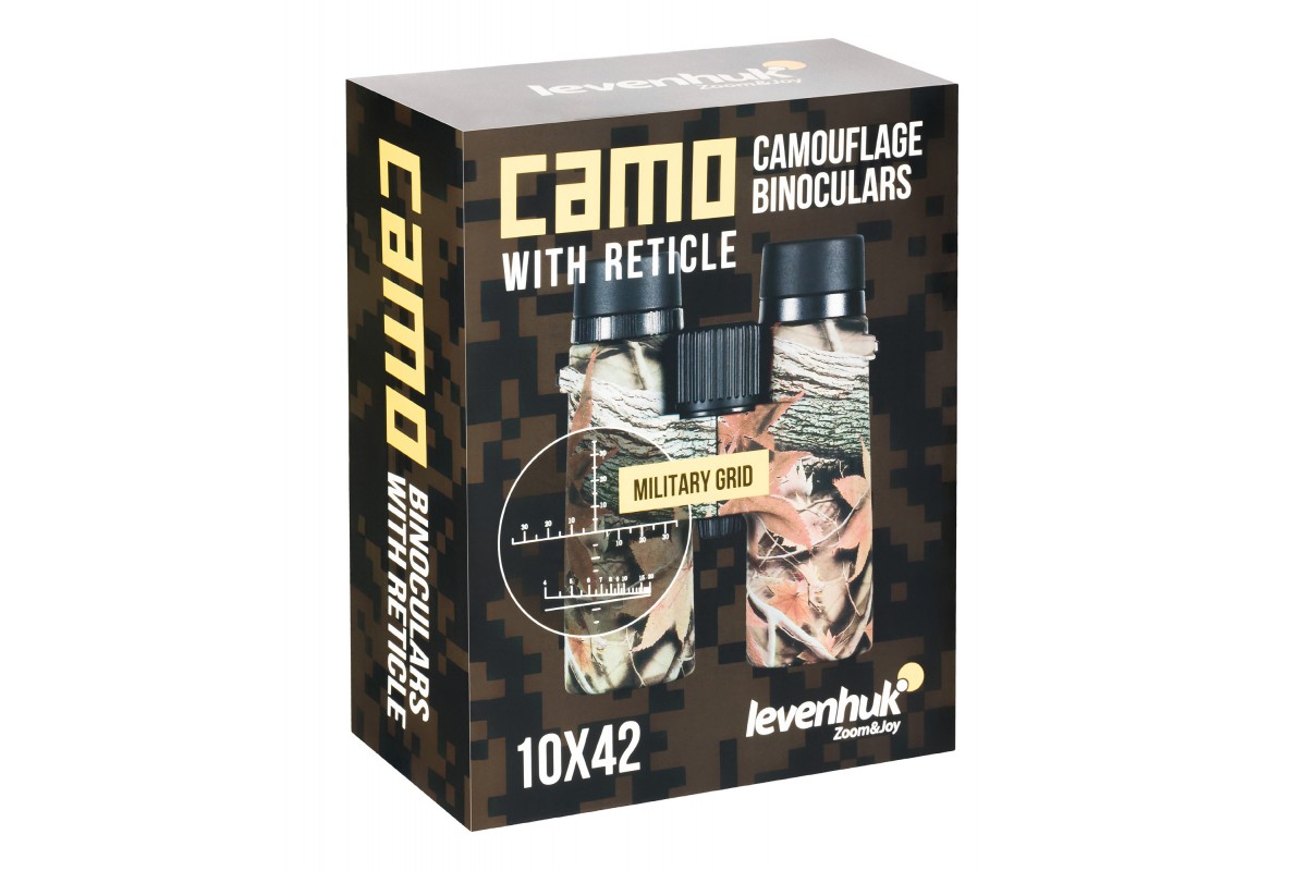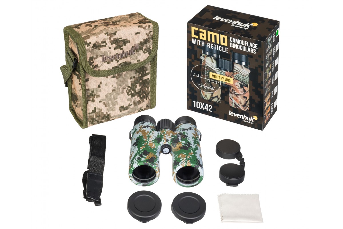 Бинокль Levenhuk Camo Dots 10x42 с сеткой – это полевой оптический прибор, который станет прекрасным помощником любому охотнику. 10-кратное увеличение и оптика с полным многослойным просветлением из стекла BK-7 обеспечивает четкое и ясное изображение с большим количеством деталей даже при наблюдении с большого расстояния. Угломерная сетка и дальномерная шкала в одном из окуляров подарят охотнику дополнительное преимущество: помогут рассчитать расстояние до цели, определить ее высоту, измерить горизонтальный угол и угол возвышения.