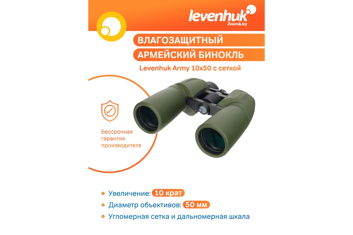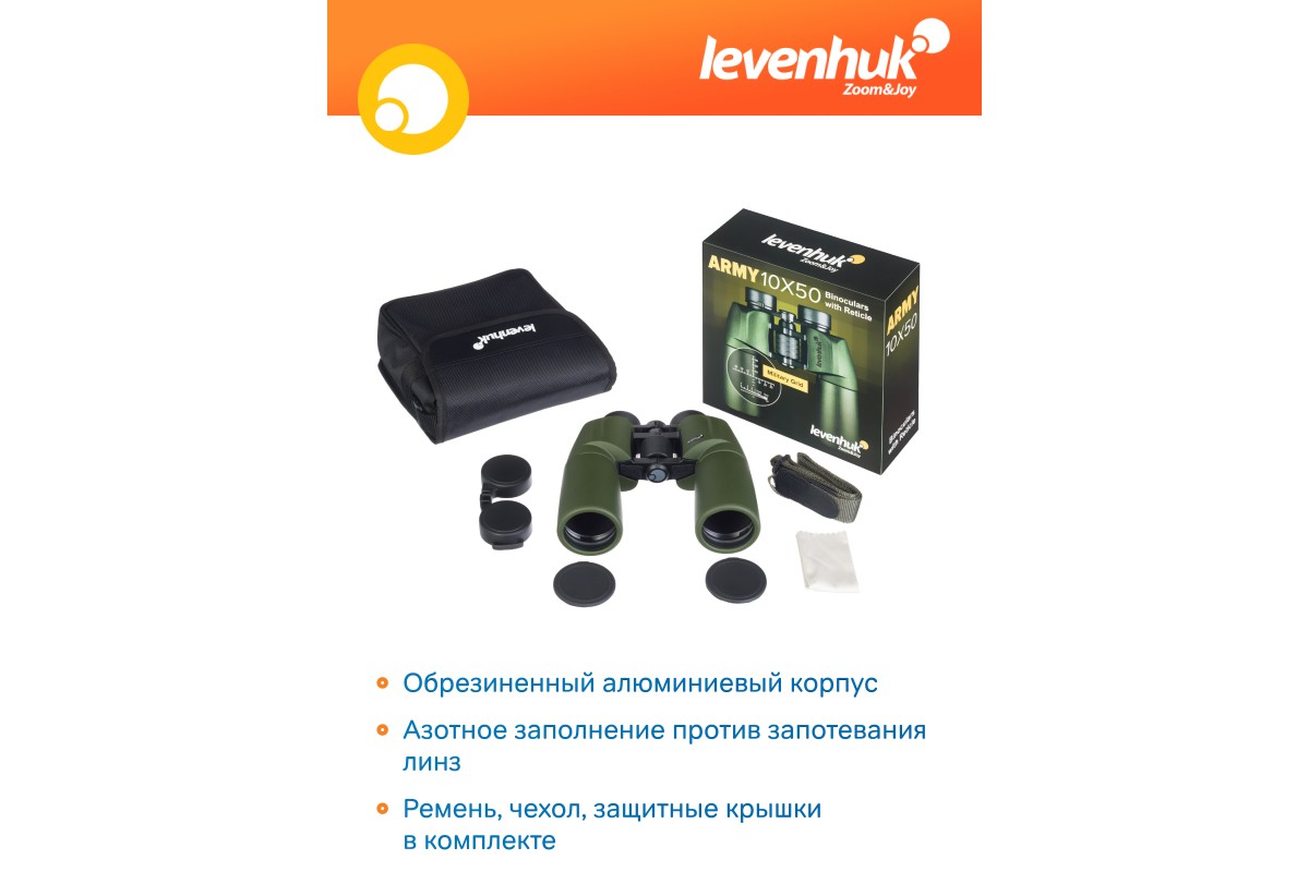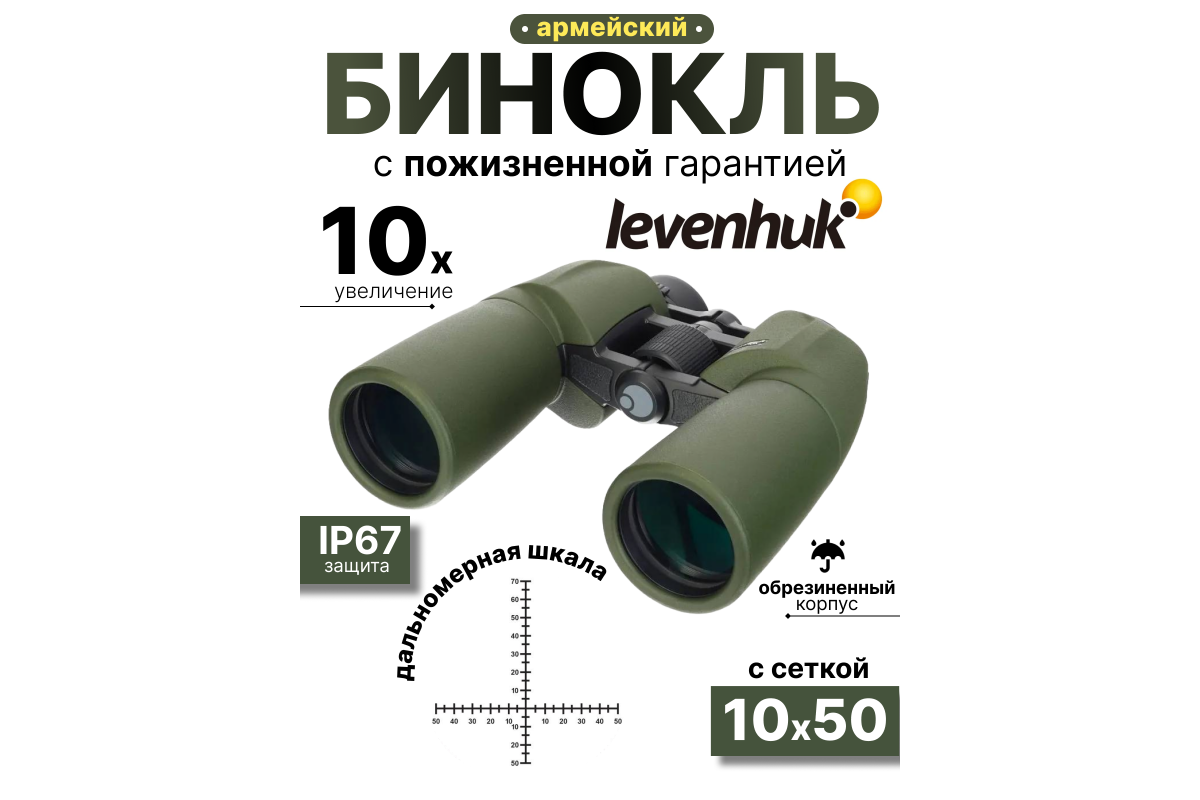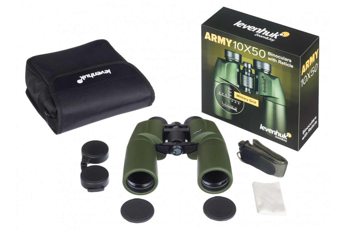 В бинокле Levenhuk Army 10x50 с сеткой выгодно сочетаются увеличение 10х, светосильные 50-миллиметровые объективы и надежное исполнение водонепроницаемого корпуса. Прибор займет достойное место в арсенале техники охотника, походника, спортсмена и поклонника экстрима. Пригодится он и для профессиональных работ, связанных с измерениями на местности. Они становятся возможными благодаря наличию в окуляре бинокля угломерной сетки и дальномерной шкалы – с их помощью можно измерять несколько параметров: высоту наблюдаемой цели, расстояние до нее, угол наклона и горизонтальный угол.
