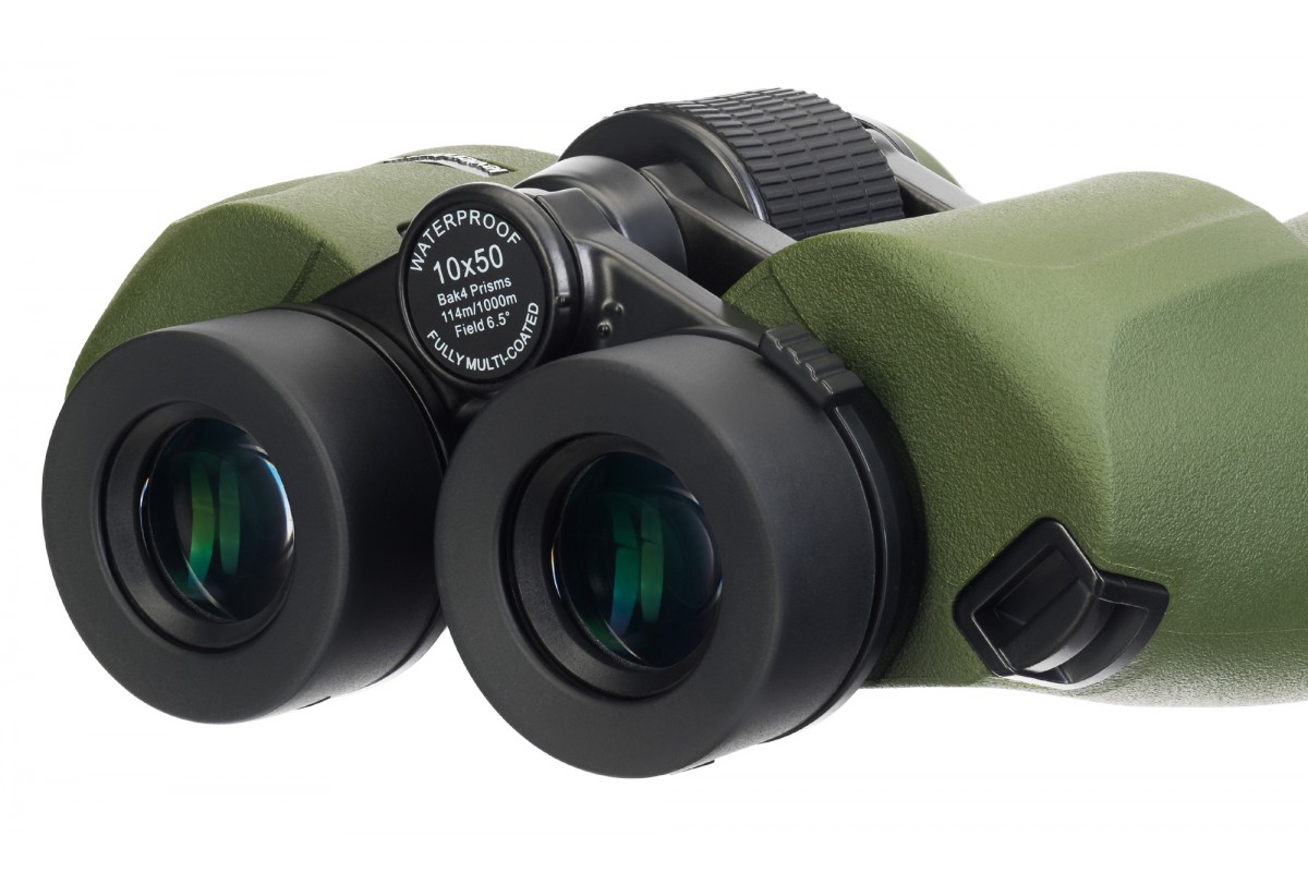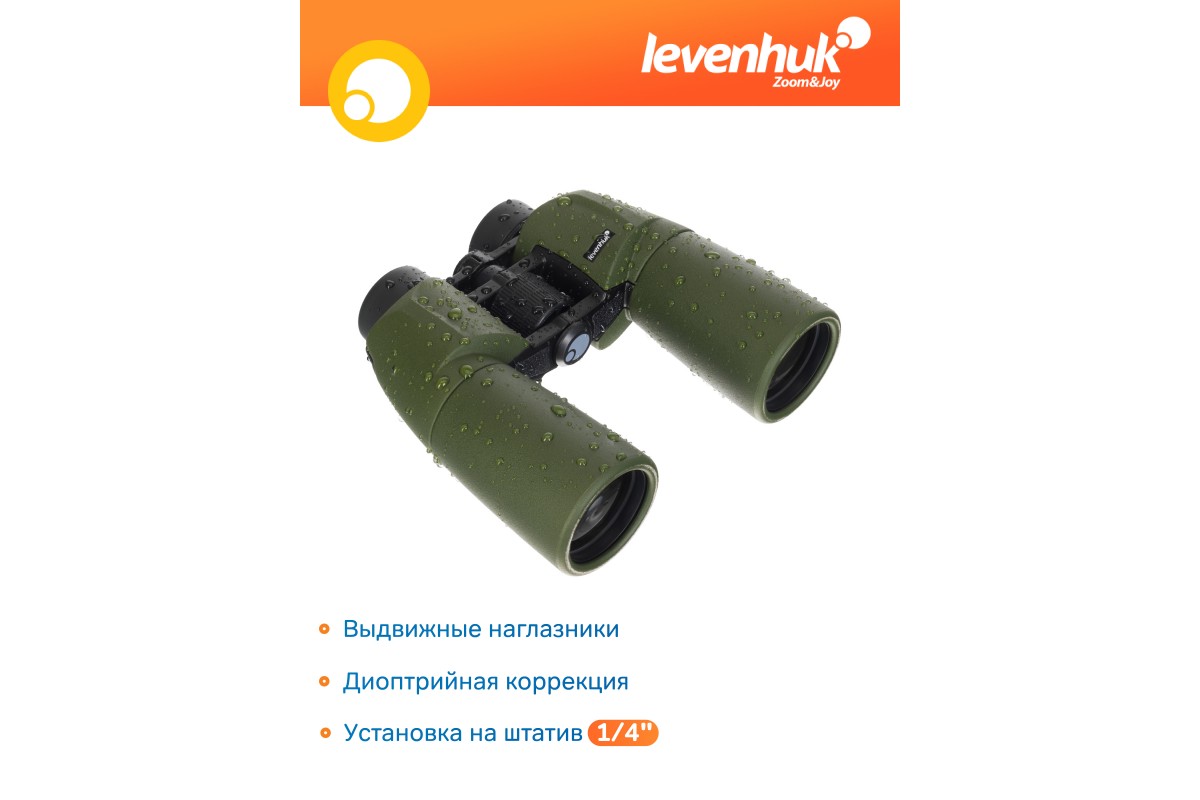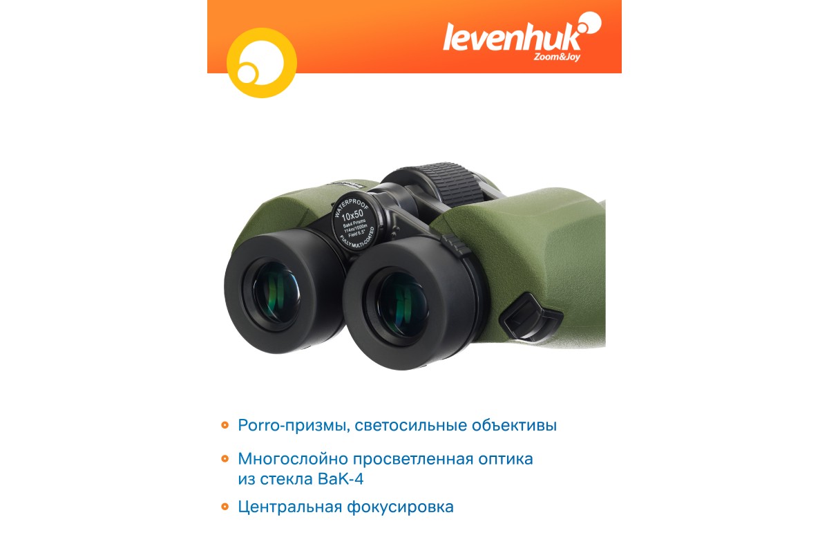 Стеклянная оптика модели Levenhuk Army 10x50 построена на Porro-призмах. Она выстраивает яркое контрастное изображение благодаря полному многослойному просветлению линз. Адаптировать оптику к особенностям зрения наблюдателя можно с помощью кольца настройки диоптрий на окуляре, наглазники выдвигаются и задвигаются. При желании можно с комфортом вести наблюдения не снимая очков – солнцезащитных или тактических. Для настройки резкости служит рельефный барабан центральной фокусировки – его удобно поворачивать даже рукой в перчатке.