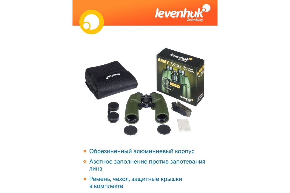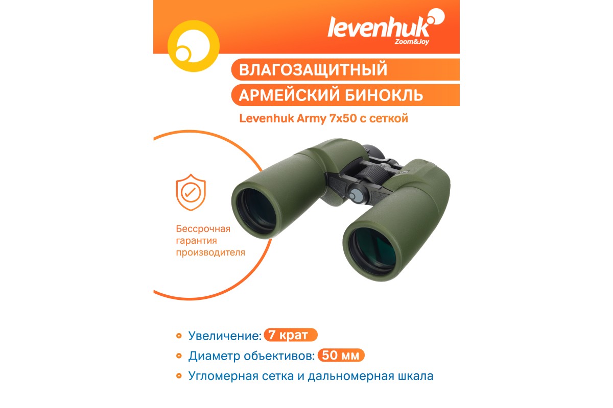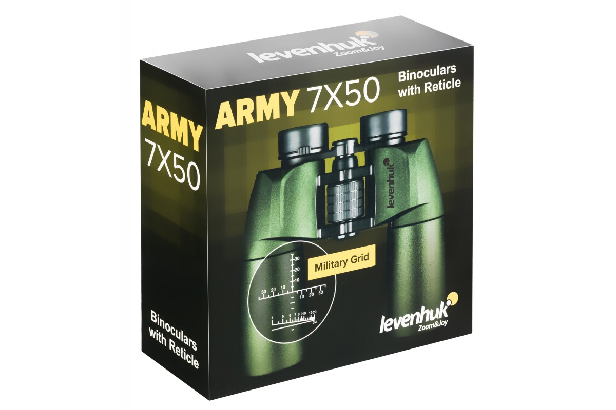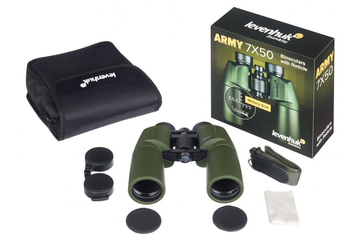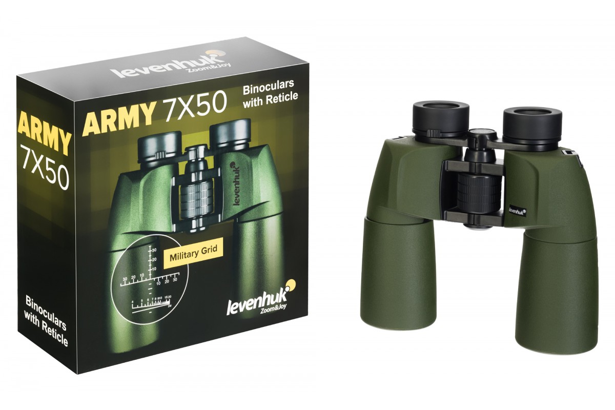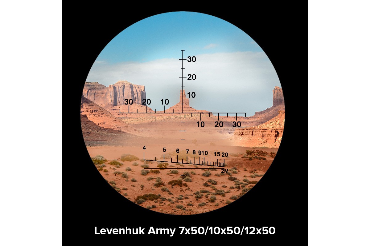 Светосильный бинокль Levenhuk Army 7x50 дополнен измерительными шкалами – это отличное решение для наблюдений и замеров на открытых пространствах. Прибор хорошо послужит для решения профессиональных задач в охране, поисковых операциях, землемерном деле. Понравится он и тем, кто увлечен охотой, туризмом, экстремальными видами спорта и изучением дикой природы. Благодаря большой апертуре объективов и полному многослойному просветлению линз бинокль выстраивает высококонтрастную картинку даже в сумерках, а степень защиты от воды позволяет уверенно использовать прибор на берегу или на борту судна.