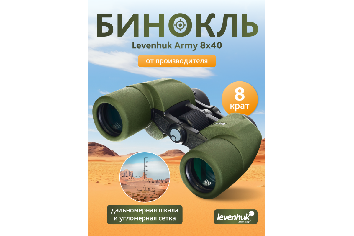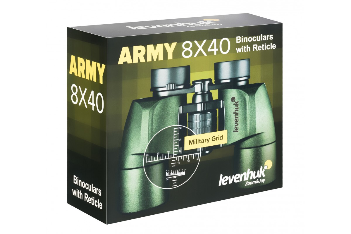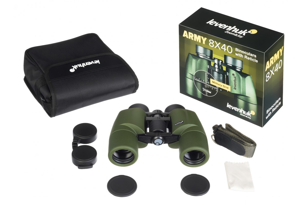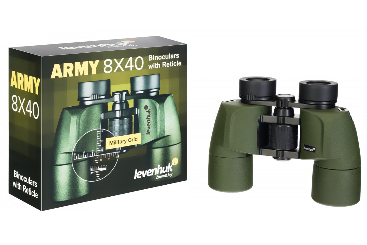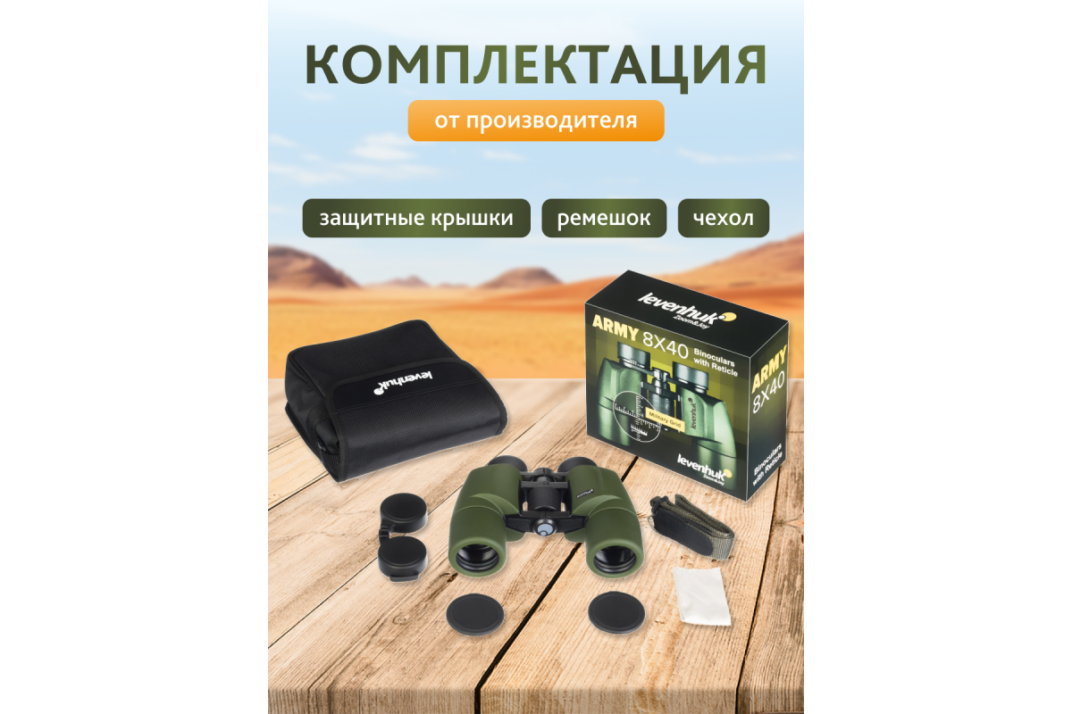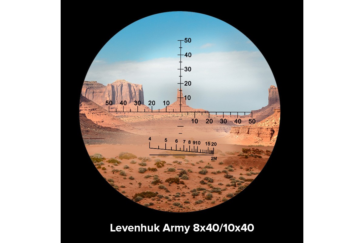 Представляем Levenhuk Army 8x40 с сеткой – бинокль, в котором предусмотрено все необходимое для эффективных наблюдений в полевых условиях. Он отлично проявит себя на охоте и рыбалке, в многодневном походе и на тактической игре. В одном из окуляров прибора есть две измерительные шкалы, с помощью которых можно определять несколько параметров: дистанцию до наблюдаемого объекта, его высоту, углы (вертикальные и горизонтальные). Еще одно преимущество бинокля – широкое поле зрения: одним взглядом можно окинуть протяженную область. Это особенно удобно, если вы наблюдаете за движущимися целями: группами людей, автотранспортом и проч.