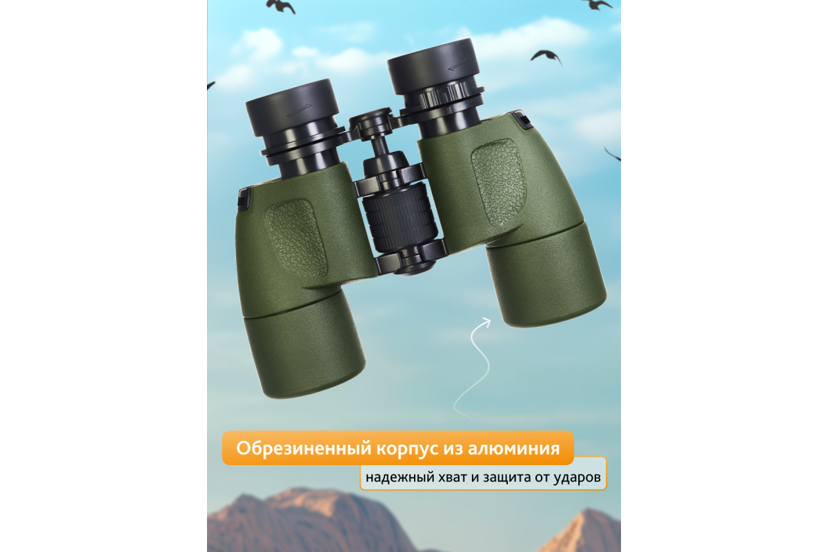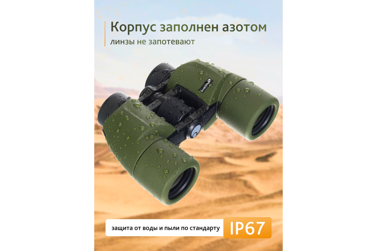 Прочный металлический корпус бинокля защищен от воды и заполнен азотом – линзы не запотеют, и картинка будет ясной в любую погоду. Есть крепление для установки на штатив (адаптер приобретается отдельно).
