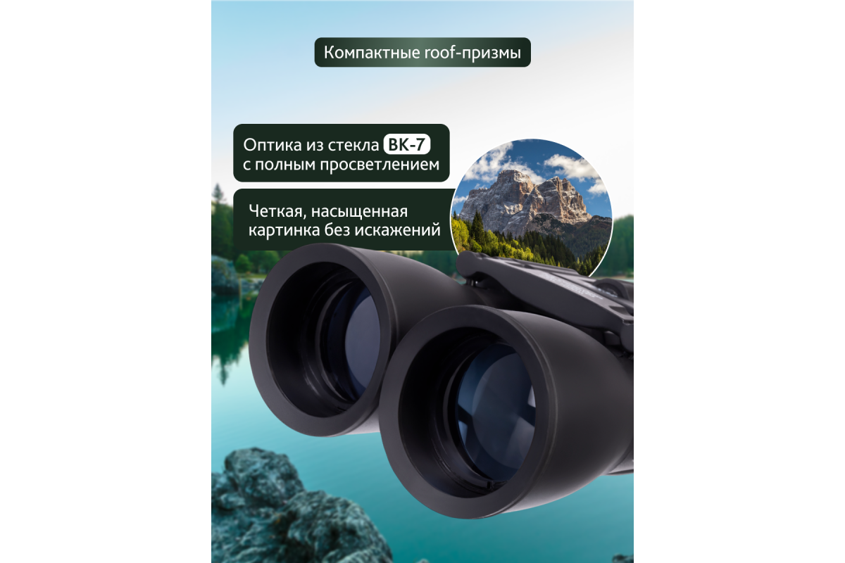 В конструкции использованы компактные roof-призмы («с крышей»), так что бинокль получился очень небольшим. На линзы нанесено полное просветляющее покрытие – оно улучшает светопропускание и повышает качество картинки. Бинокль дает четкое и контрастное изображение с правильной цветопередачей.