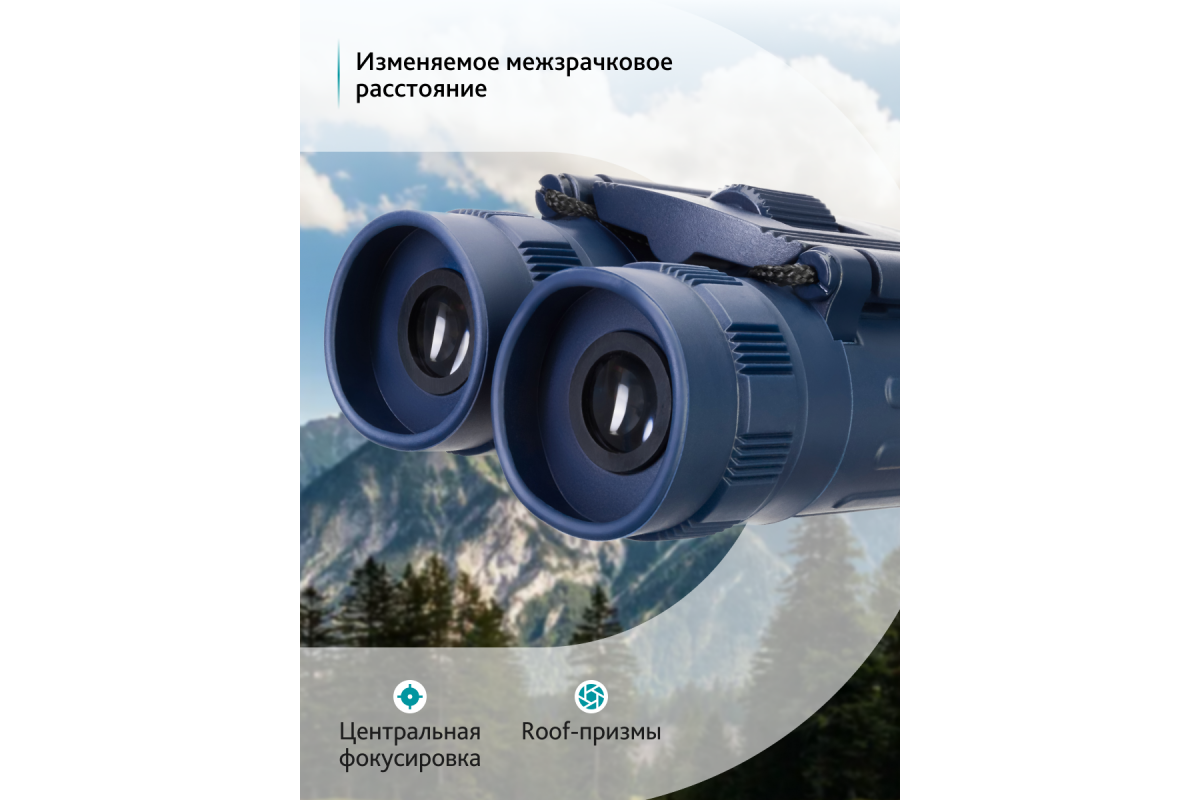 Функционал устроен классическим образом: можно выставить удобное расстояние между зрачками, также доступна центральная фокусировка. Возможности бинокля адаптированы под наблюдения с рук, поэтому даже без штатива прибор передает стабильную картинку. Корпус эргономичный, удобно и надежно лежит в руках.