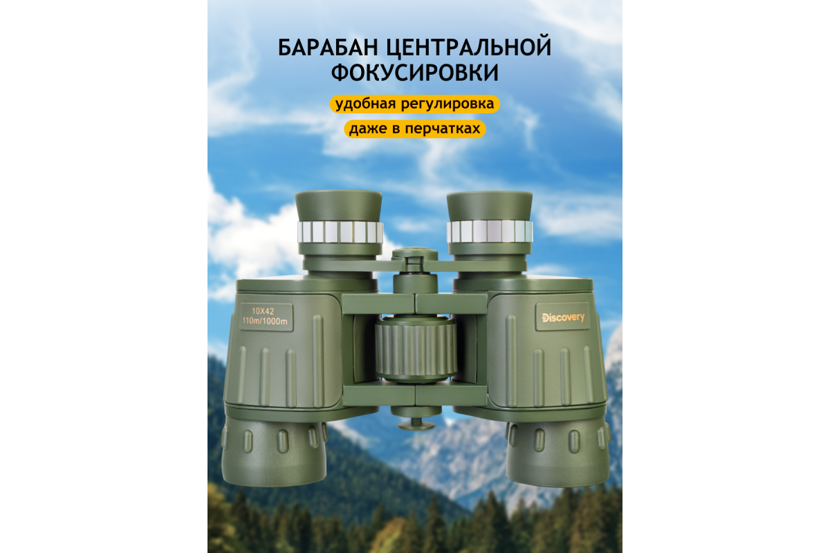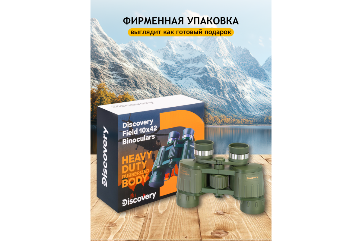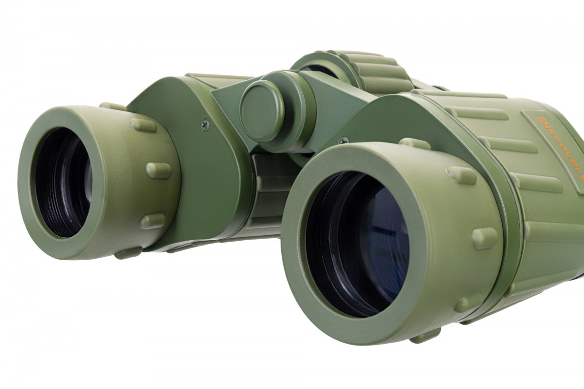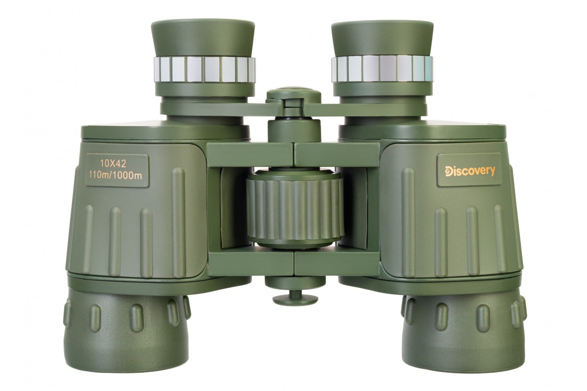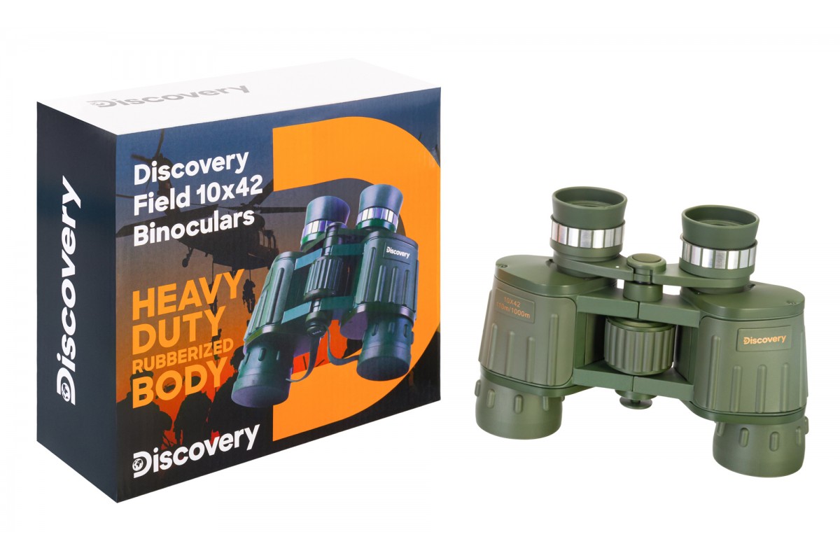 Модель Levenhuk Discovery Field 10x42 легче, чем многие другие полевые бинокли с аналогичными параметрами, так как ее корпус изготовлен пластика. Он прочный и обрезиненный – оптико-механические элементы бинокля надежно защищены от повреждений и влаги. Внешнее покрытие повышает надежность хвата благодаря своей рифленой поверхности. Объективы наводятся на резкость одновременно с помощью центрального барабана, при необходимости можно скорректировать диоптрии. Для долгих наблюдений бинокль можно установить на штатив: в конструкции предусмотрено гнездо стандартного диаметра.