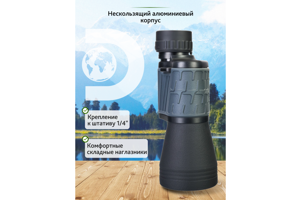 Металлический корпус – надежная защита оптических элементов от любых случайных повреждений. Он долговечный и прочный, а также дополнен фактурными боковыми вставками для улучшения захвата. При необходимости бинокль можно устанавливать на стандартный штатив 1/4 дюйма.