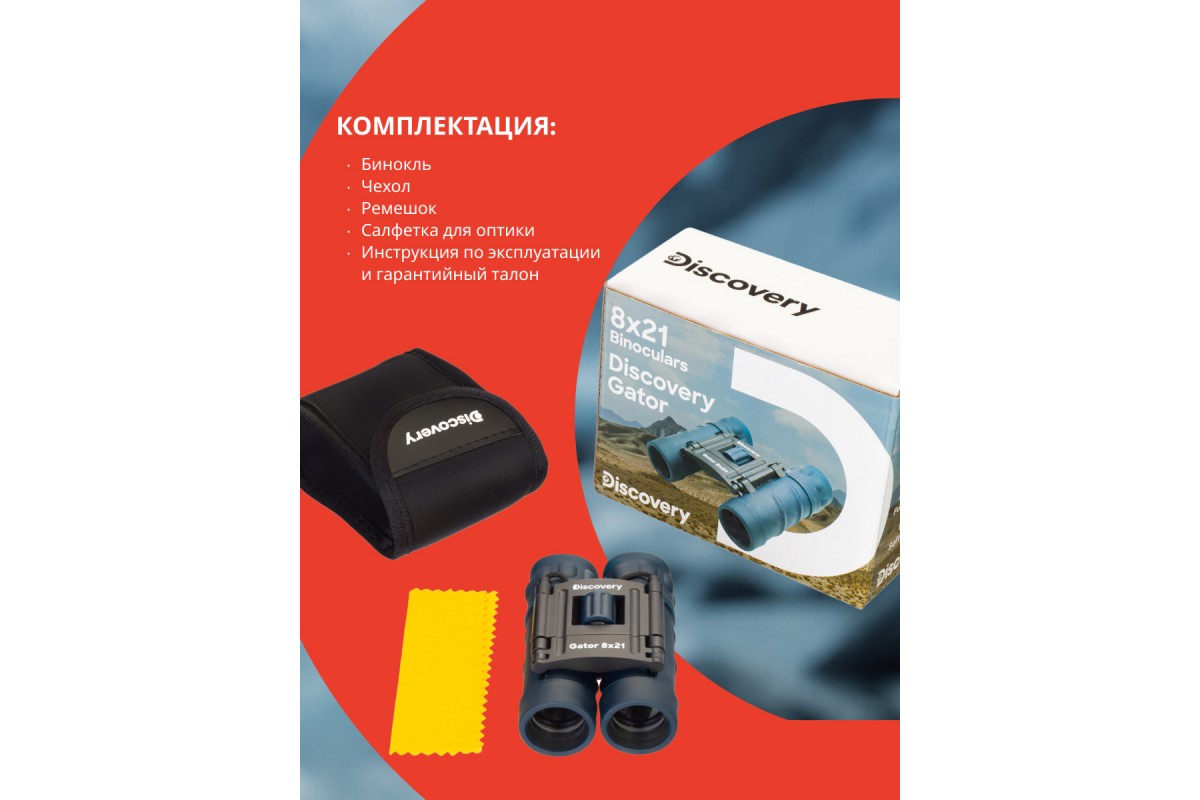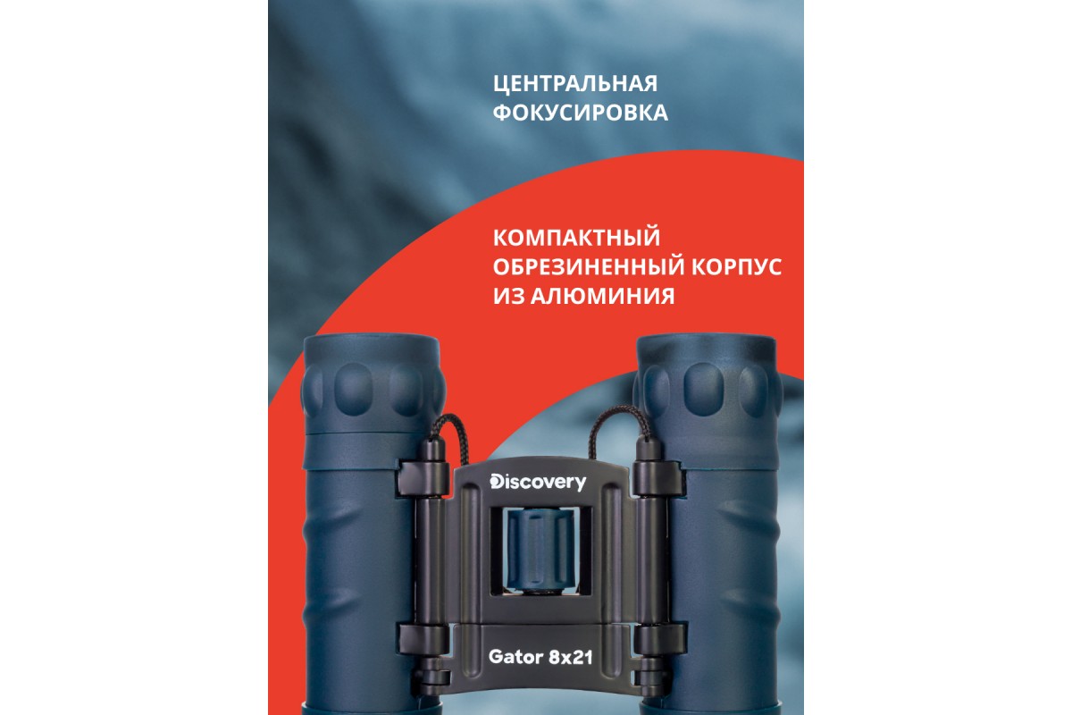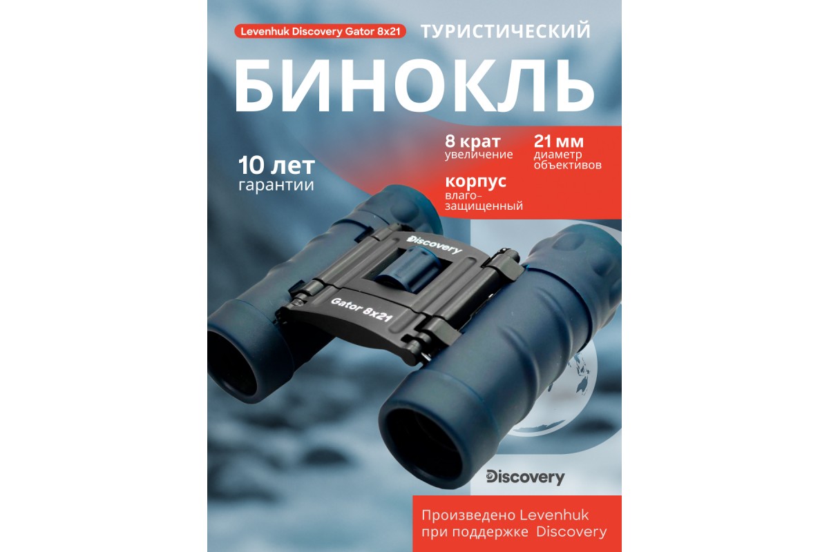 Перед вами туристический бинокль Levenhuk Discovery Gator 8x21, который удобно брать с собой на прогулки и в путешествия. Он небольшой и легкий, без труда помещается в рюкзак или сумку и не обременяет в дороге. Также он дает 8-кратное увеличение, что позволяет детально рассматривать сильно удаленные объекты, и обеспечивает хороший обзор. Поля зрения оптики вполне хватает для наблюдений за движущимися объектами, например спортсменами на стадионе или летящими в небе птицами.