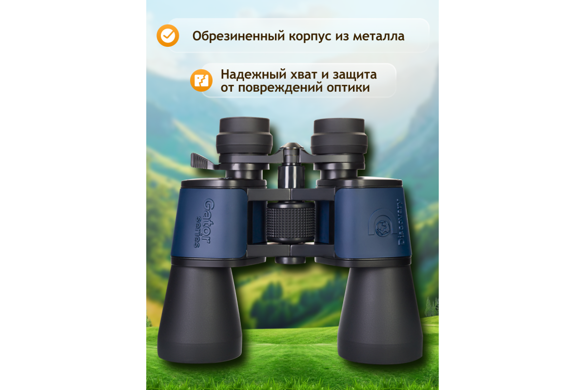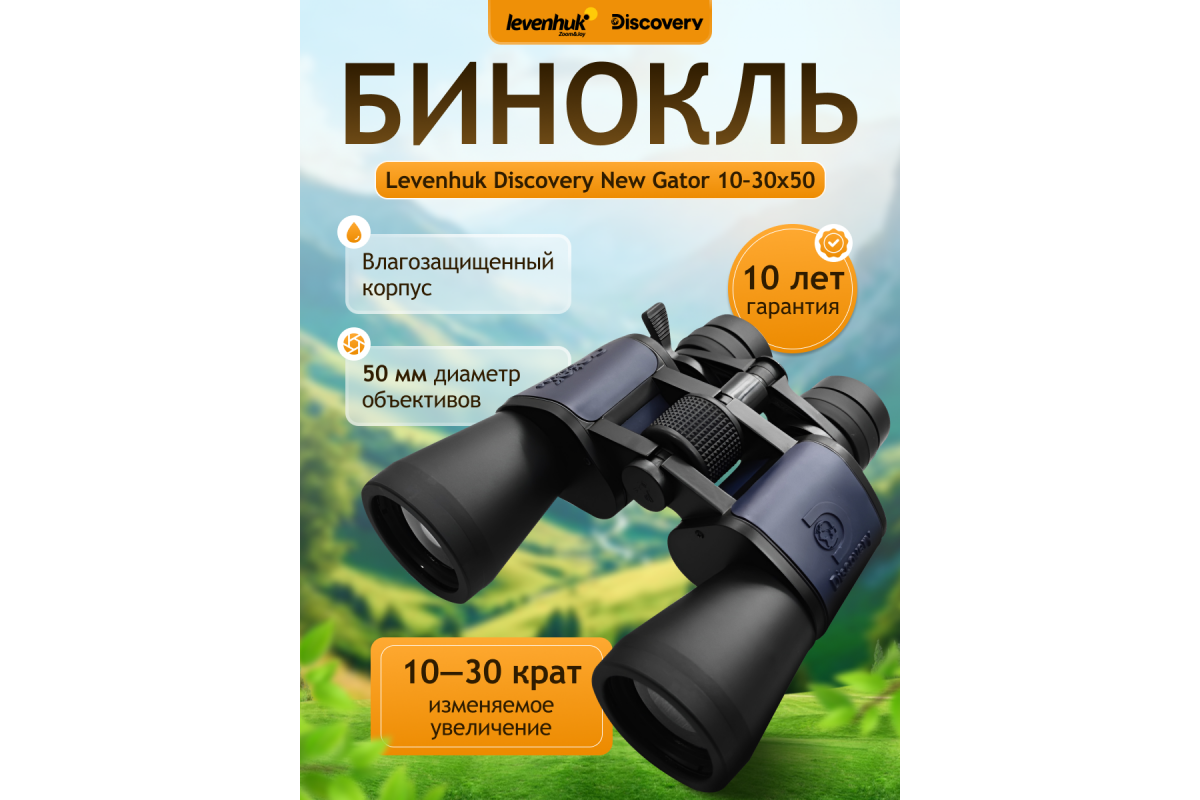 Бинокль Levenhuk Discovery New Gator 10–30x50 пригодится и на охоте, и в походе, и даже на прогулке по лесу, ведь его увеличение можно изменять. Необходимо лучше рассмотреть далекое строение на другом берегу реки? Тут поможет 30-кратное приближение – получится увидеть мельчайшие детали объекта. Высоко в небе летит птичий клин? Сокращение увеличения до 10х обеспечит обзор, комфортный для наблюдений за движущимися объектами. Все эти возможности доступны в бинокле Levenhuk Discovery New Gator 10–30x50.