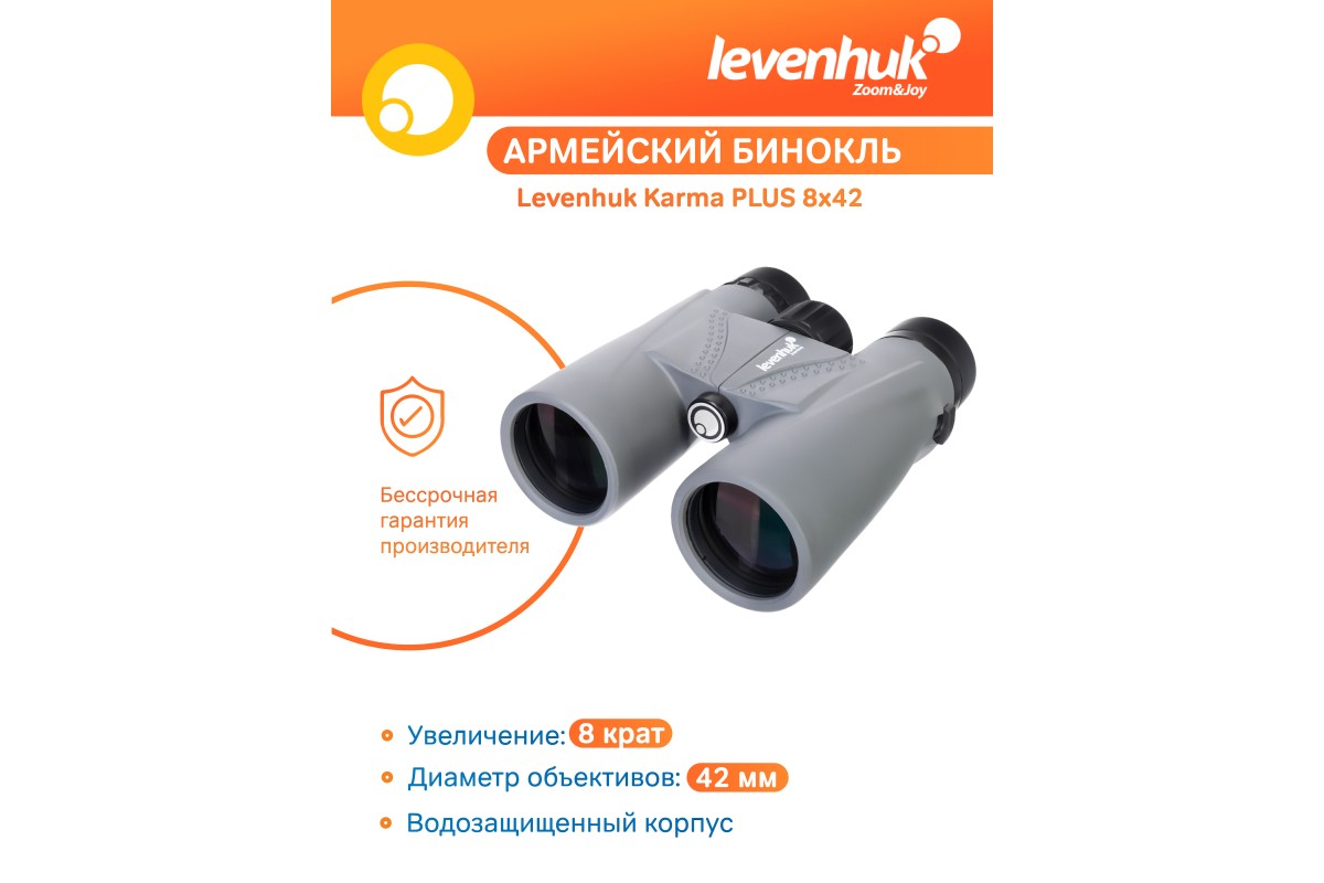 Levenhuk Karma PLUS 8x42 – это гармоничное сочетание надежности классического полевого инструмента и компактности туристического бинокля. Восьмикратное увеличение удобно при наблюдениях с рук – вам не придется использовать штатив, чтобы получить четкую картинку. Обрезиненный корпус удобно ложится в руки. Бинокль полностью водонепроницаем, так что его можно использовать в самых сложных полевых условиях.