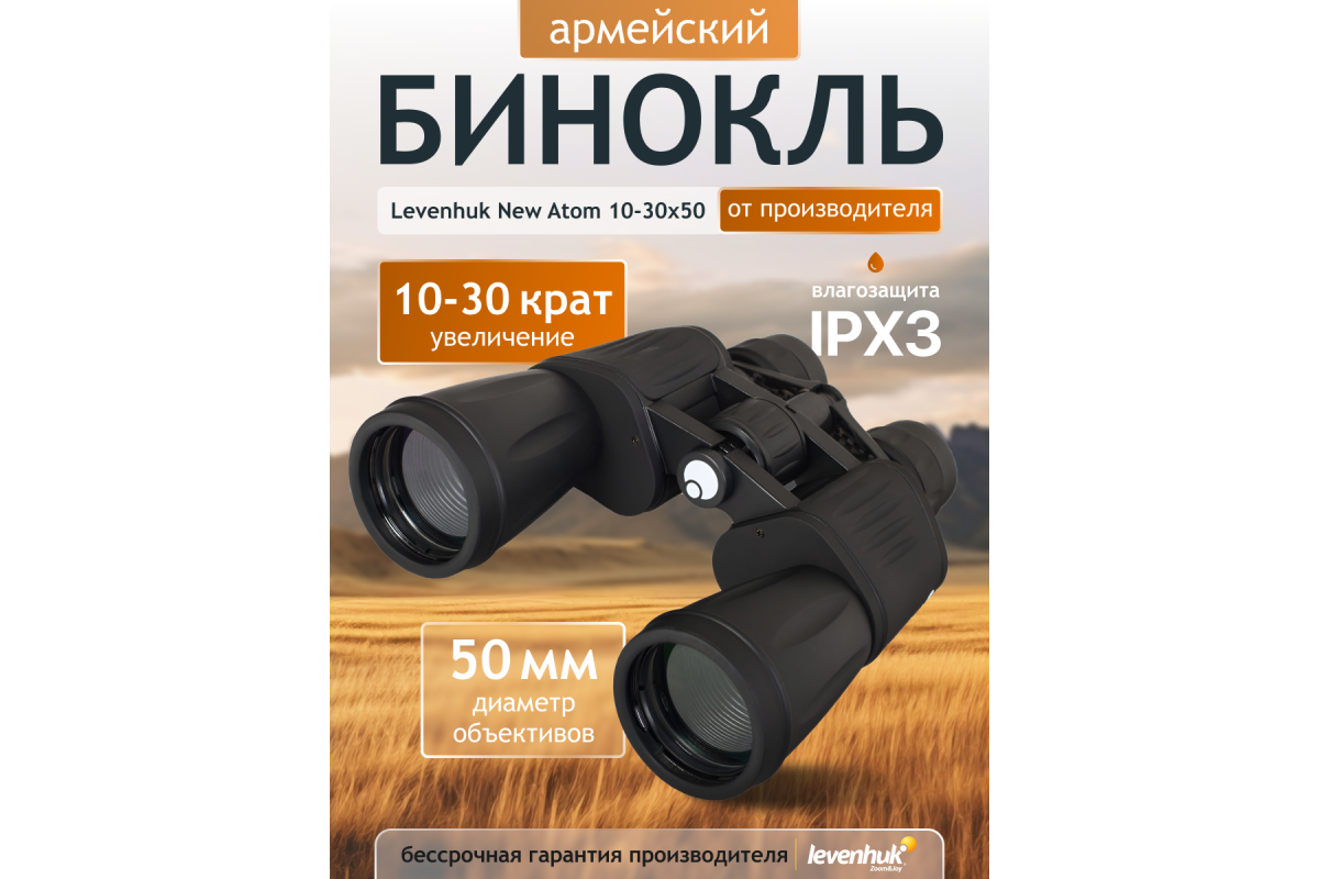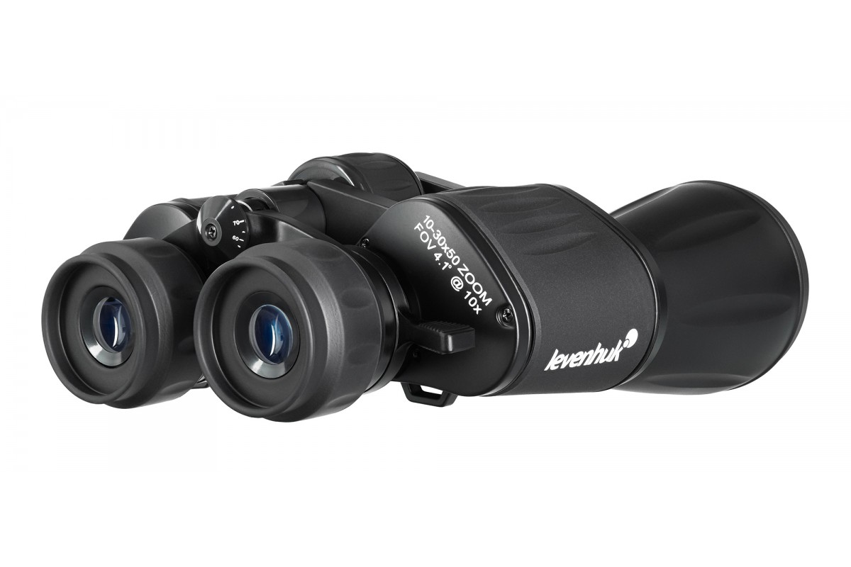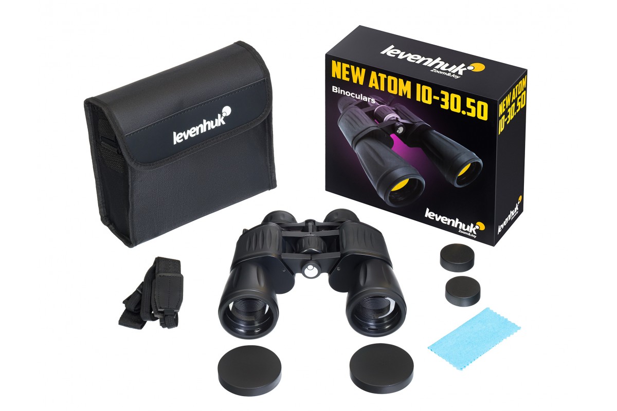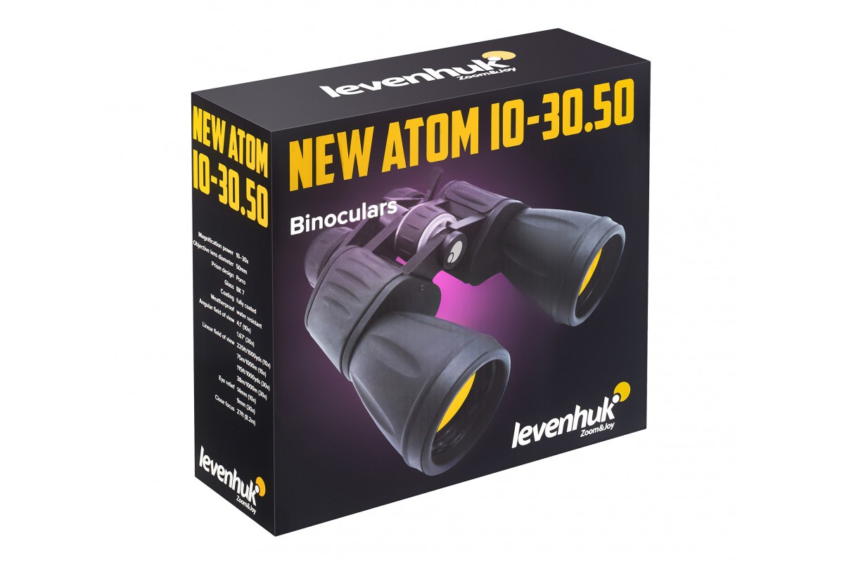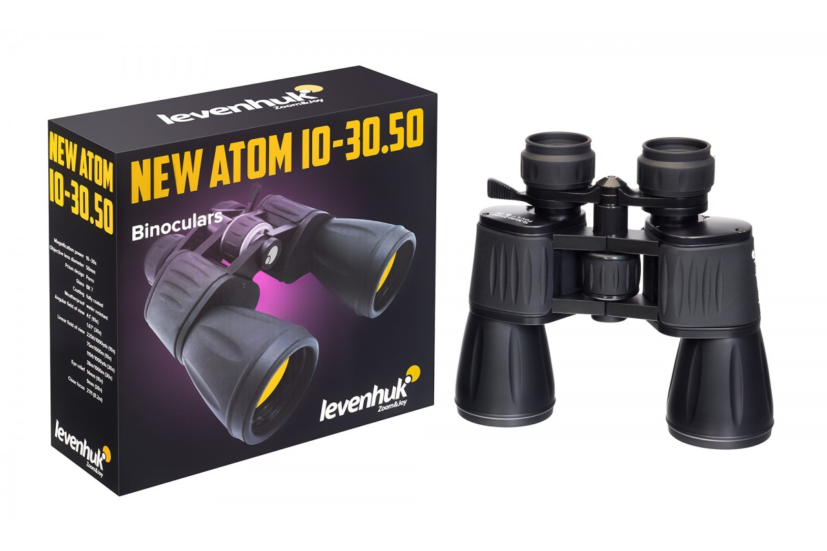 Бинокль Levenhuk New Atom 10–30x50 оснащен зумом (переменной кратностью) 10–30x, что выделяет модель из линейки. Оптическая схема при этом классическая, на Порро-призмах. Апертура прибора равна 50 мм, линзы изготовлены из боросиликатного крона марки BK-7, на который нанесено полное просветляющее покрытие. Базовое увеличение прекрасно подойдет для небольших дистанций наблюдения, а с помощью зума можно как следует рассмотреть мелкие объекты.