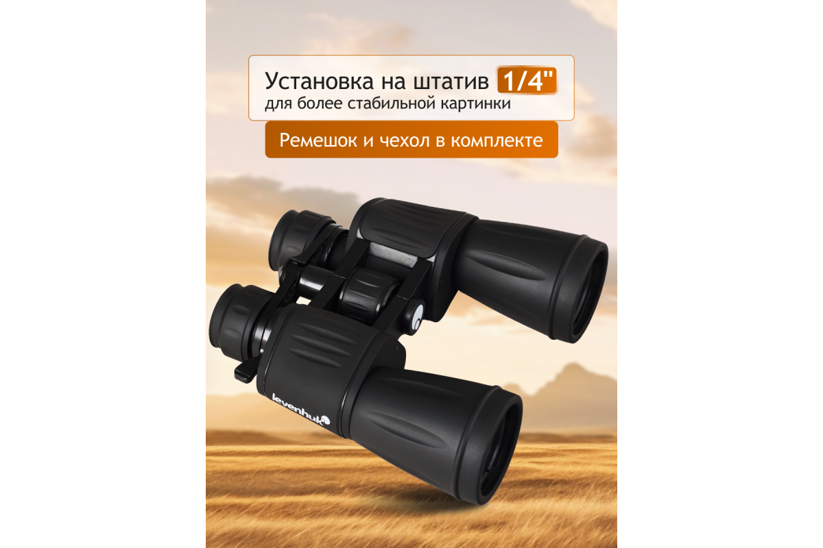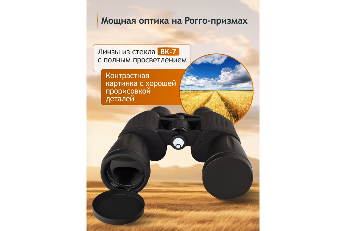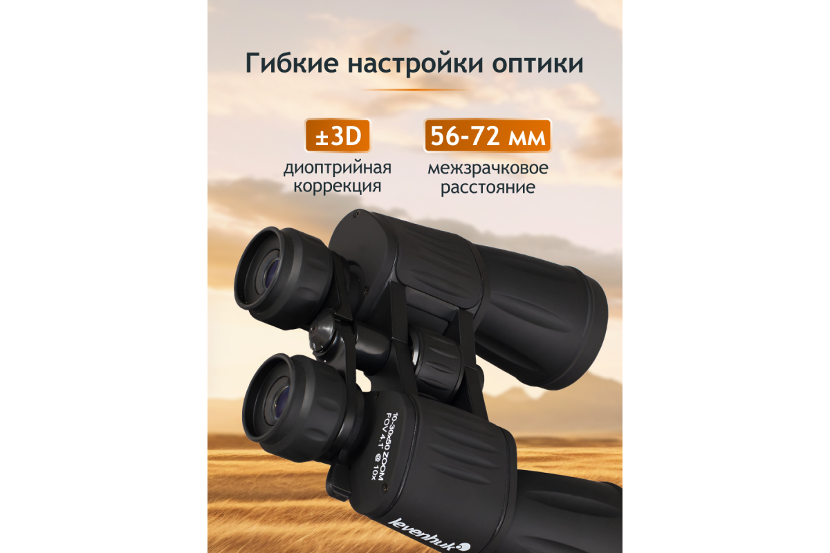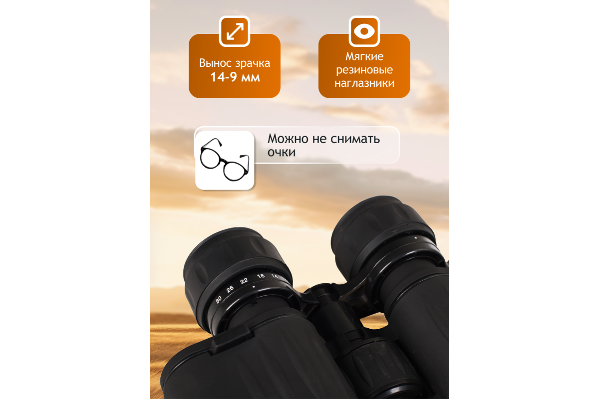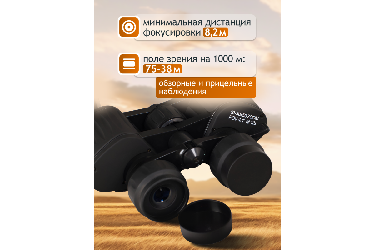 • Бинокль классического форм-фактора с переменной кратностью 10–30x, апертура 50 мм