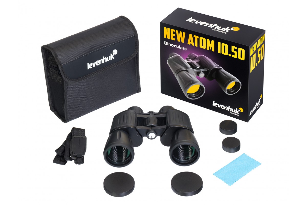 Что касается комплектации Levenhuk New Atom 10x50, то в нее входит необходимый минимум принадлежностей – чехол, защитные крышки для оптики, салфетка для ухода за оптикой и ремешок для переноски.