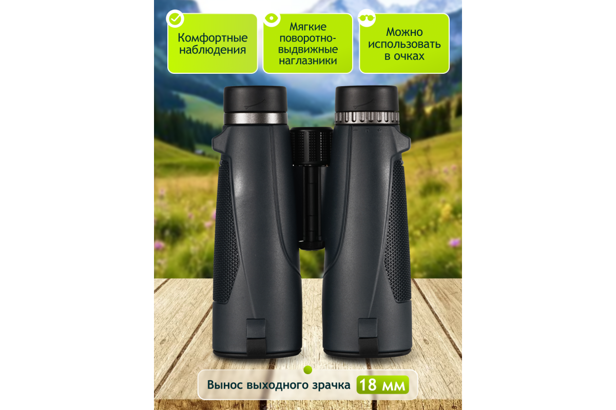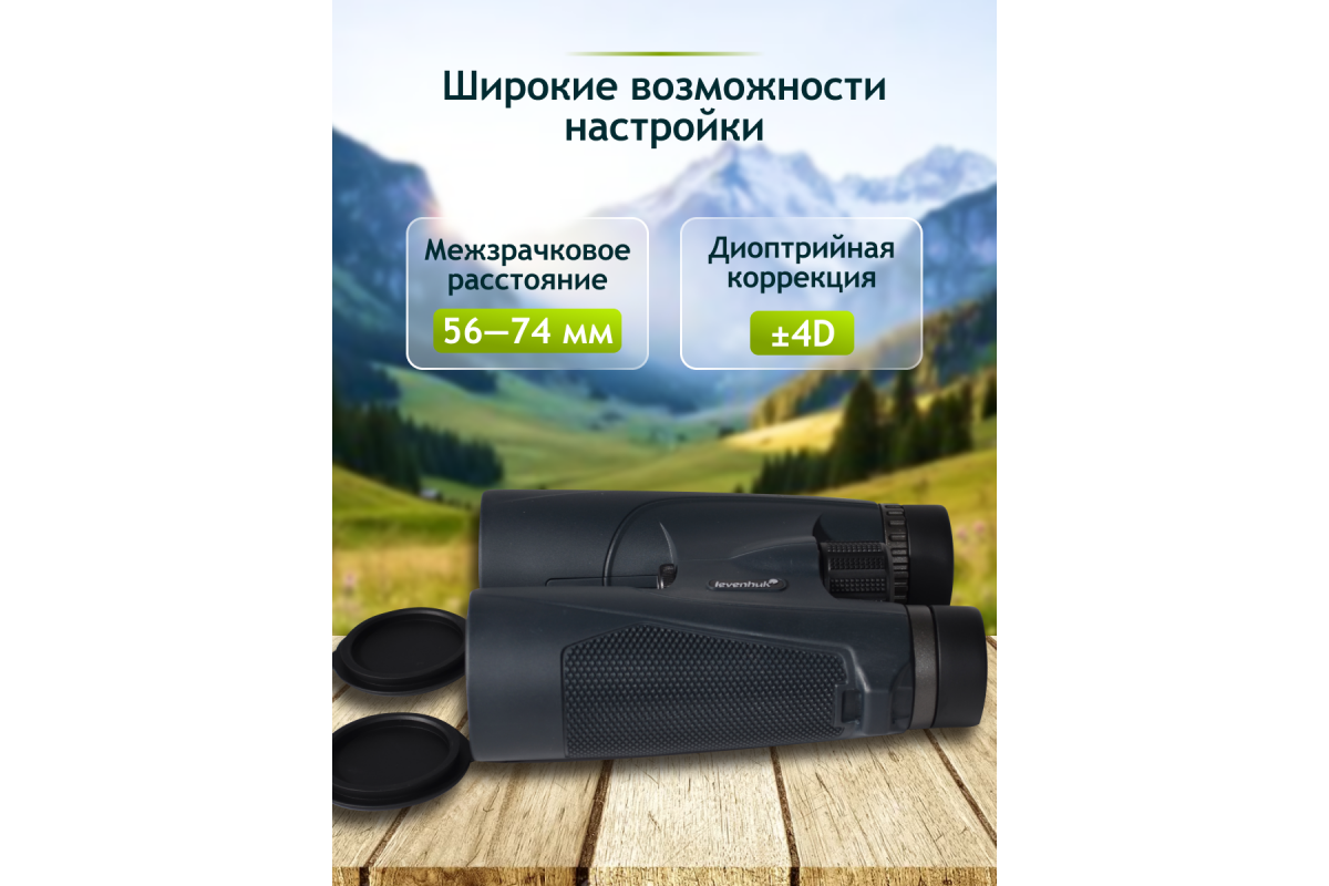 Бинокль можно установить на штатив, используя предусмотренную в корпусе резьбу стандарту 1/4" – это позволит сделать длительные наблюдения в одном направлении гораздо комфортнее. Также можно изменить межзрачковое расстояние, отрегулировав его под индивидуальные физиологические особенности в диапазоне от 56 до 74 мм. Имеется и функция диоптрийной подстройки – от –4 до +4 D.