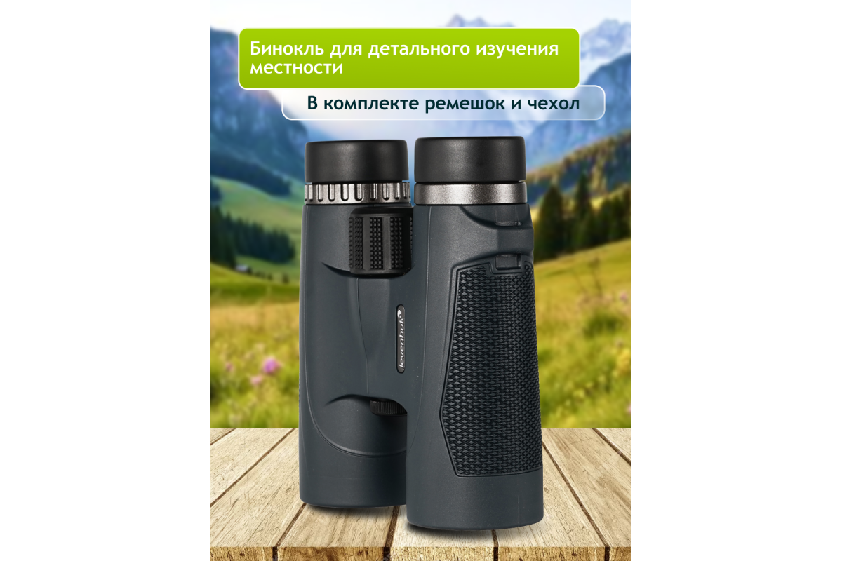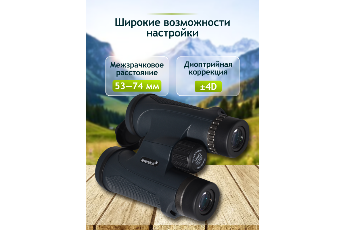 Levenhuk New Karma PLUS 12x42 имеет эргономичный дизайн и относительно небольшие размеры, его удобно переносить с собой и использовать из рук – этим прибор обязан построенной на roof-призмах оптической схеме. Корпус бинокля наполнен азотом, что защищает оптику от запотевания при скачках температуры или уровня влажности окружающей среды. Объективы состоят из трех элементов в двух группах и имеют апертуру 42 мм – это позволяет им эффективно захватывать достаточно света, чтобы пользователь мог наблюдать одинаково реалистичное и правдоподобное изображение в любых условиях. Стоит отметить и материал изготовления оптики – стекло BaK-4, имеющее высокий показатель преломления и формирующее ровный круглый выходной зрачок.